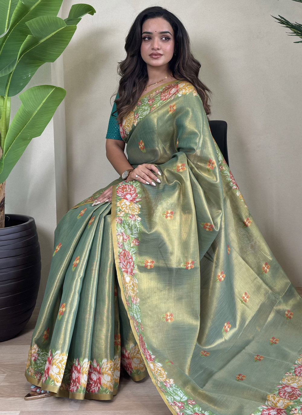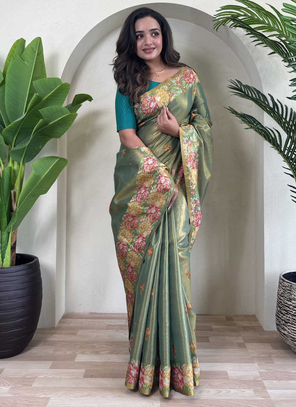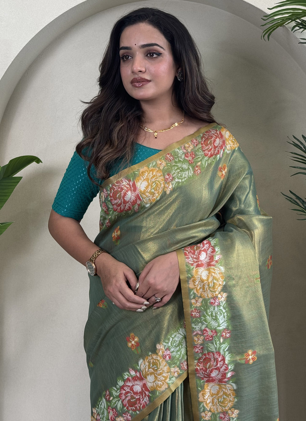 This green saree, crafted in soft tissue silk and adorned with jacquard weaving, brings out an elegant silhouette ideal for festive occasions. Its refined detailing and vibrant color make it a wardrobe essential for traditional events. Comes with matching blouse.