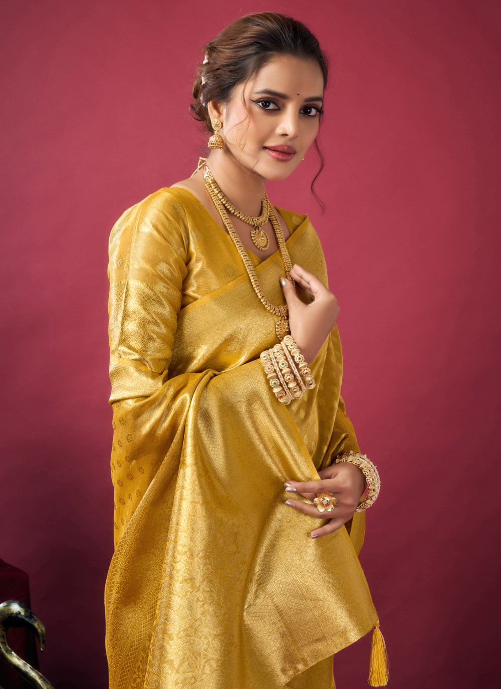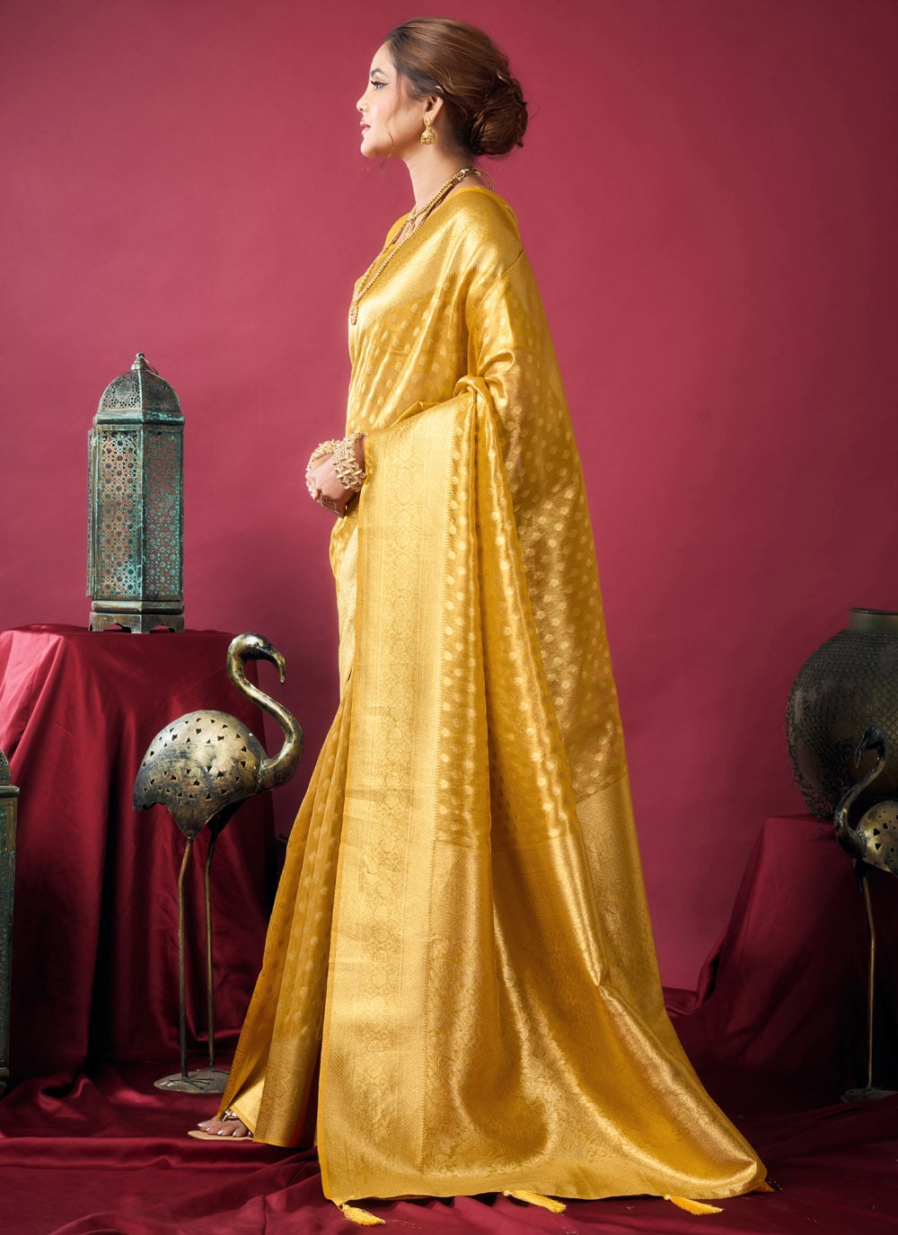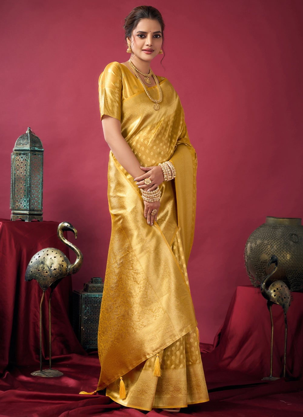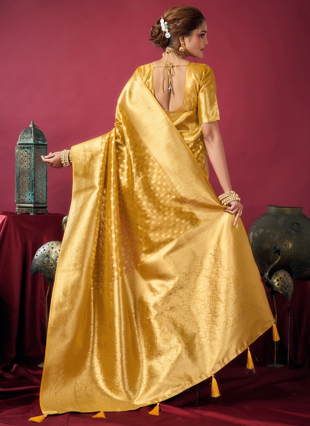 Celebrate tradition with a touch of royalty in this Gold Tissue Silk Saree with Jacquard Detailing. The metallic gold tone paired with fine weaving gives it a stylish finish. Comes with matching blouse.
