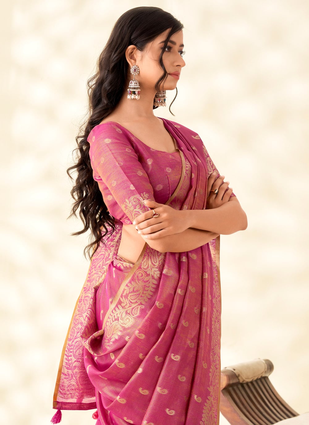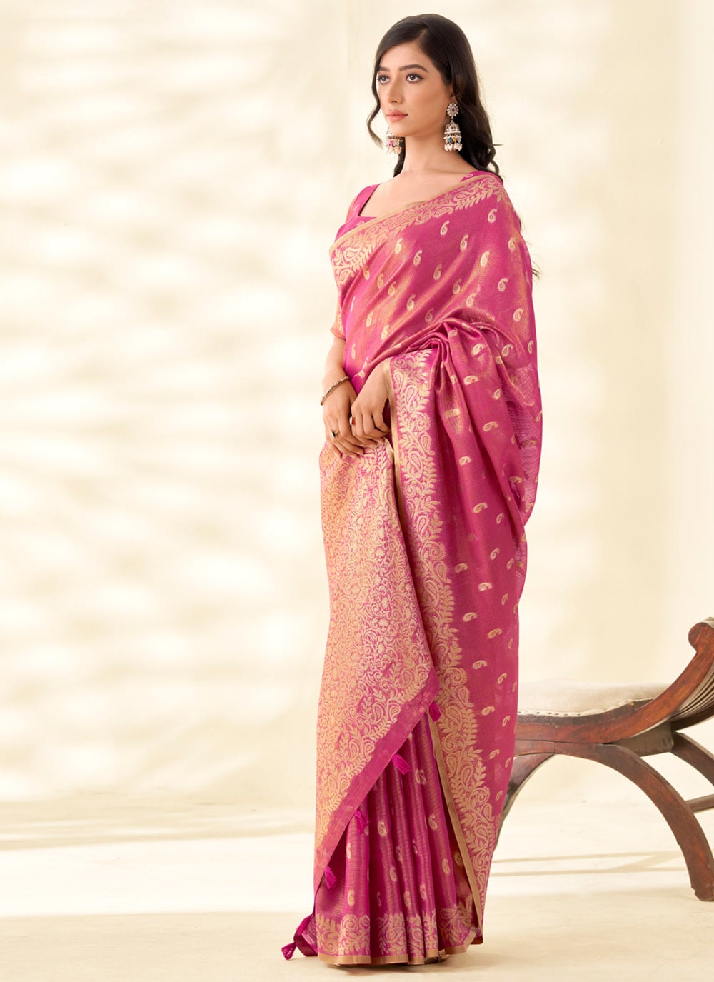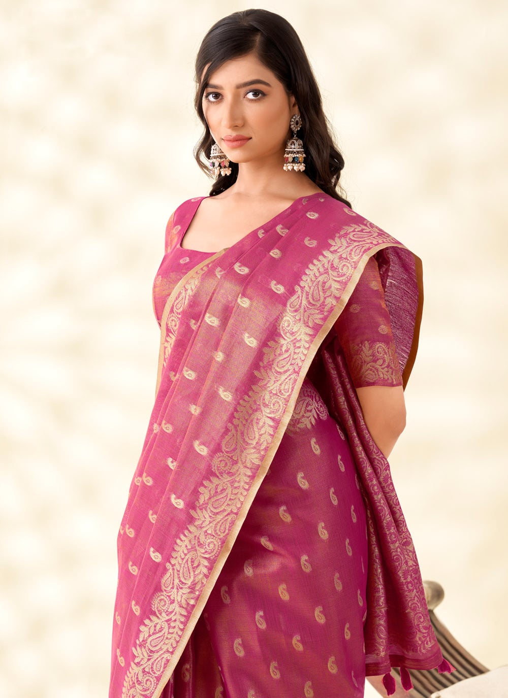 Turn heads at any event in this tissue silk saree in royal Rani pink, beautifully enriched with traditional zari woven patterns. Its vibrant hue and soft, flowing texture strike a perfect balance between classic richness and contemporary charm. Comes with matching blouse.
