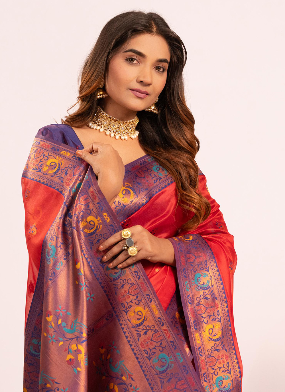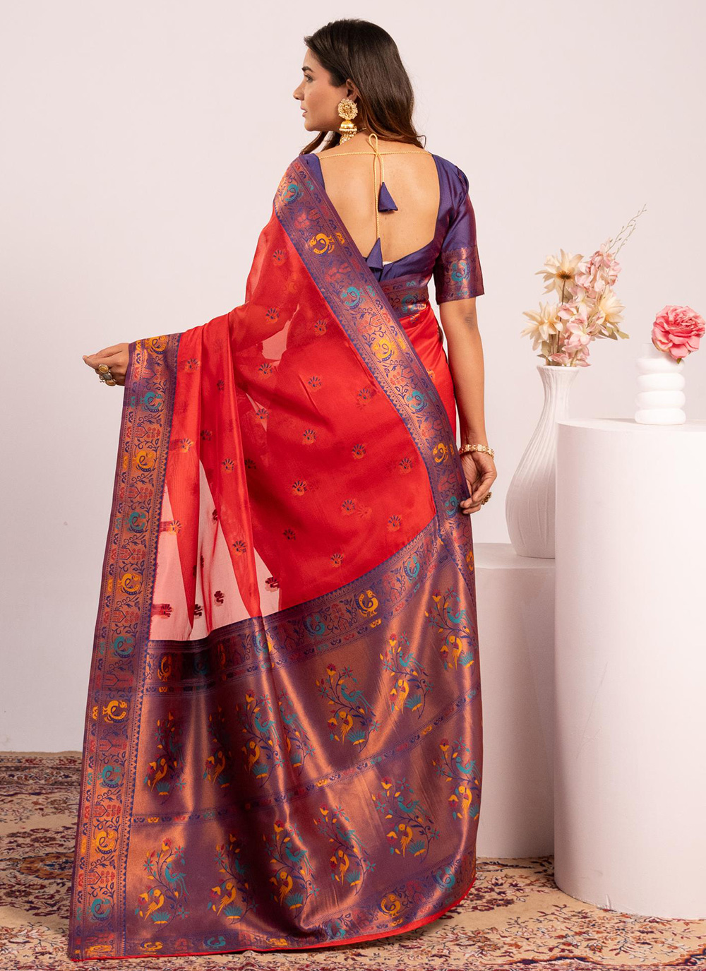 This red tissue silk saree is a beautiful reflection of timeless elegance. Featuring detailed zari weaving work, it adds a refined shimmer that enhances your ethnic look. Comes with matching blouse.