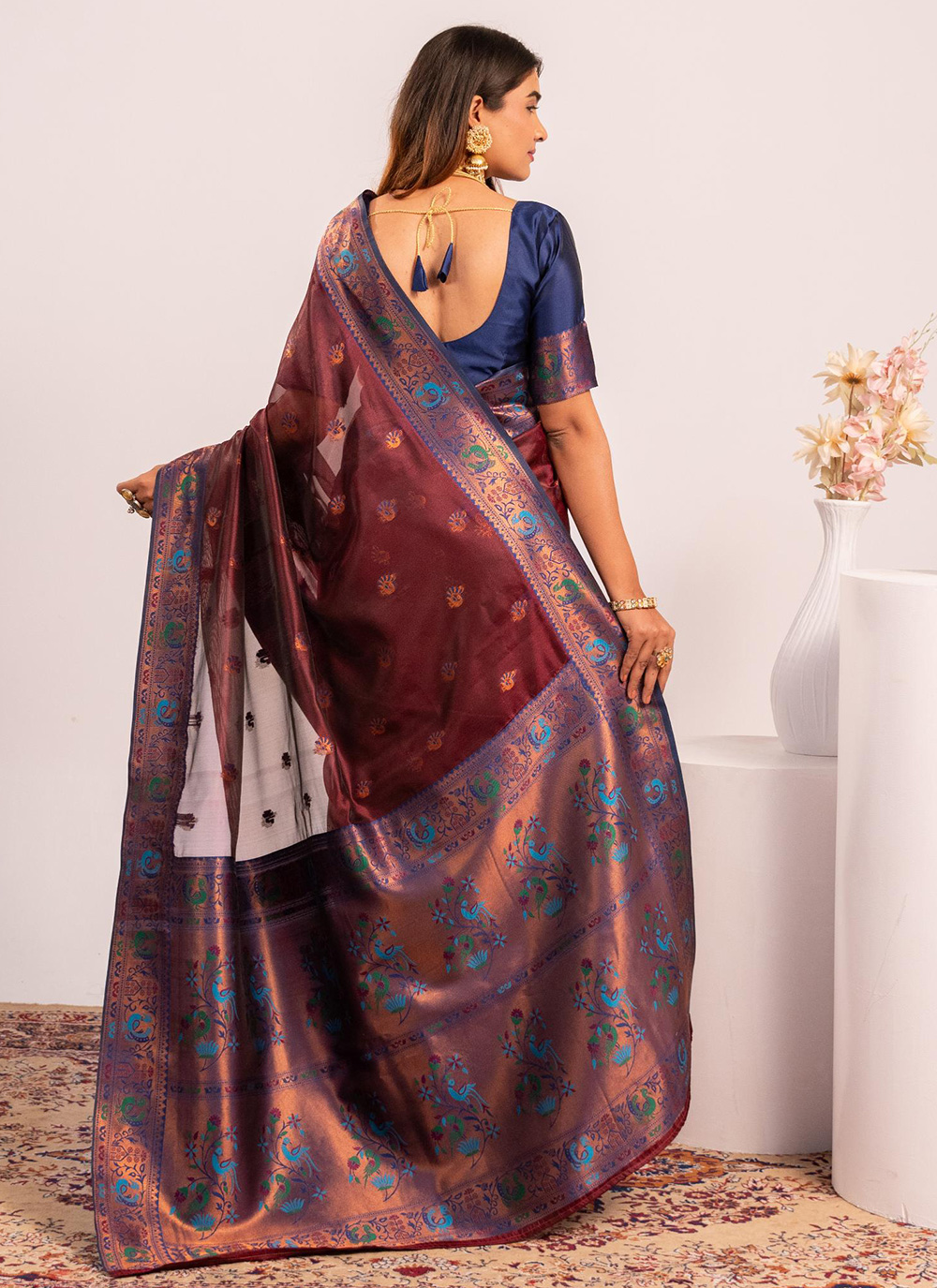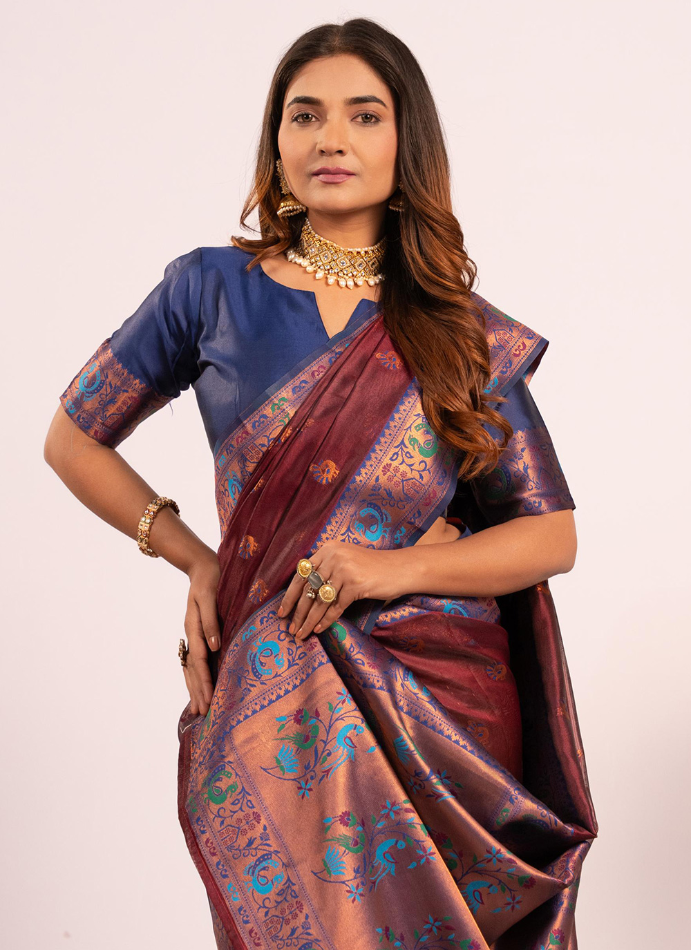 Elevate your ethnic collection with this Tissue Silk Wine Zari Weaving Contemporary Saree, designed to bring effortless grace to festive moments. The rich wine hue paired with intricate zari weaving creates a refined texture that catches light beautifully. Comes with matching blouse.