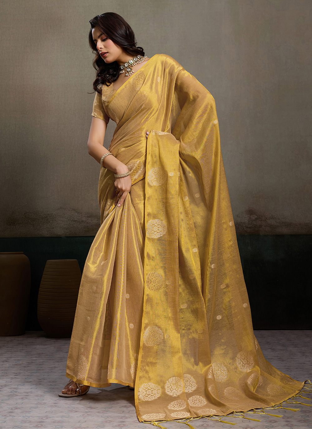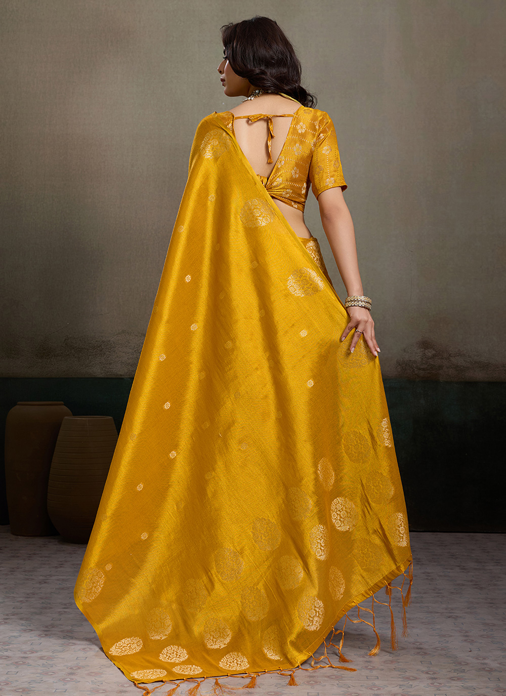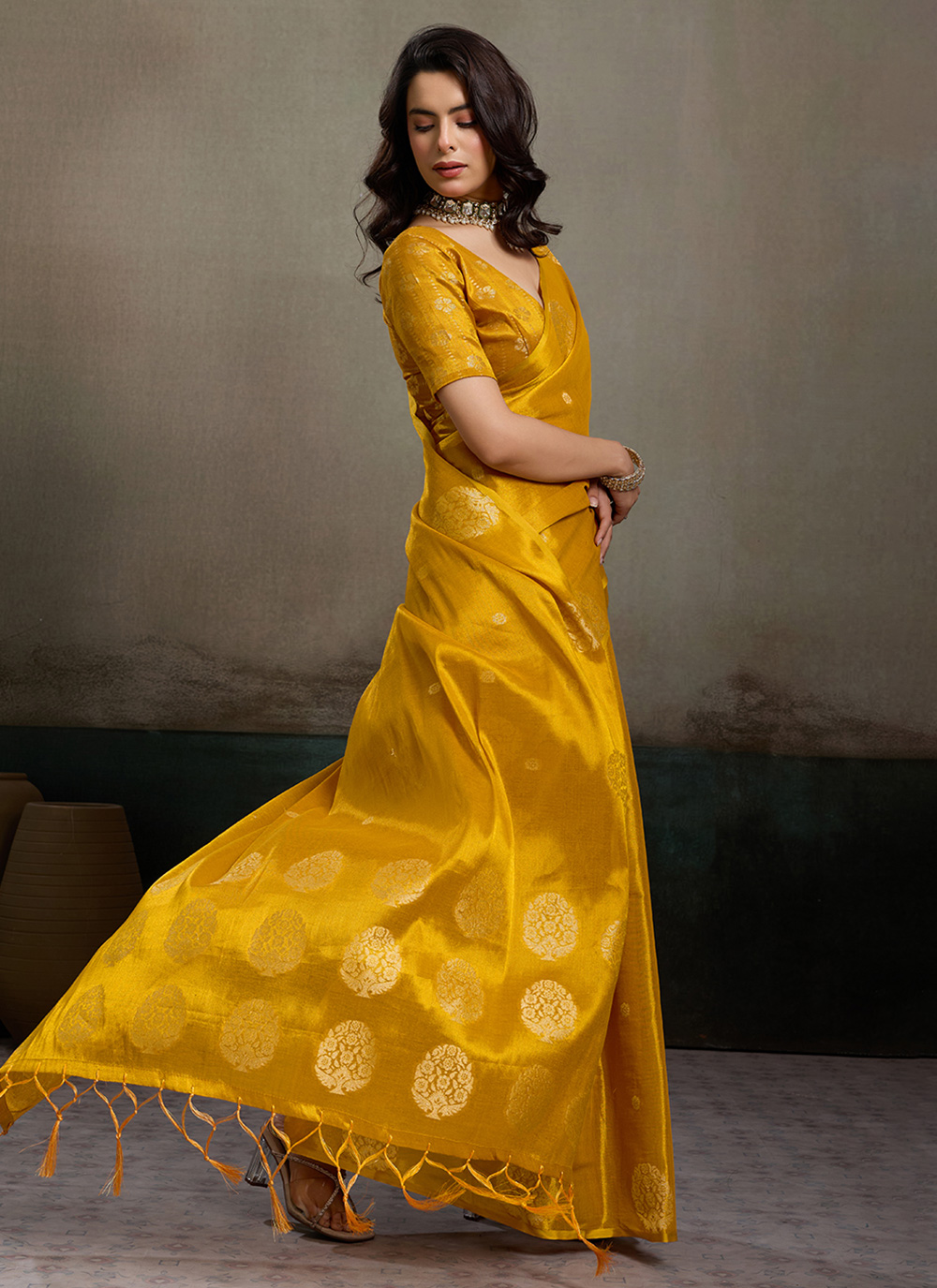 This Tissue Silk Woven Work Mustard Trendy Saree beautifully reflects a blend of modern charm and traditional weaving artistry. The elegant woven motifs highlight the soft shimmer of the silk. Comes with matching blouse.