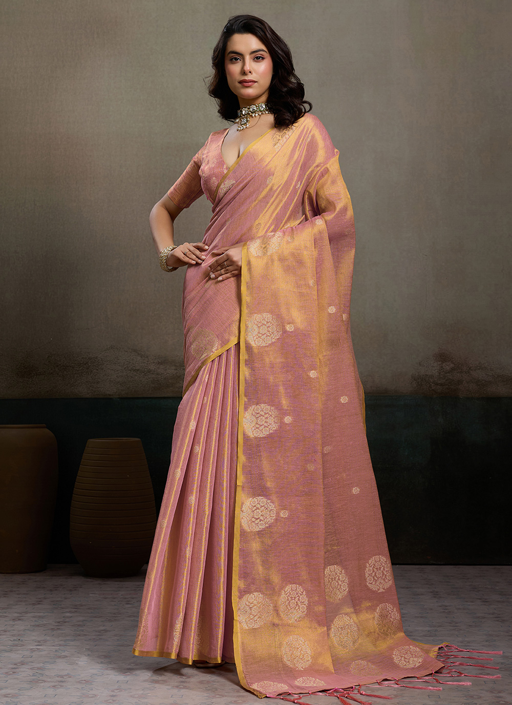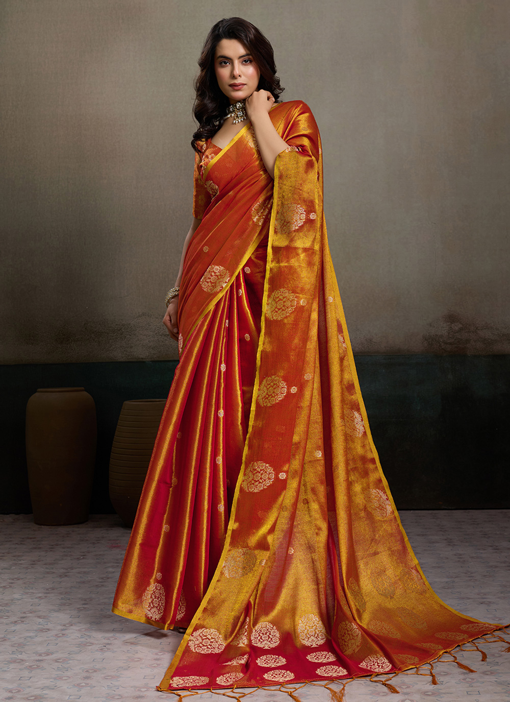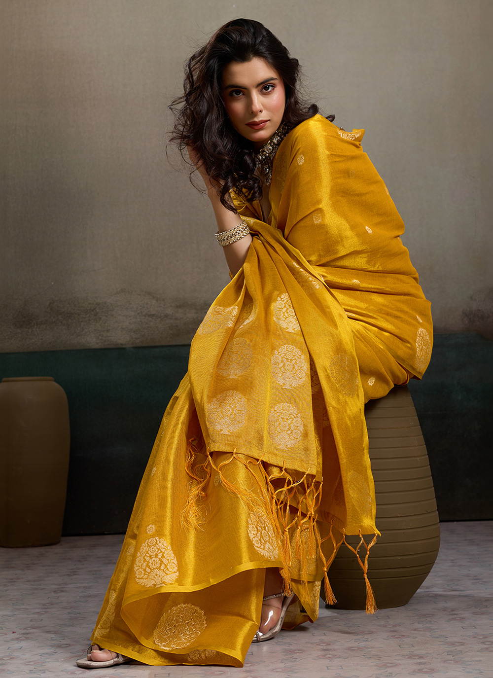 This Tissue Silk Woven Work Mustard Trendy Saree beautifully reflects a blend of modern charm and traditional weaving artistry. The elegant woven motifs highlight the soft shimmer of the silk. Comes with matching blouse.