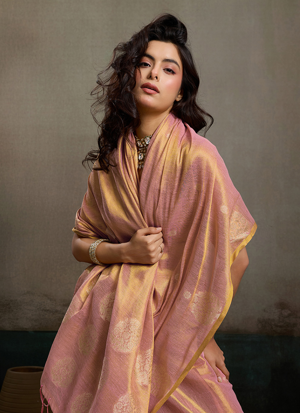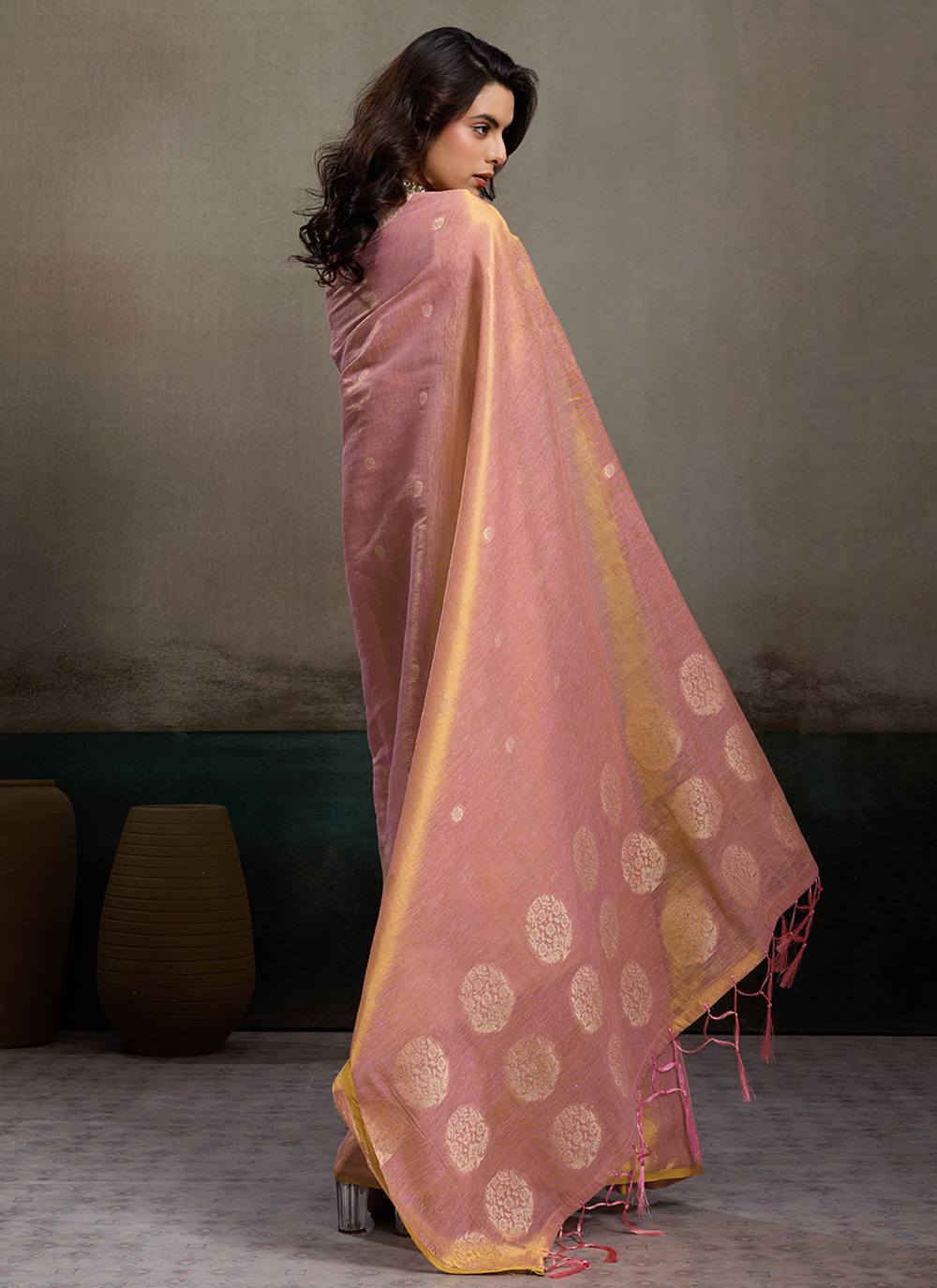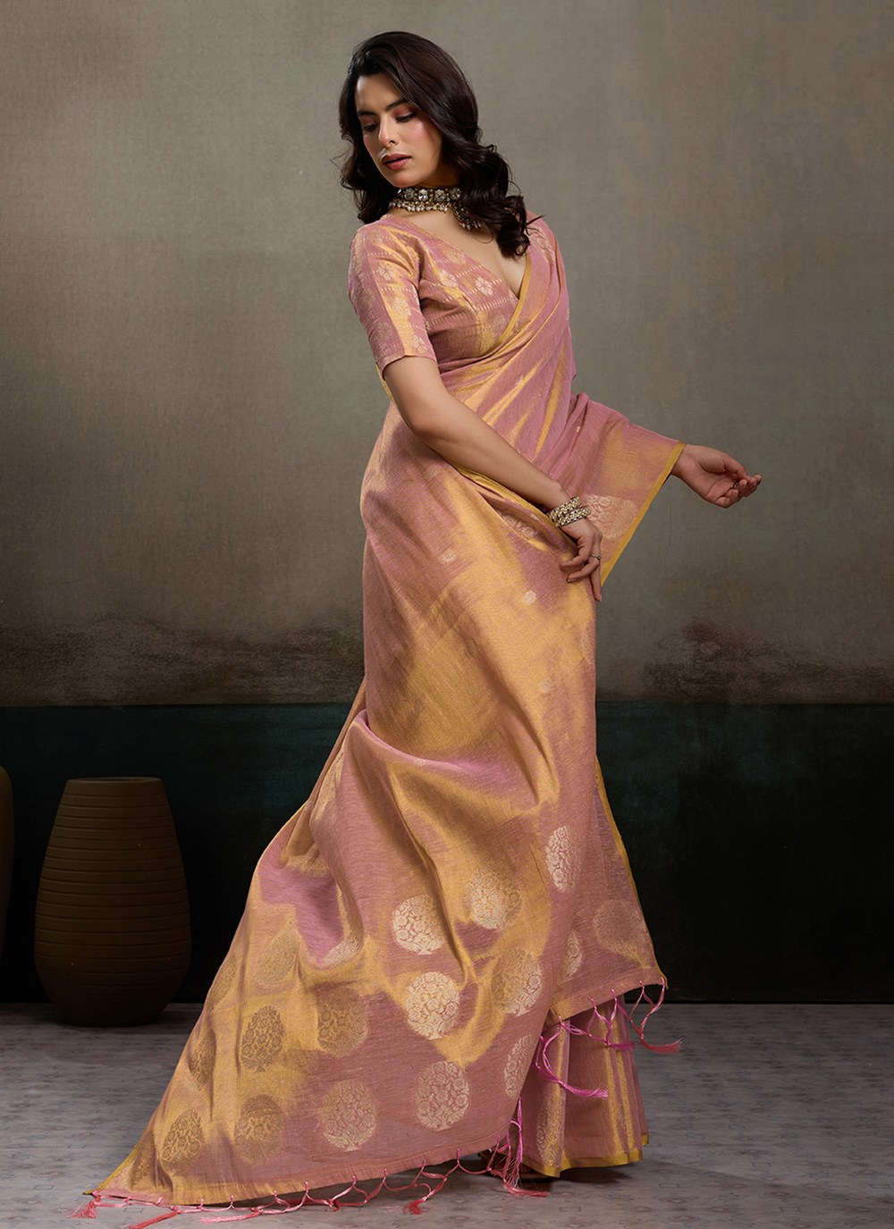 Tissue Silk Woven Work Pink Party Wear Saree presents a refined blend of vibrant color and artistic weaving. The subtle shine of the silk fabric and delicate woven motifs create a fashionable ethnic look suitable for parties and festive events. Comes with matching blouse.