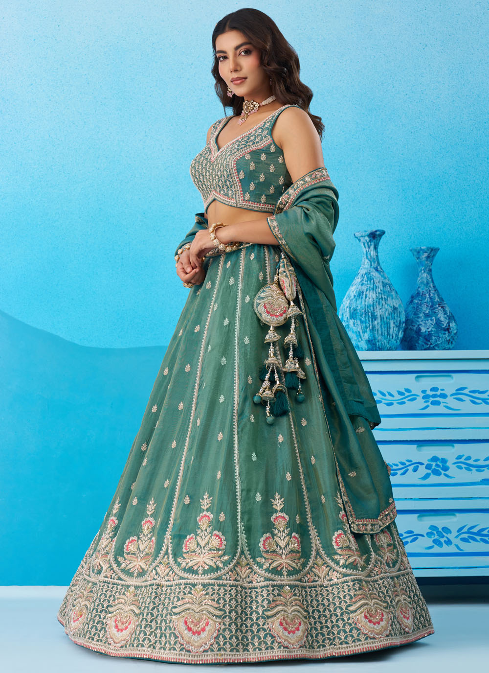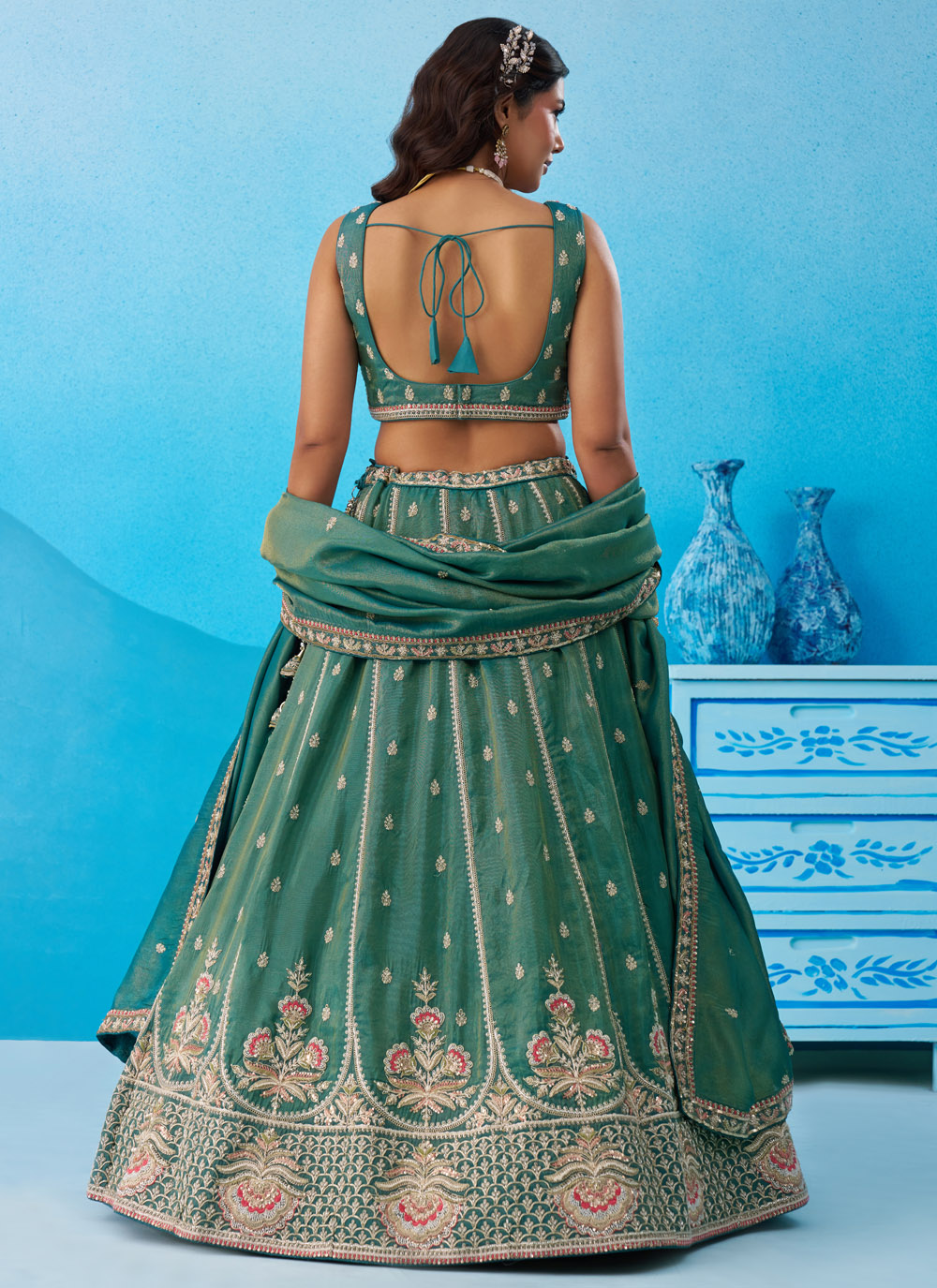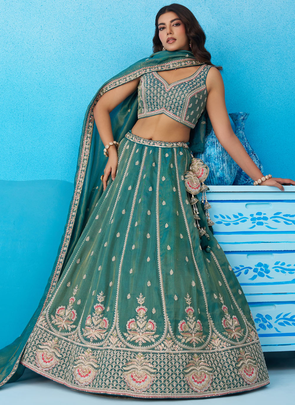 Celebrate special occasions in style with the Tissue Teal Embroidered Sequins Beads Work Trendy Lehenga Choli. The lightweight tissue fabric drapes gracefully while the intricate embroidery with beads and sequins adds sparkle and texture. Comes with matching choli and dupatta.