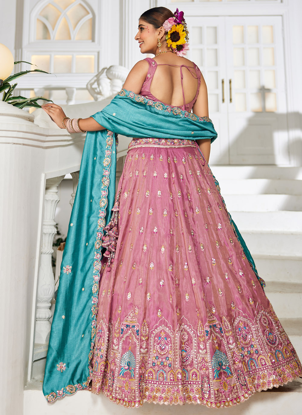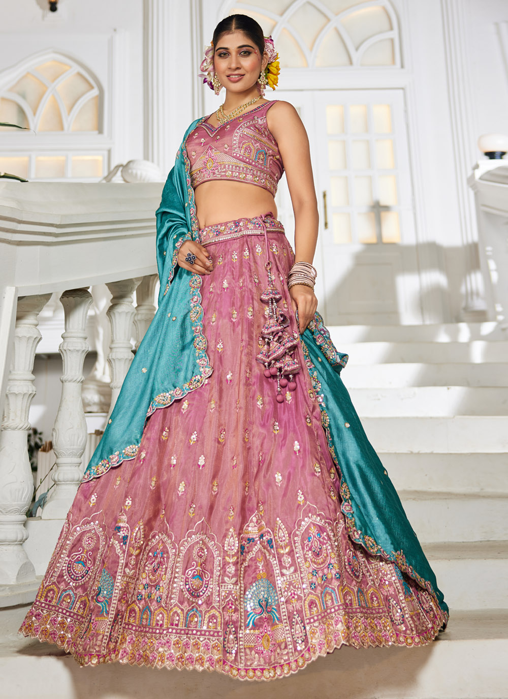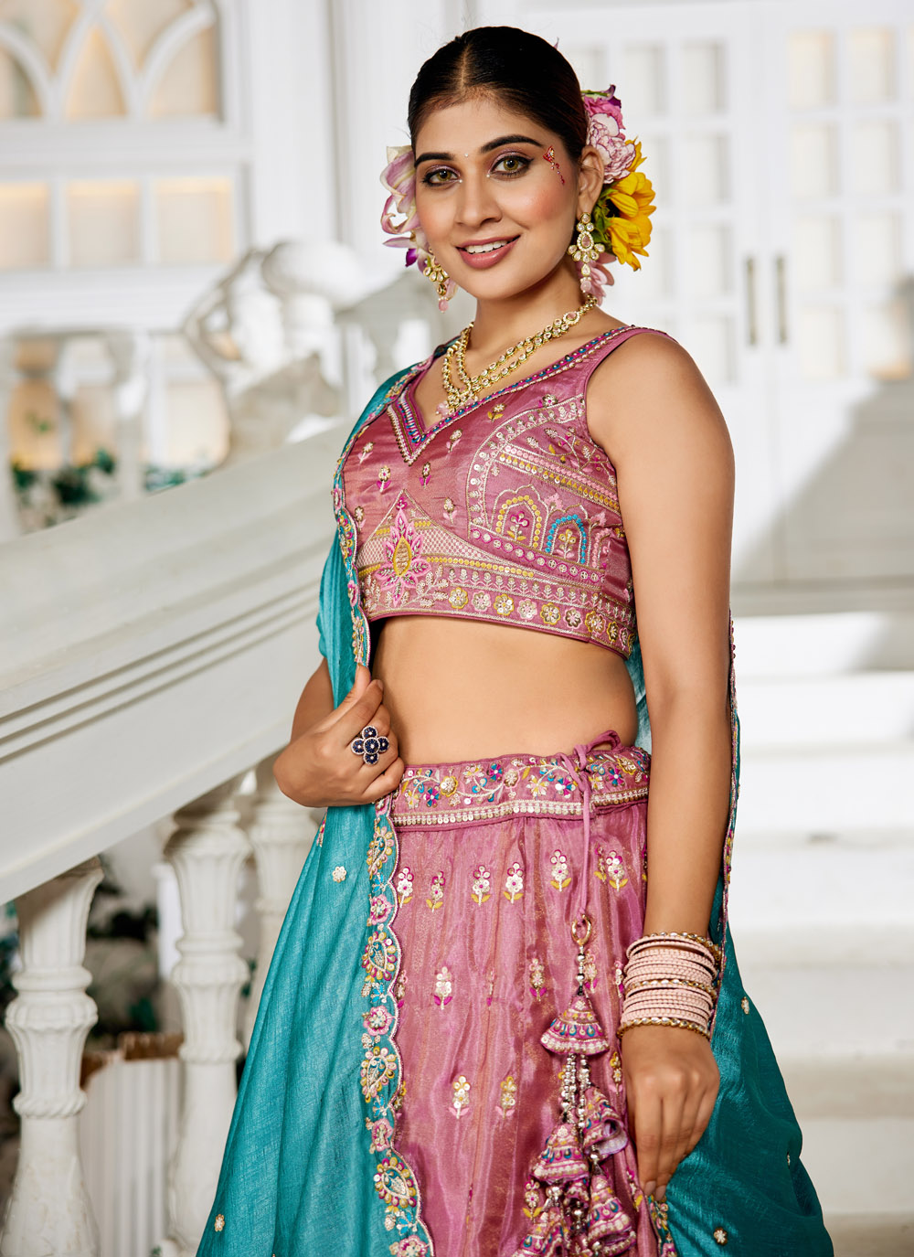 This stunning pink lehenga choli in tissue fabric is adorned with detailed thread embroidery, delicate sequins, and shimmering zari work. Designed for engagement occasions, it reflects a perfect balance of modern charm and traditional richness. Comes with matching choli and dupatta.