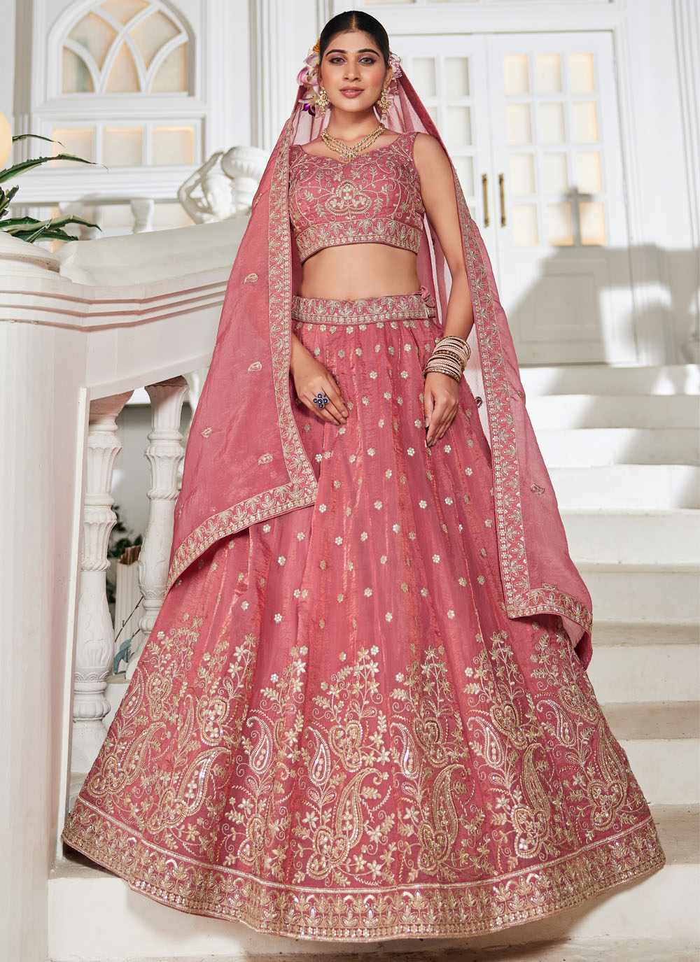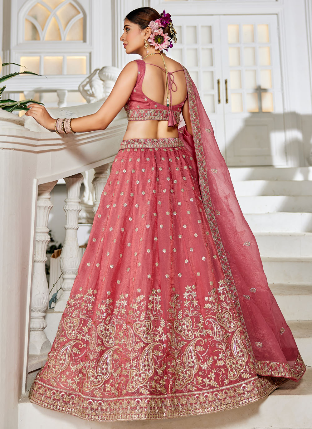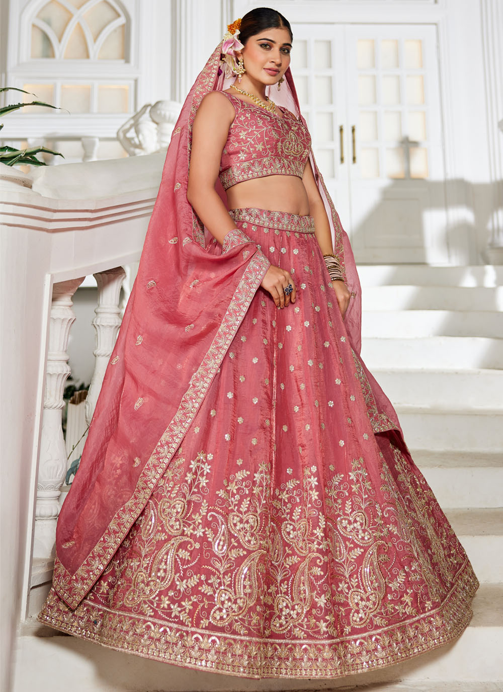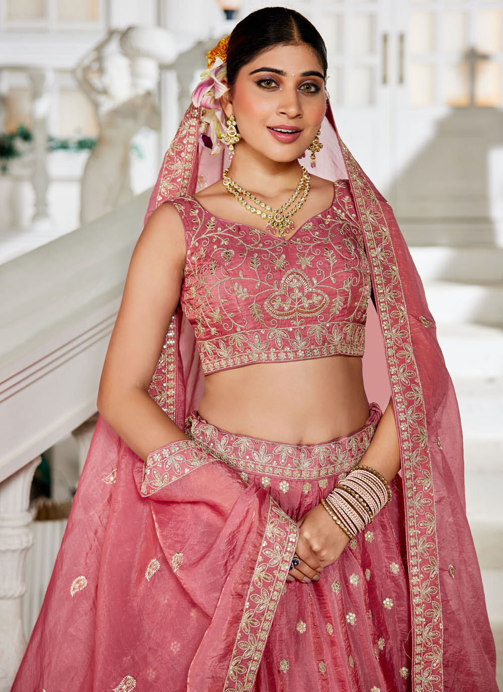 Emanate charm in this pastel pink tissue lehenga choli, beautifully embroidered with sequins and zari work. A radiant pick for pre-wedding festivities, it offers tradition with a modern edge. Comes with matching choli and dupatta.