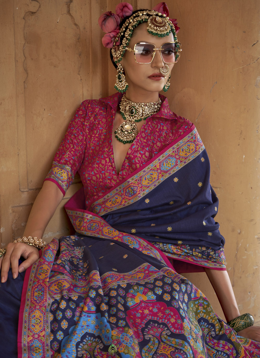 This beautifully printed navy blue silk saree reflects timeless Indian craftsmanship. The lightweight silk fabric flows gracefully, while the refined motifs add a regal charm to your festive wardrobe. Comes with matching blouse.