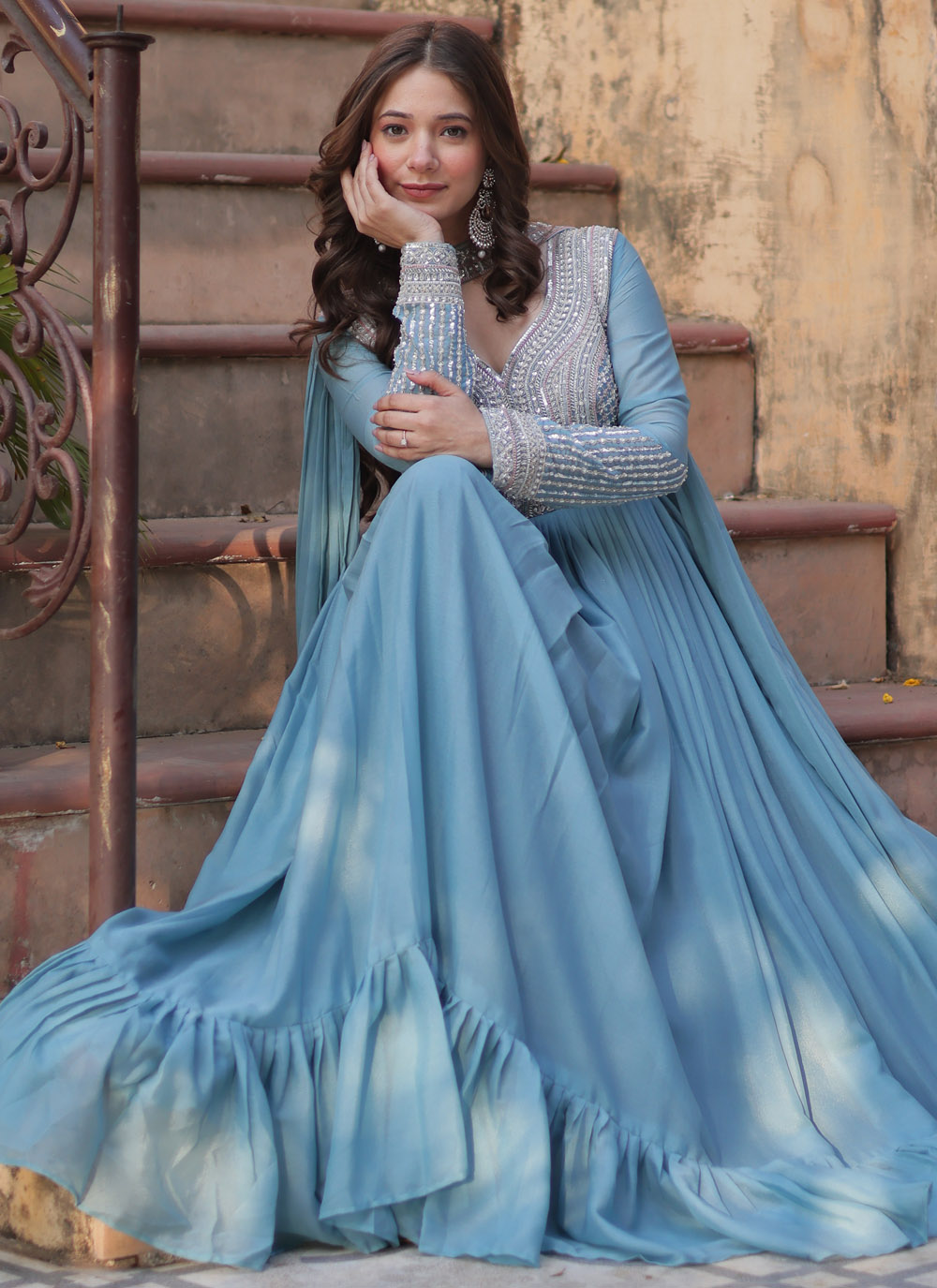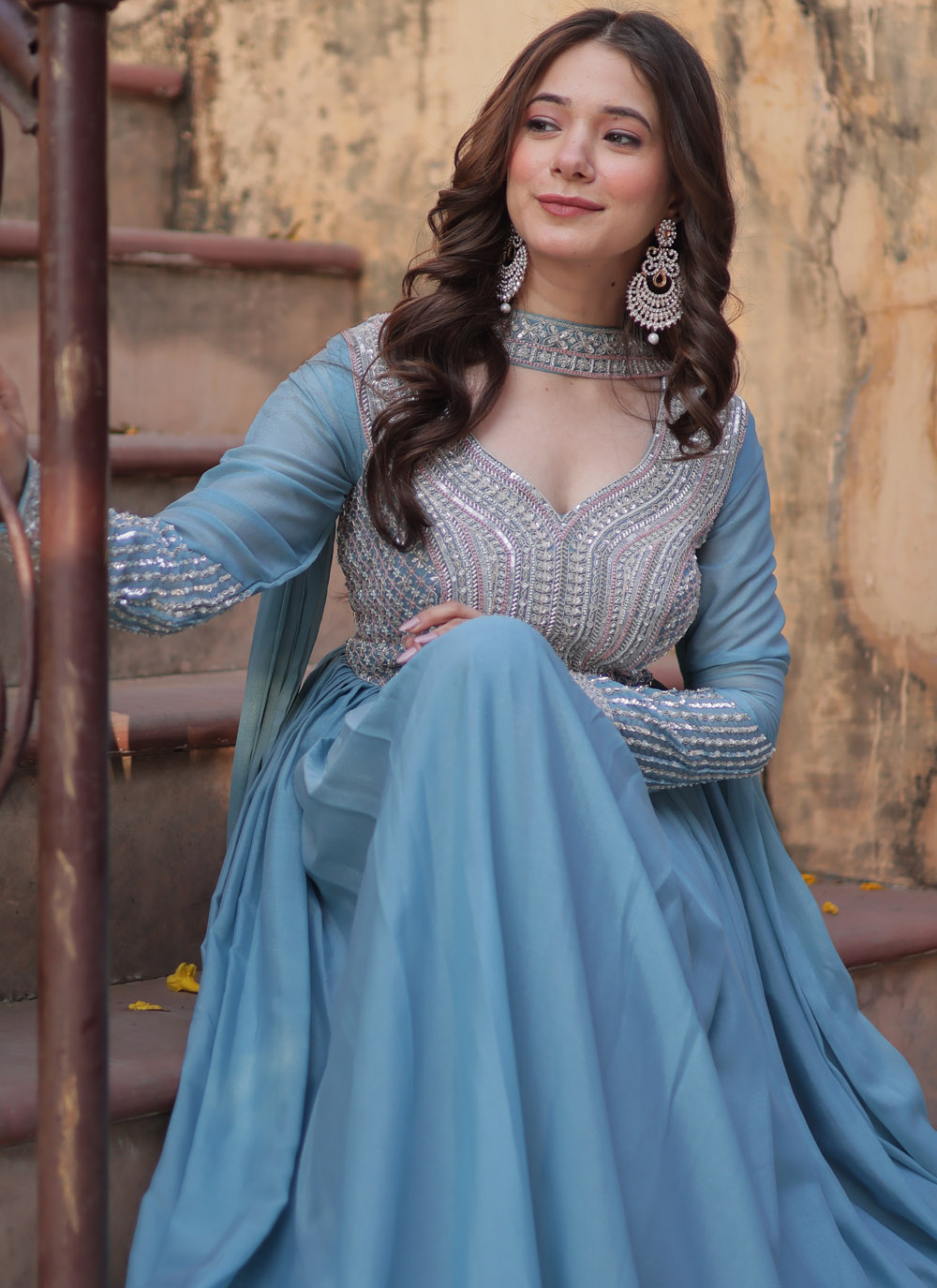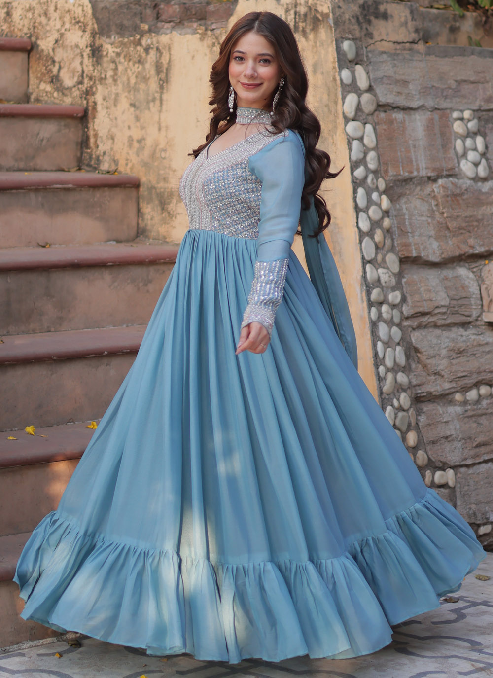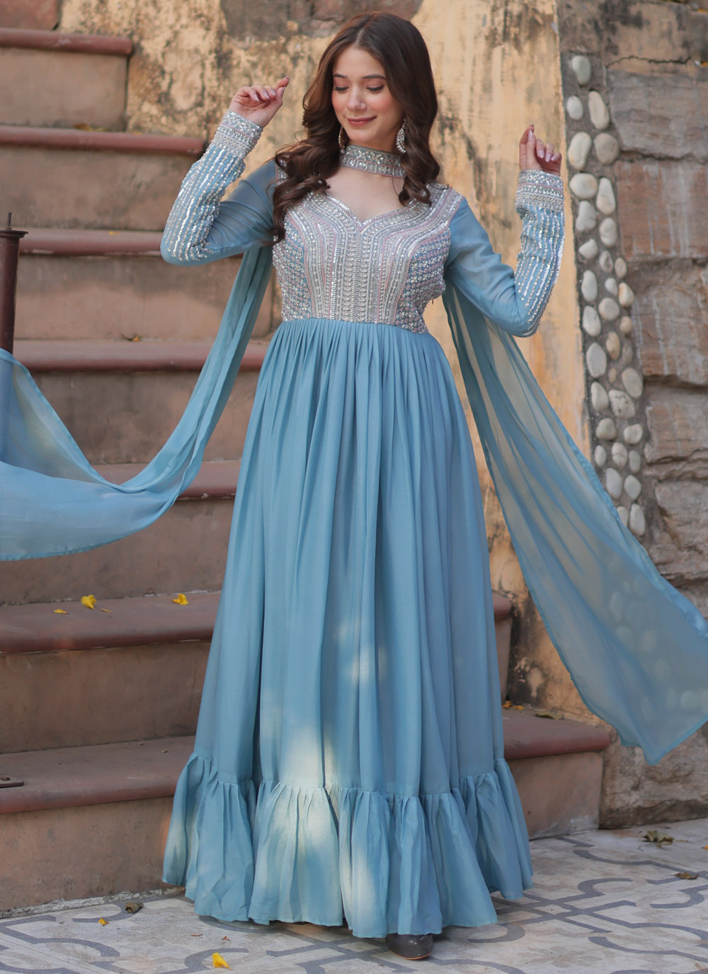 Make a fashion statement with this stunning sky blue gown featuring elegant beads and sequin embroidery on soft faux georgette fabric. Perfect for receptions, festive events, or formal evenings, this gown combines traditional craftsmanship with contemporary appeal. Comes with matching dupatta.