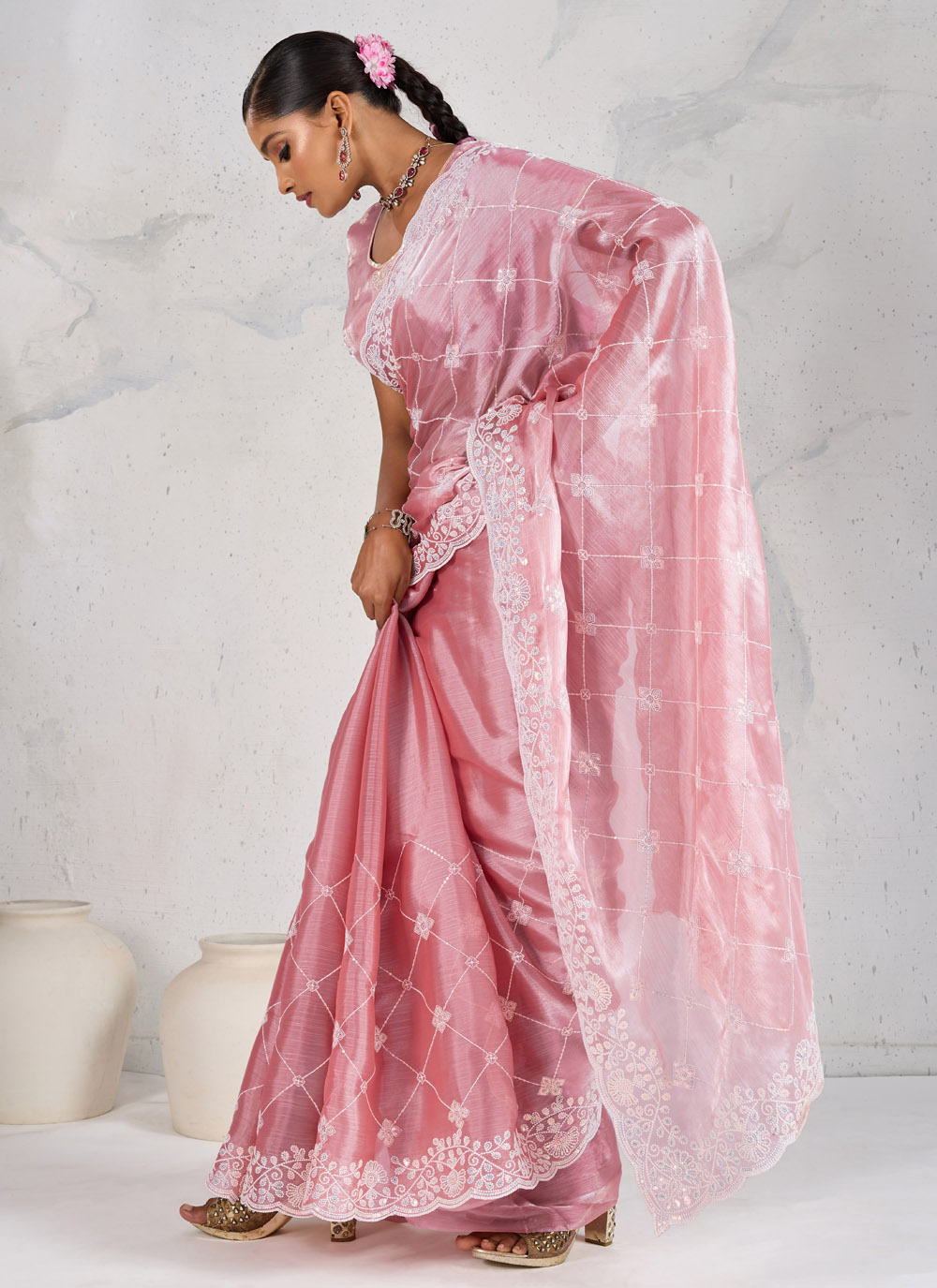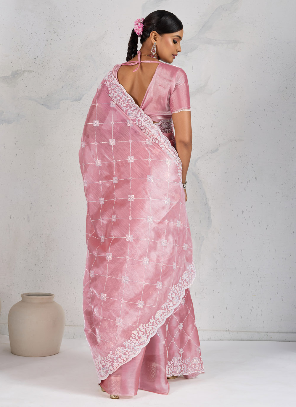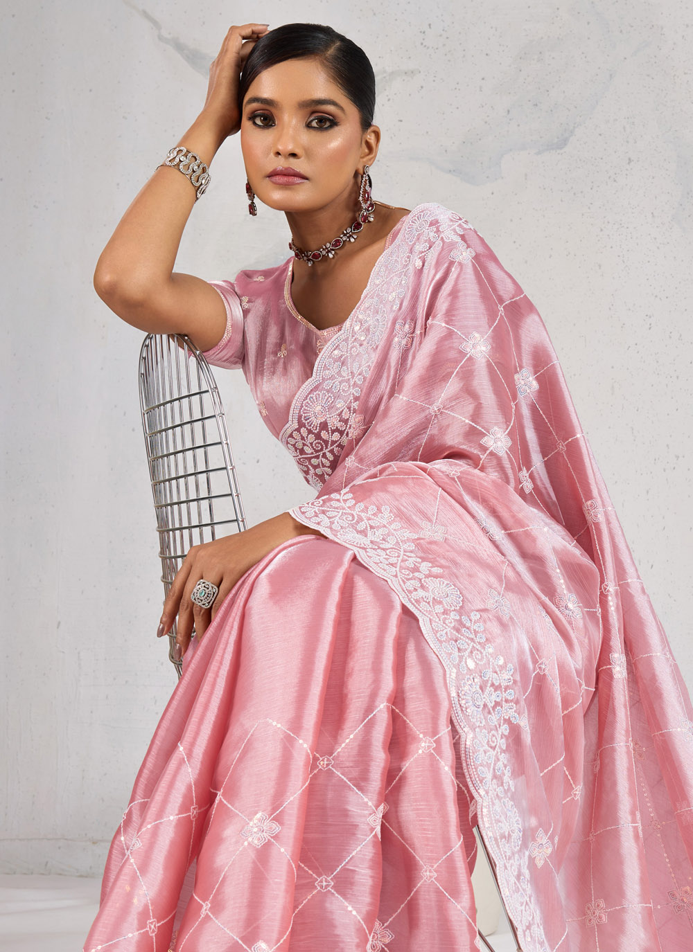This trendy pink party wear saree crafted from Burberry fabric features exquisite thread embroidery work. Lightweight and stylish, it’s designed for contemporary occasions where you want to stand out effortlessly. Comes with matching blouse.