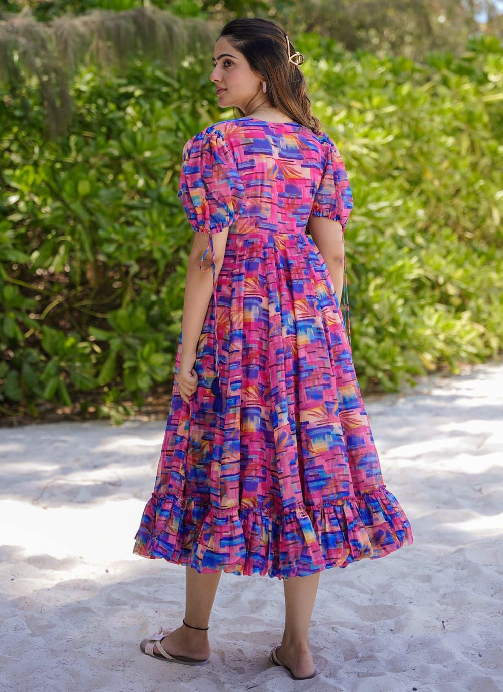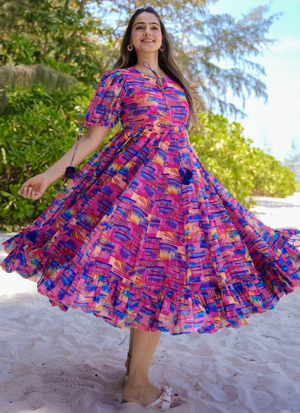 This rayon digital printed kurti is all about trendy vibes and comfort. With its vivid magenta hue and modern prints, it’s a fashionable pick for college, work, or casual outings with friends.