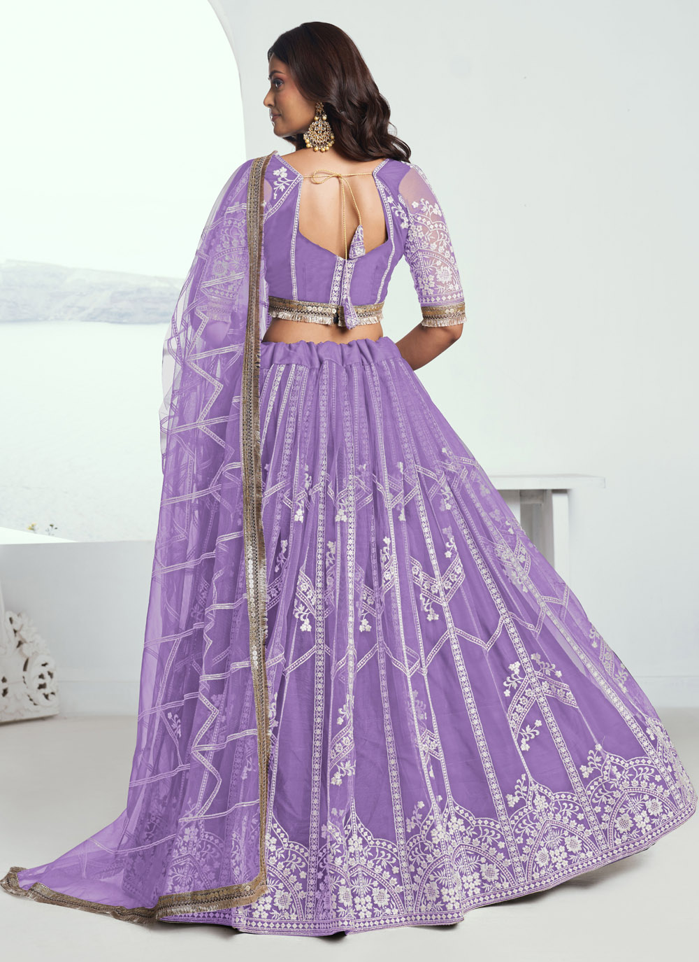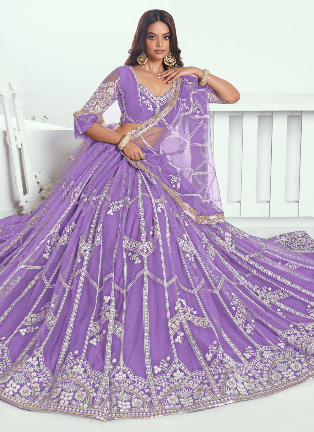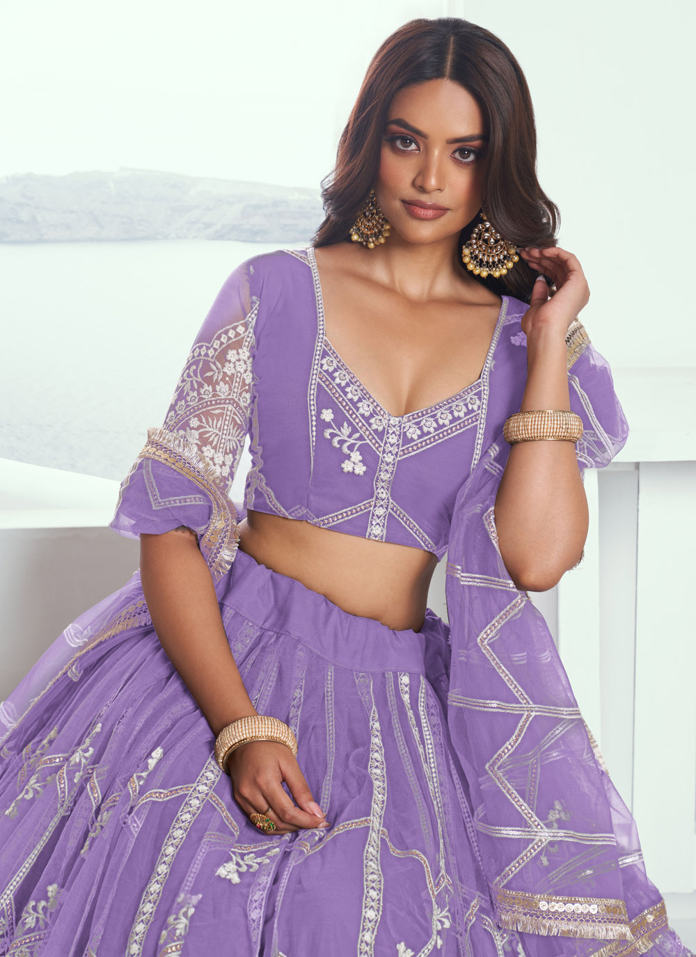 Shine in timeless elegance with this Lavender Net Lehenga Choli, beautifully embellished with sequins, zari, thread embroidery, and lace detailing. The dreamy lavender hue and intricate design make it perfect for modern bridesmaids, festive soirées, or wedding celebrations. Comes with matching choli and dupatta.