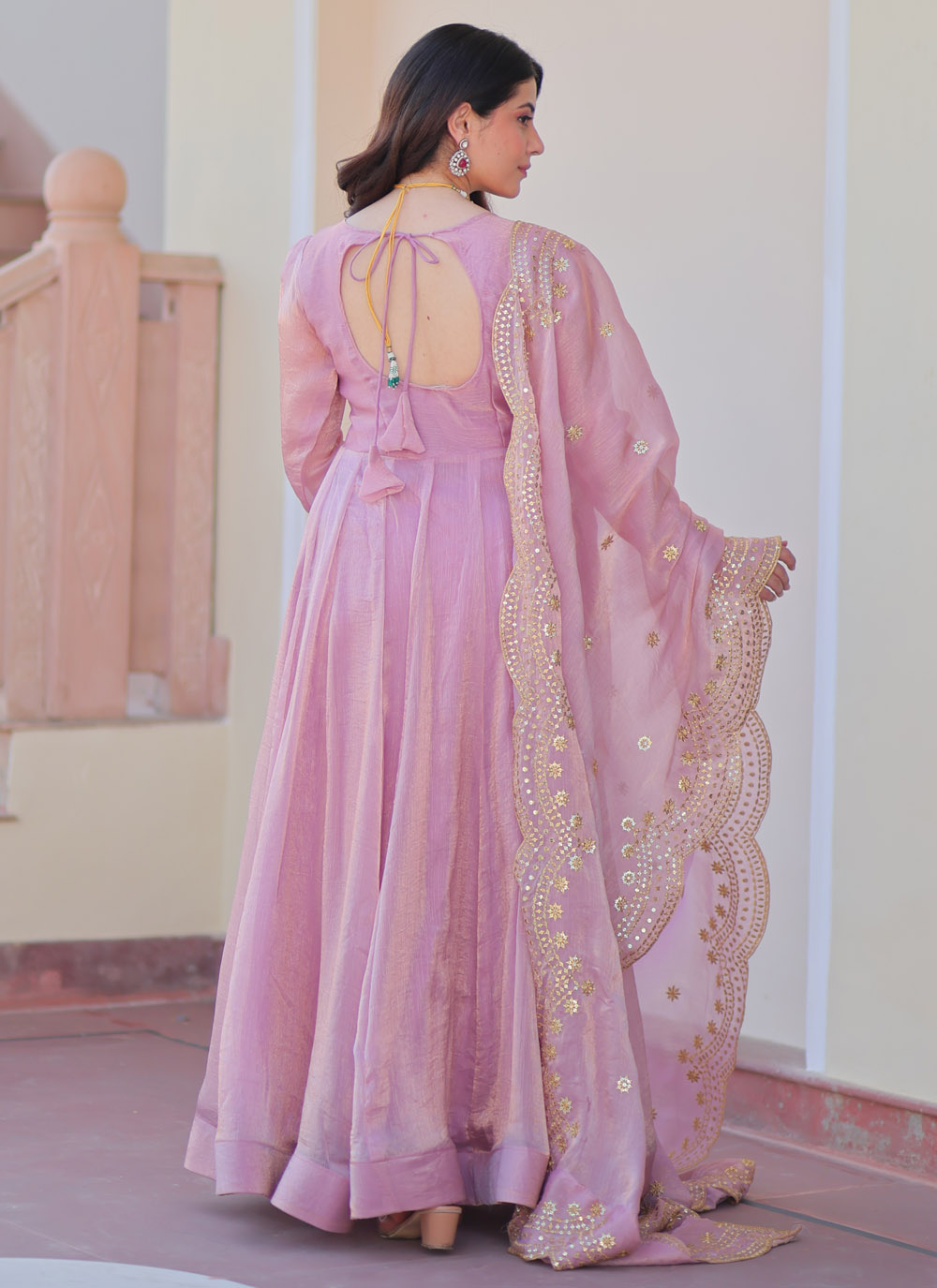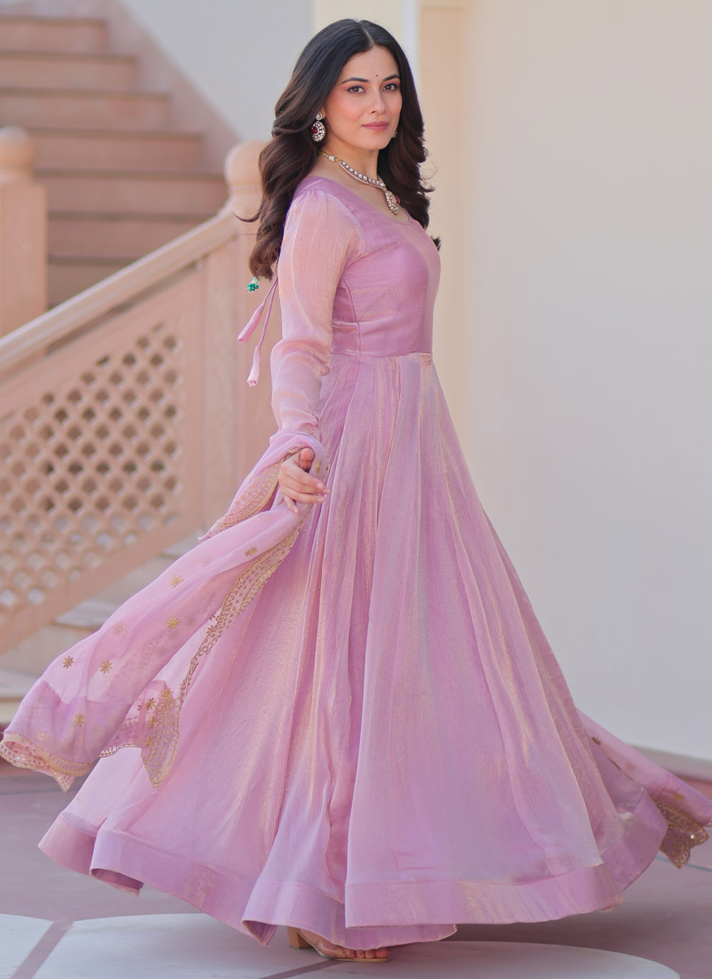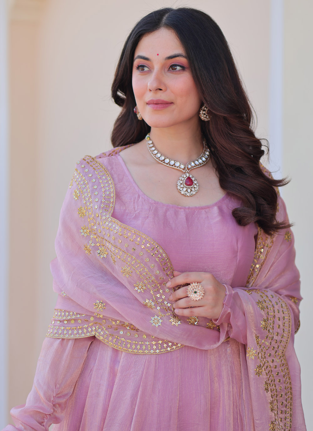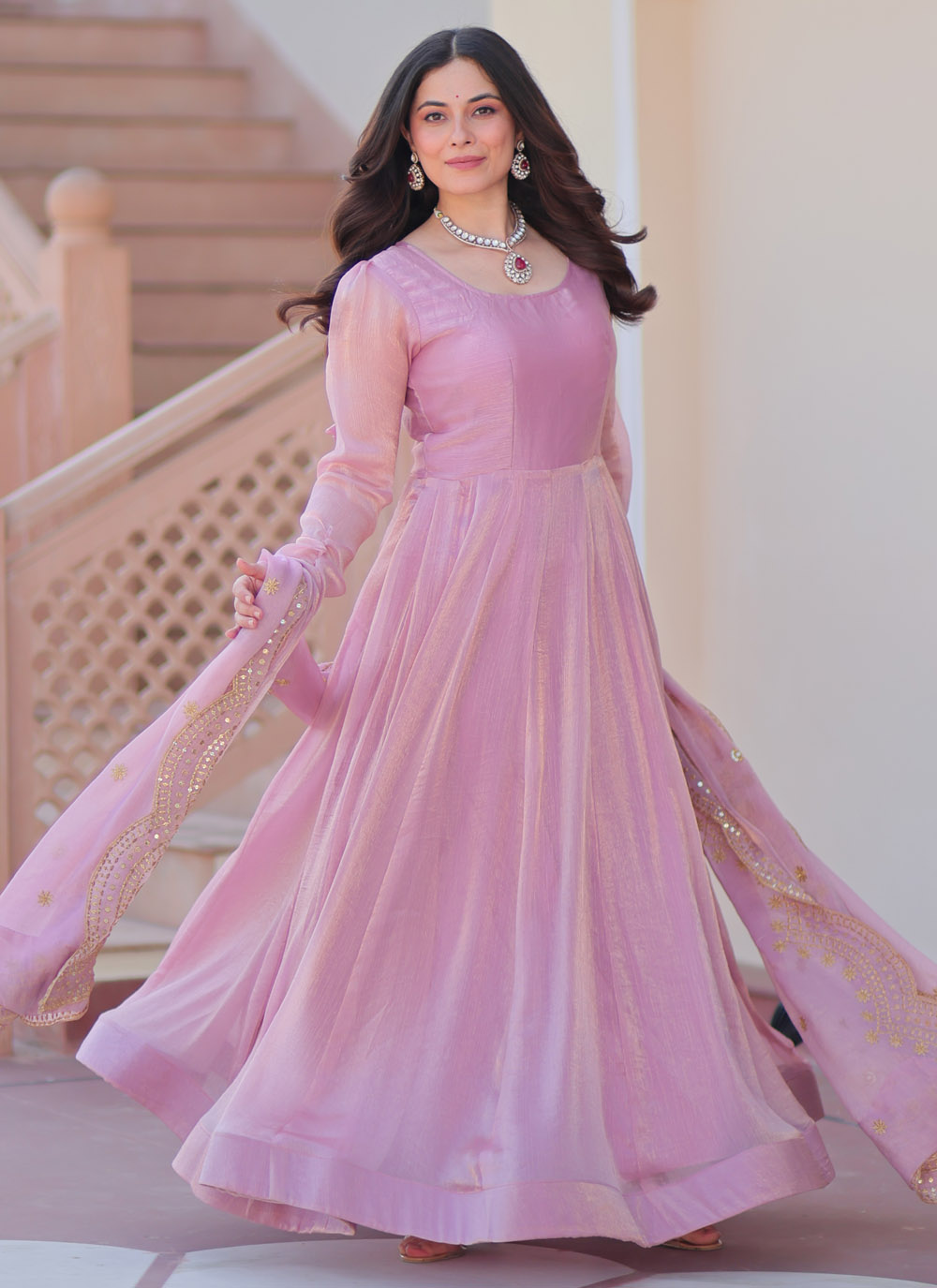 This Trendy Pink Chiffon Readymade Gown brings out your inner diva with its understated design and graceful drape. The rich pink hue radiates charm, while the plain body offers a canvas for creative styling. perfect for wedding event or festival. Comes with sequins zari embroidered dupatta.