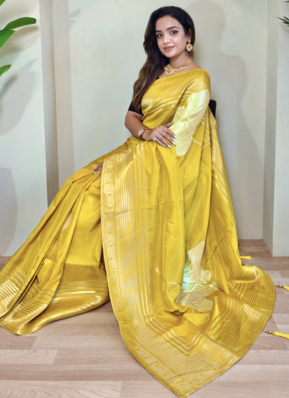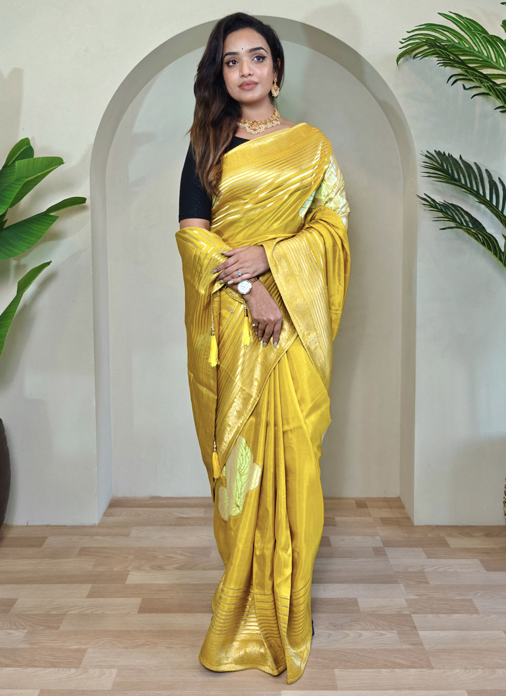 Shine bright in this Trendy Yellow Silk Saree adorned with luxurious zari weaving work. Crafted for ceremonial occasions, the vibrant yellow hue symbolizes joy and celebration, while the rich zari patterns elevate its festive appeal. Comes with matching blouse.