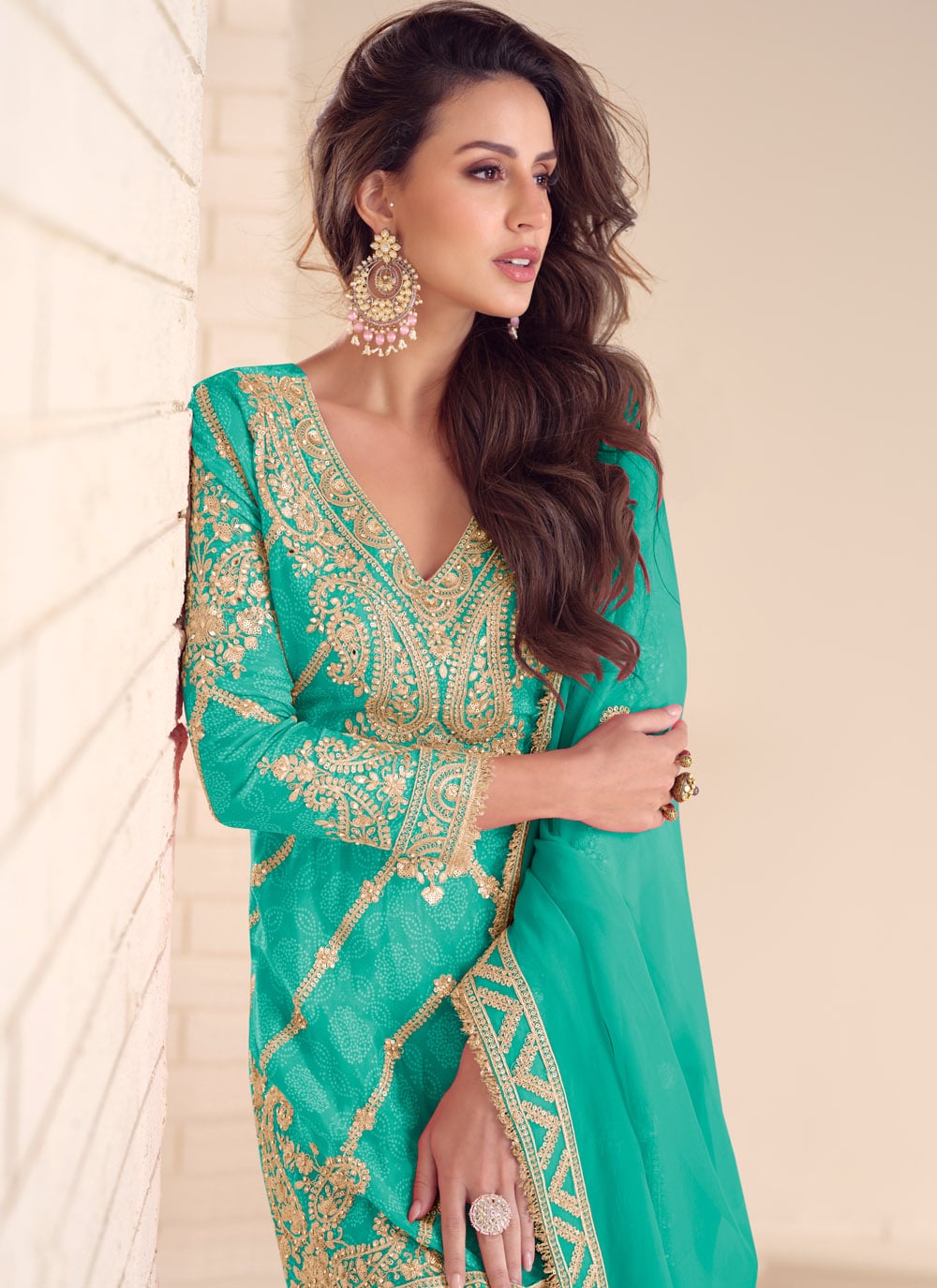 Step into elegance with this Designer Turquoise Chinon Palazzo Suit, featuring a stunning mix of sequins, zari craftsmanship, embroidery and digital prints. A fashionable pick for festive occasions and party wear. Comes with matching bottom and dupatta.