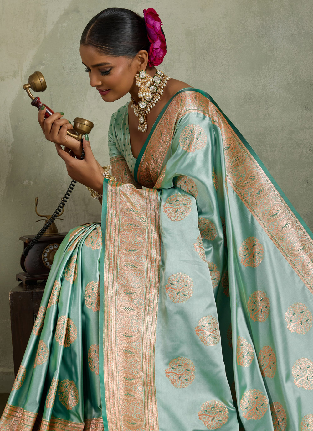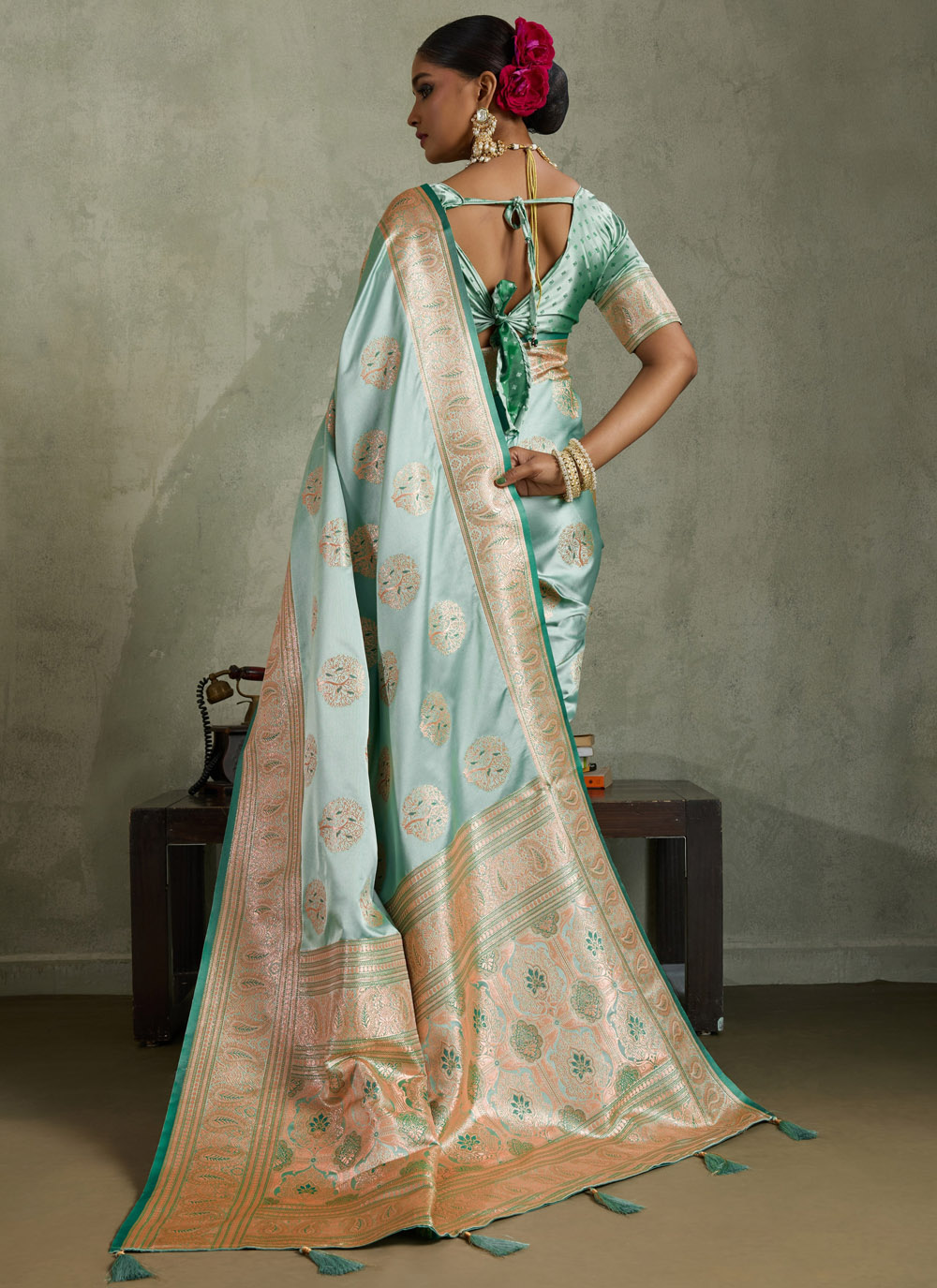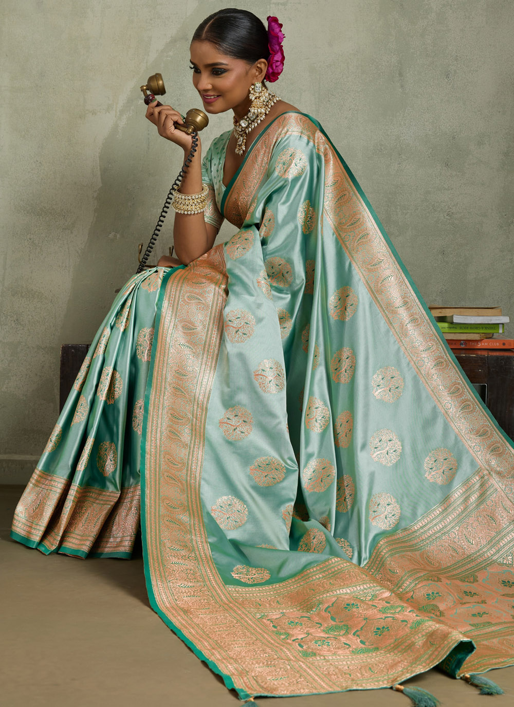Elegantly designed, this satin silk Banarasi saree in turquoise showcases delicate zari and Meenakari woven work across its borders and pallu. The sheen of satin silk elevates its appeal, while the traditional weaving gives it a graceful character. Comes with matching blouse.