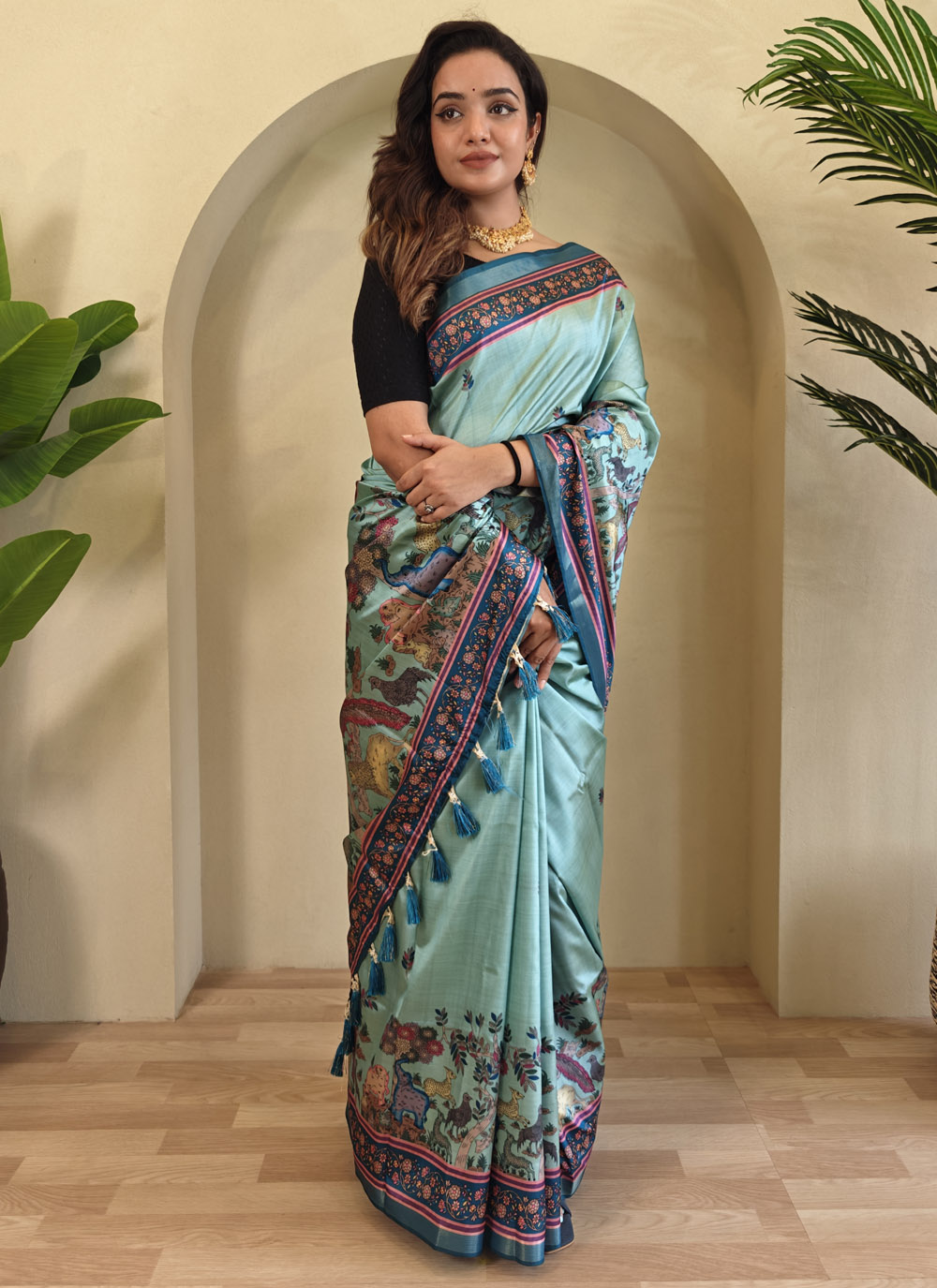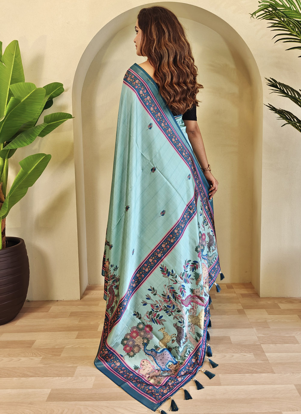 Crafted from soft Dola viscose, this saree in a refreshing turquoise shade is adorned with sophisticated print motifs. Its lightweight nature ensures all-day comfort, while the vibrant tone keeps your look effortlessly festive. Comes with matching blouse.