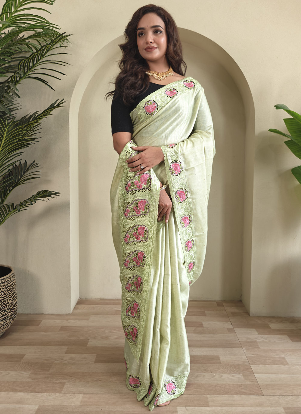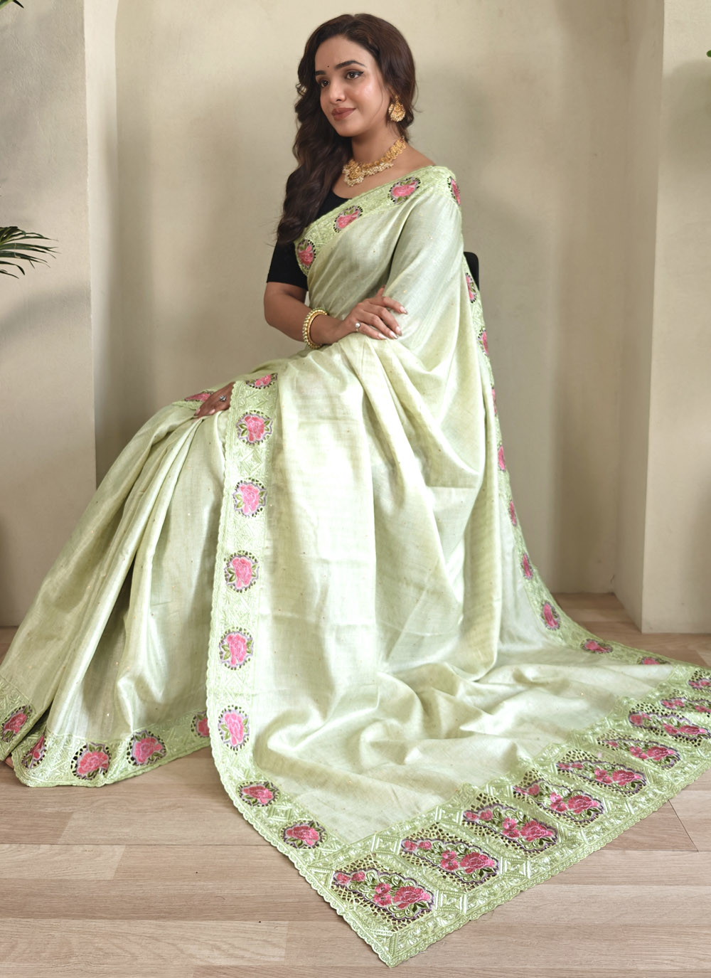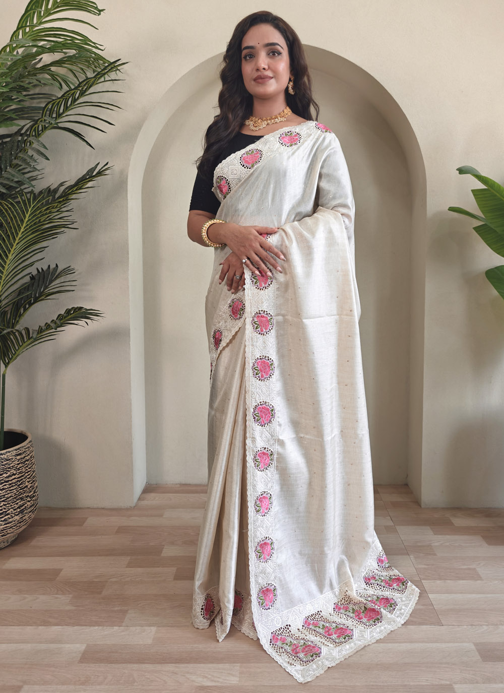 Experience the allure of Indian craftsmanship with this Tussar silk traditional saree, adorned with intricate embroidery and elegant cut work. Perfect for festive occasions, it adds a regal charm to your ethnic wardrobe. Comes with matching blouse.