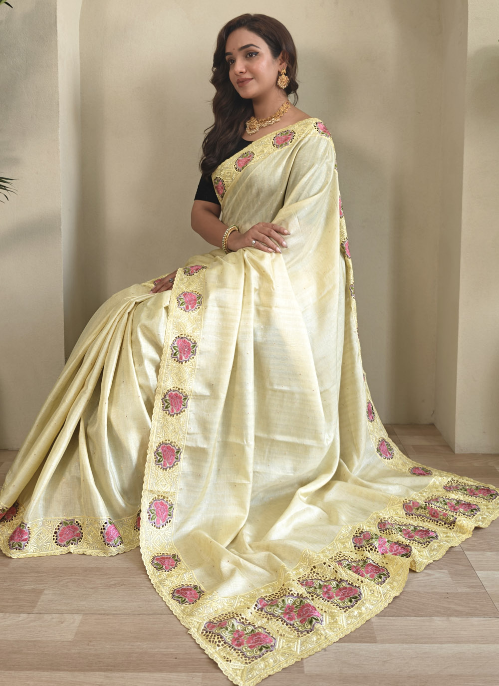 Grace your special occasions in this Tussar silk saree with contemporary embroidered motifs. The calming cream hue exudes purity and finesse, designed for women who embrace elegance with confidence. Comes with matching blouse.