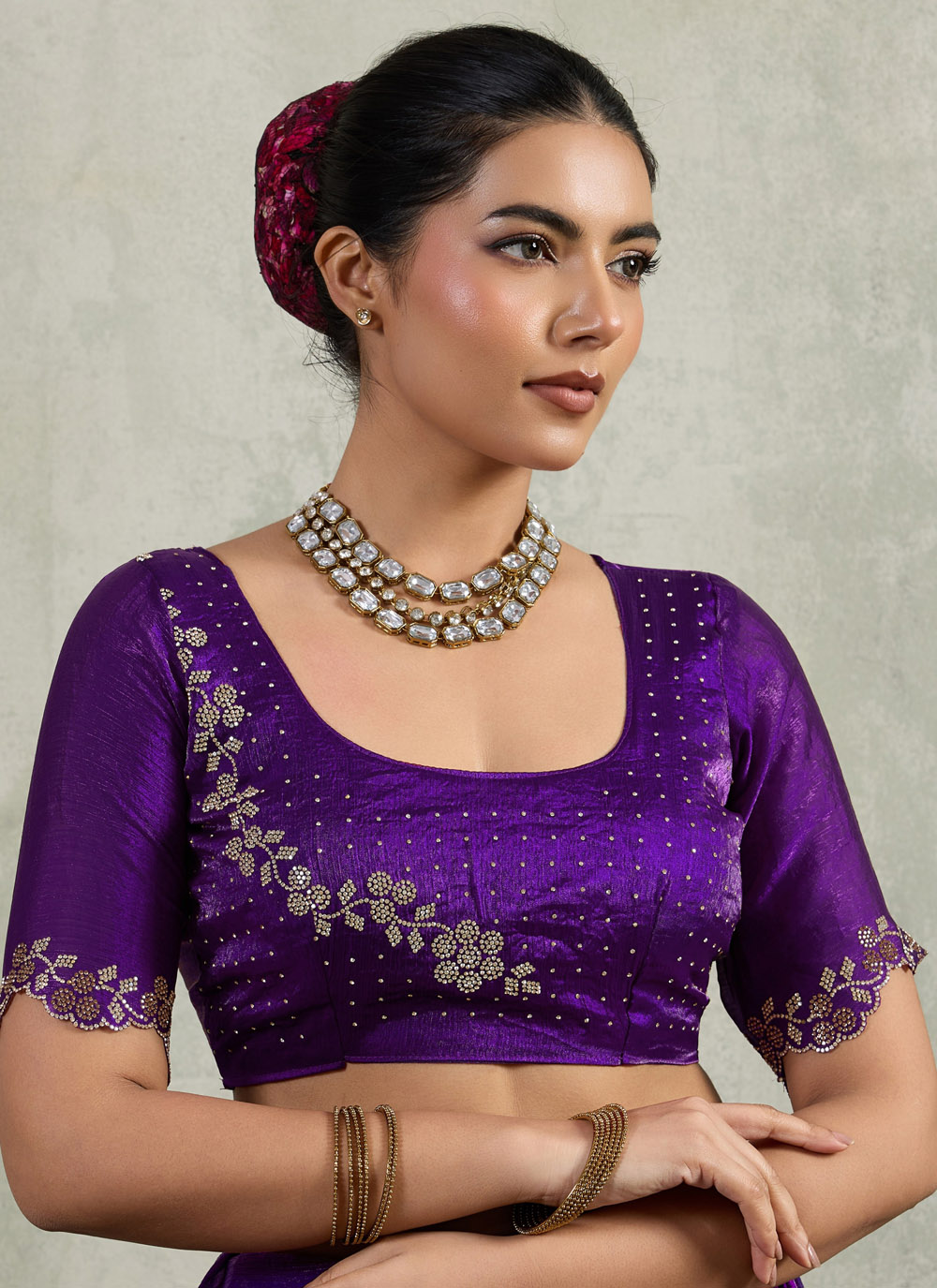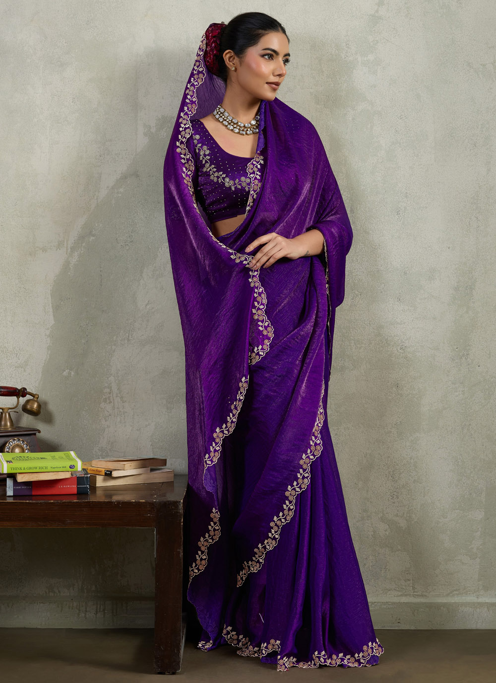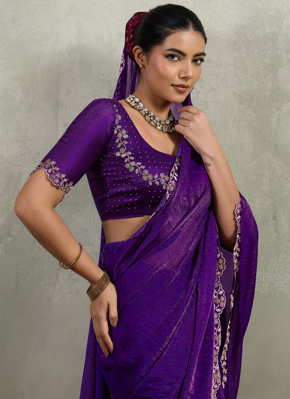 Made with soft velvet chiffon fabric, this purple saree stands out with zarkan work along the border and fine cut work detailing, offering elegance and cultural charm for ceremonial occasions. Comes with matching blouse.