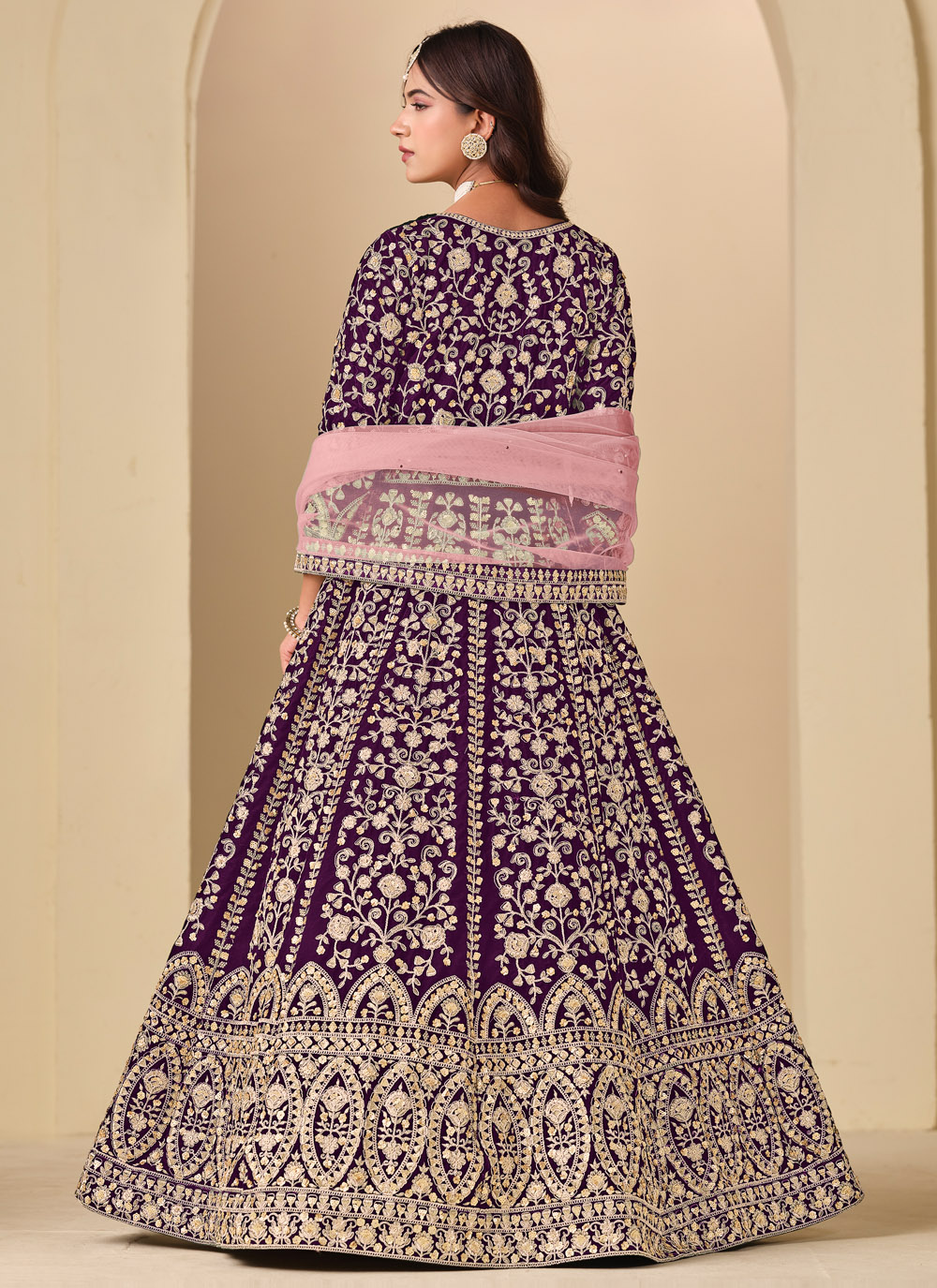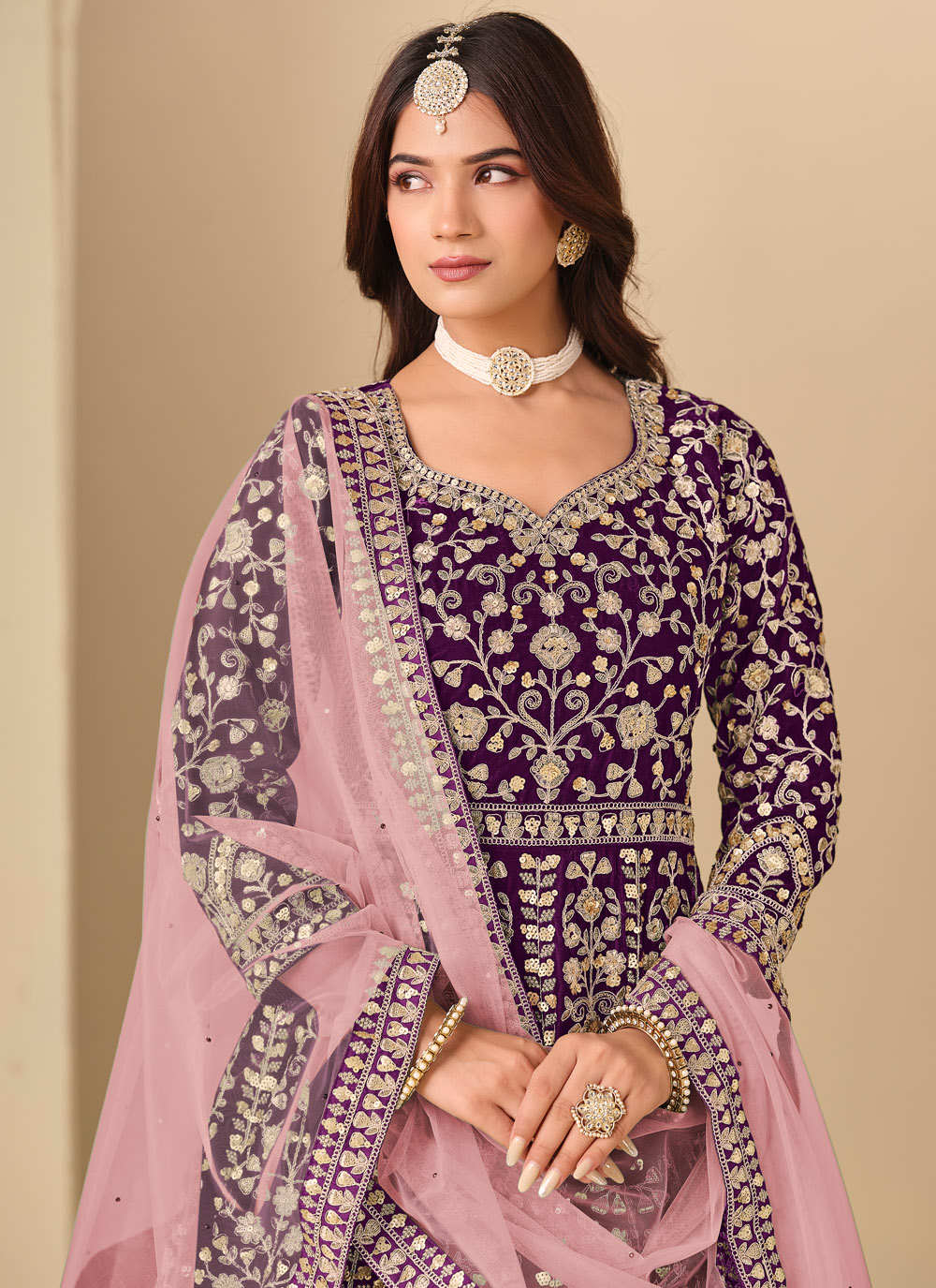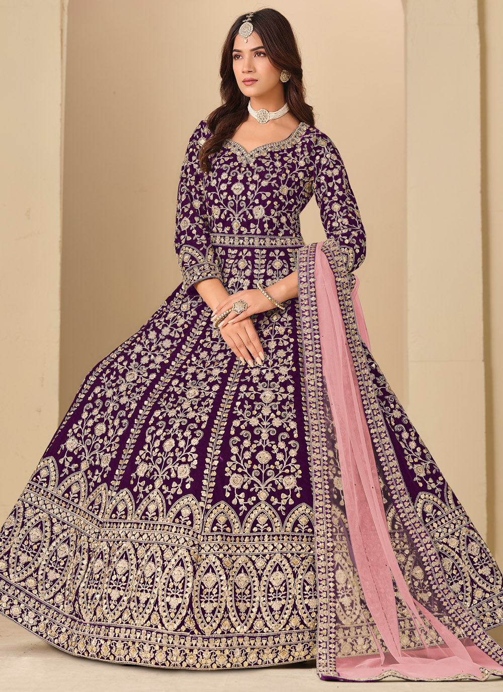 This purple velvet Anarkali style salwar suit is crafted for ceremonial elegance. The rich velvet fabric combined with detailed embroidery creates a royal and graceful look, perfect for weddings and traditional functions. Comes with matching bottom and dupatta.