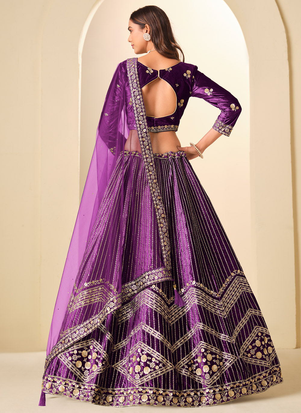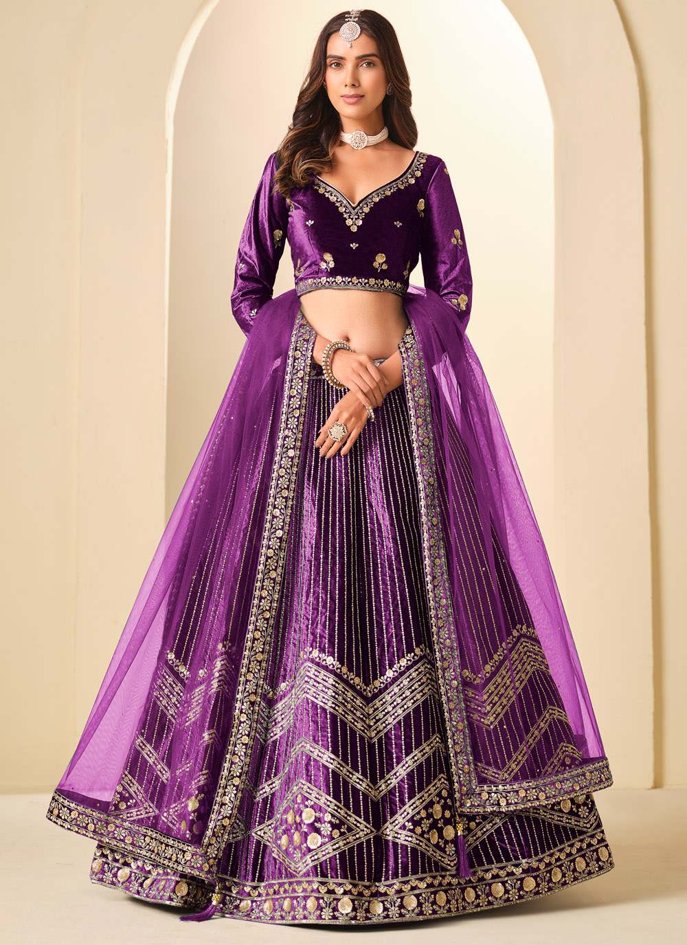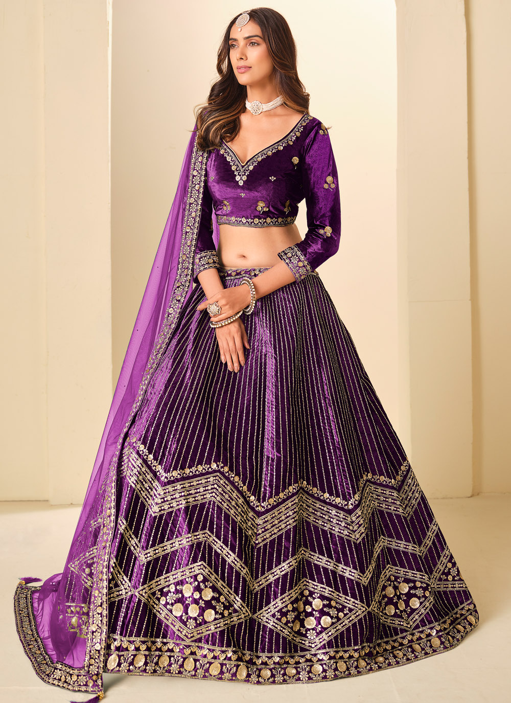 This engagement-ready purple velvet lehenga choli reflects timeless beauty with its detailed embroidery and rich texture. The royal shade adds charm, while the flowing silhouette enhances overall elegance. Comes with matching choli and dupatta.