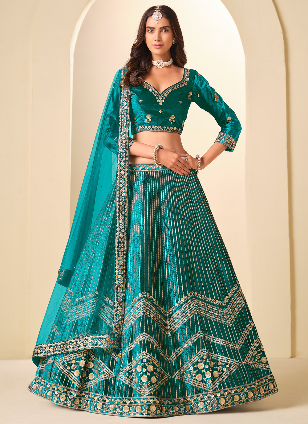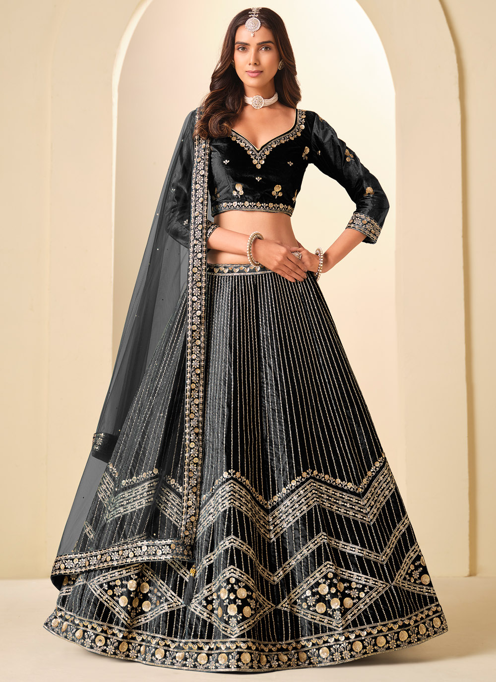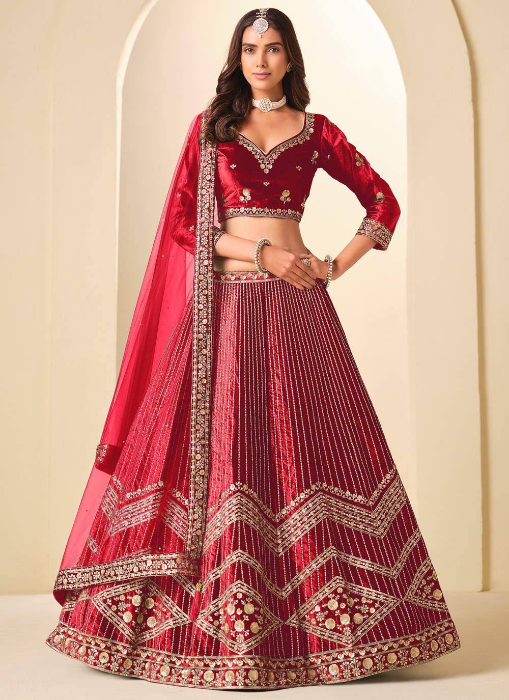 This engagement-ready purple velvet lehenga choli reflects timeless beauty with its detailed embroidery and rich texture. The royal shade adds charm, while the flowing silhouette enhances overall elegance. Comes with matching choli and dupatta.