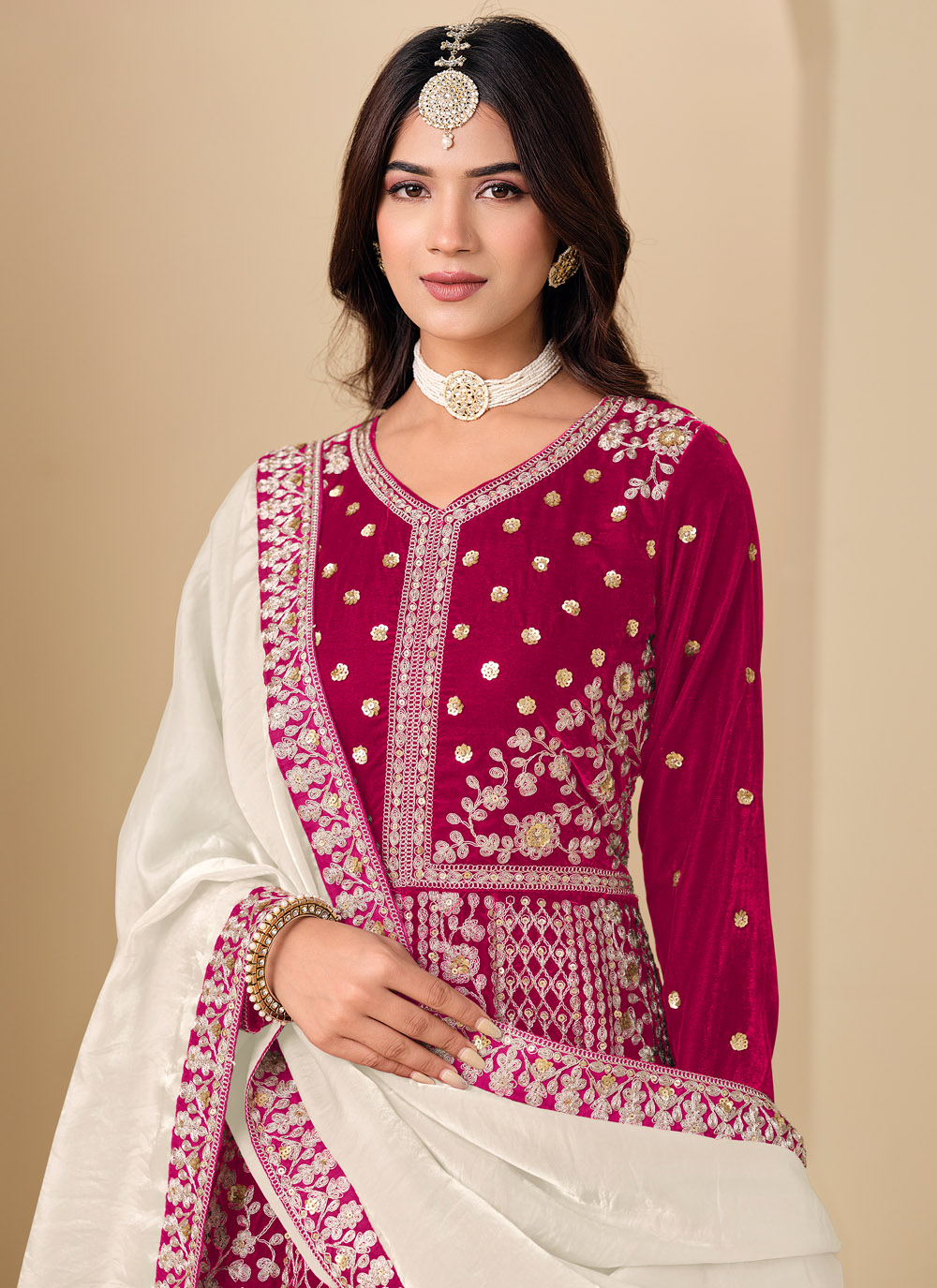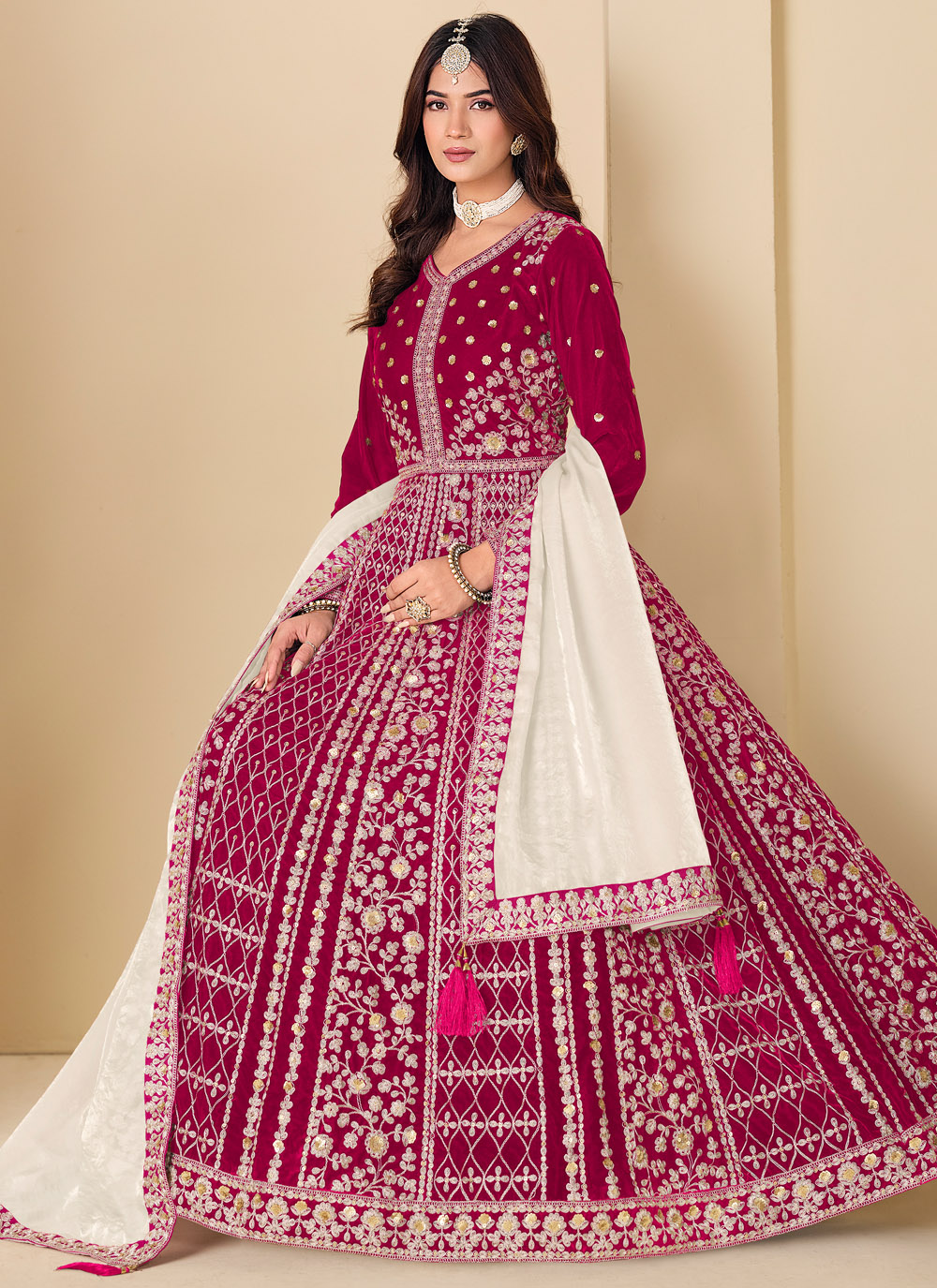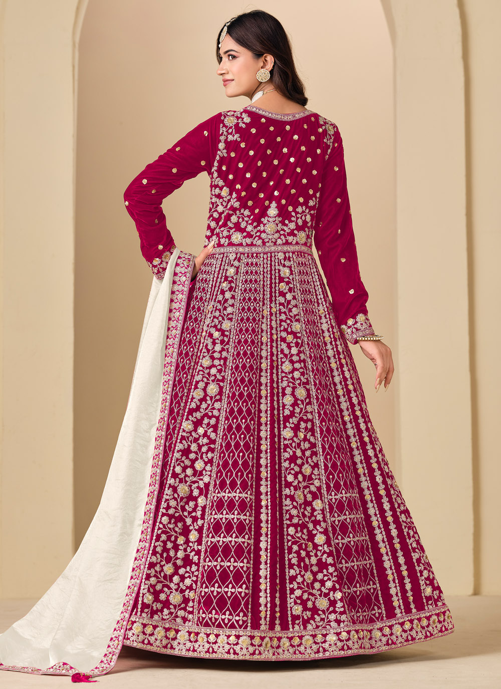This sequins and resham embroidered Anarkali suit blends classic craftsmanship with modern style. Its rich velvet texture and flowing silhouette make it perfect for receptions and festive evenings. Comes with matching bottom and dupatta.