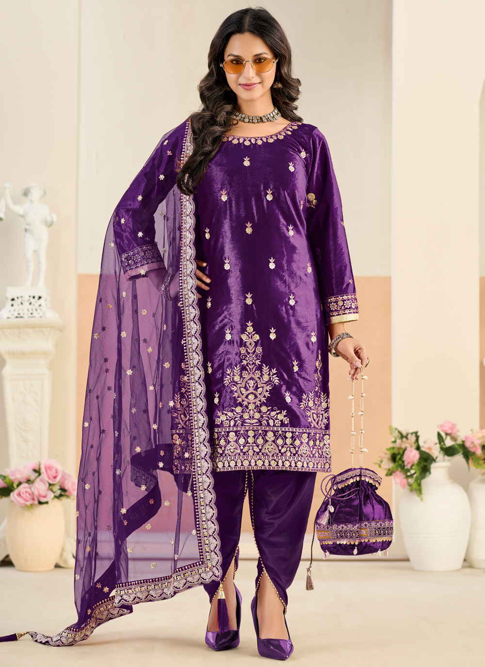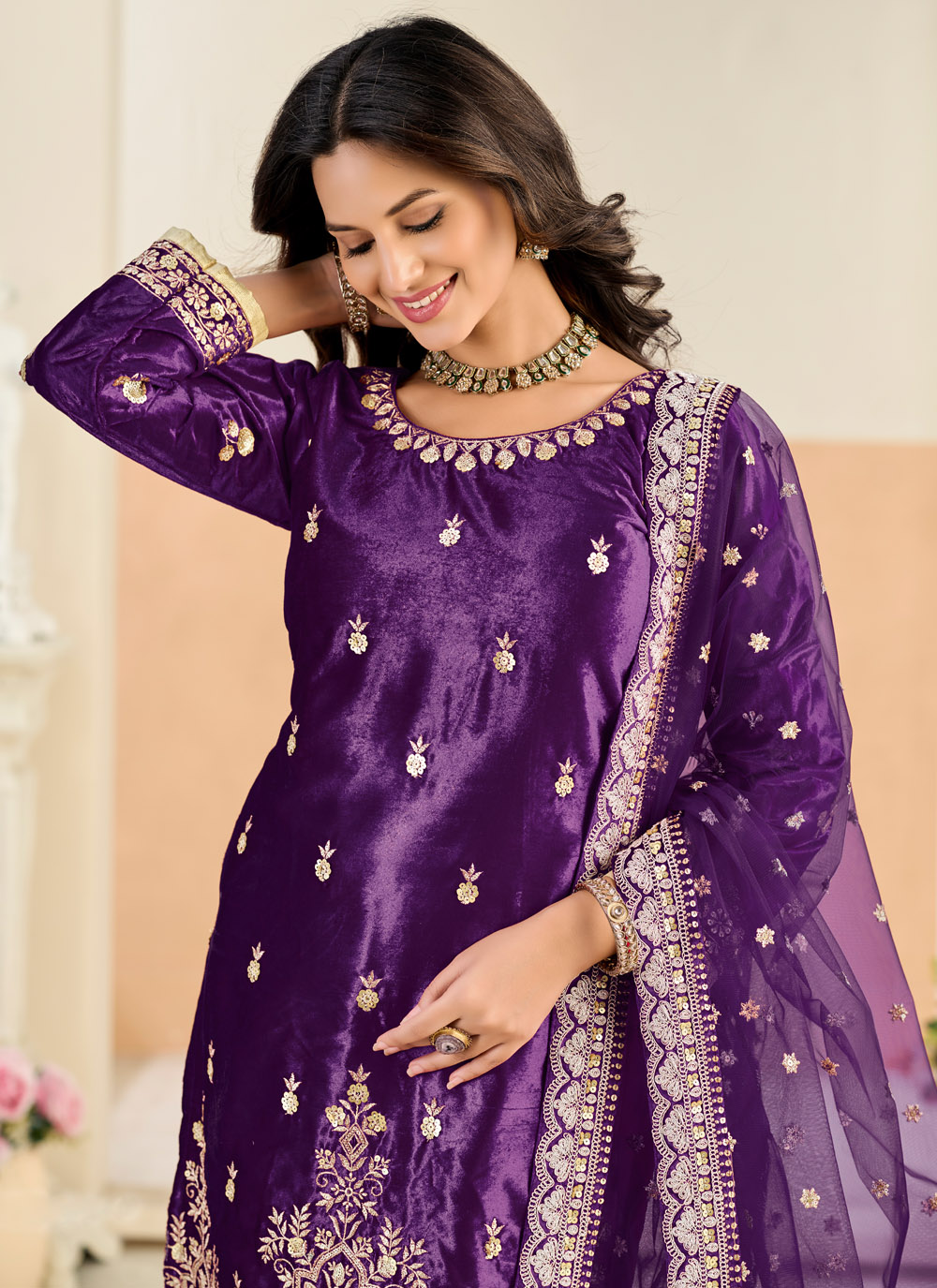 Add royal charm to your ethnic wardrobe with this Velvet Purple Sequins Resham Embroidered Patiala Style Salwar Suit. The rich purple velvet kameez is beautifully adorned with fine resham embroidery and sparkling sequins, while the Patiala salwar gives a graceful and traditional flow. Comes with matching bottom and dupatta.