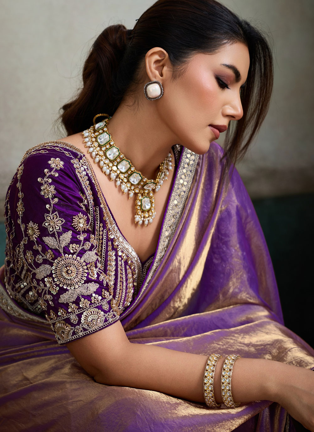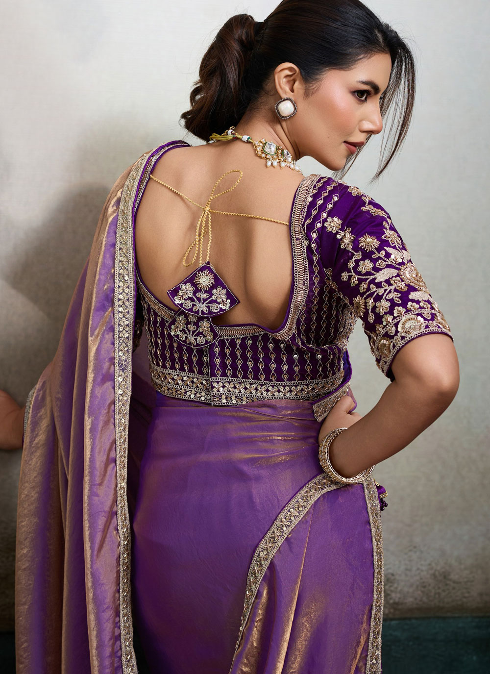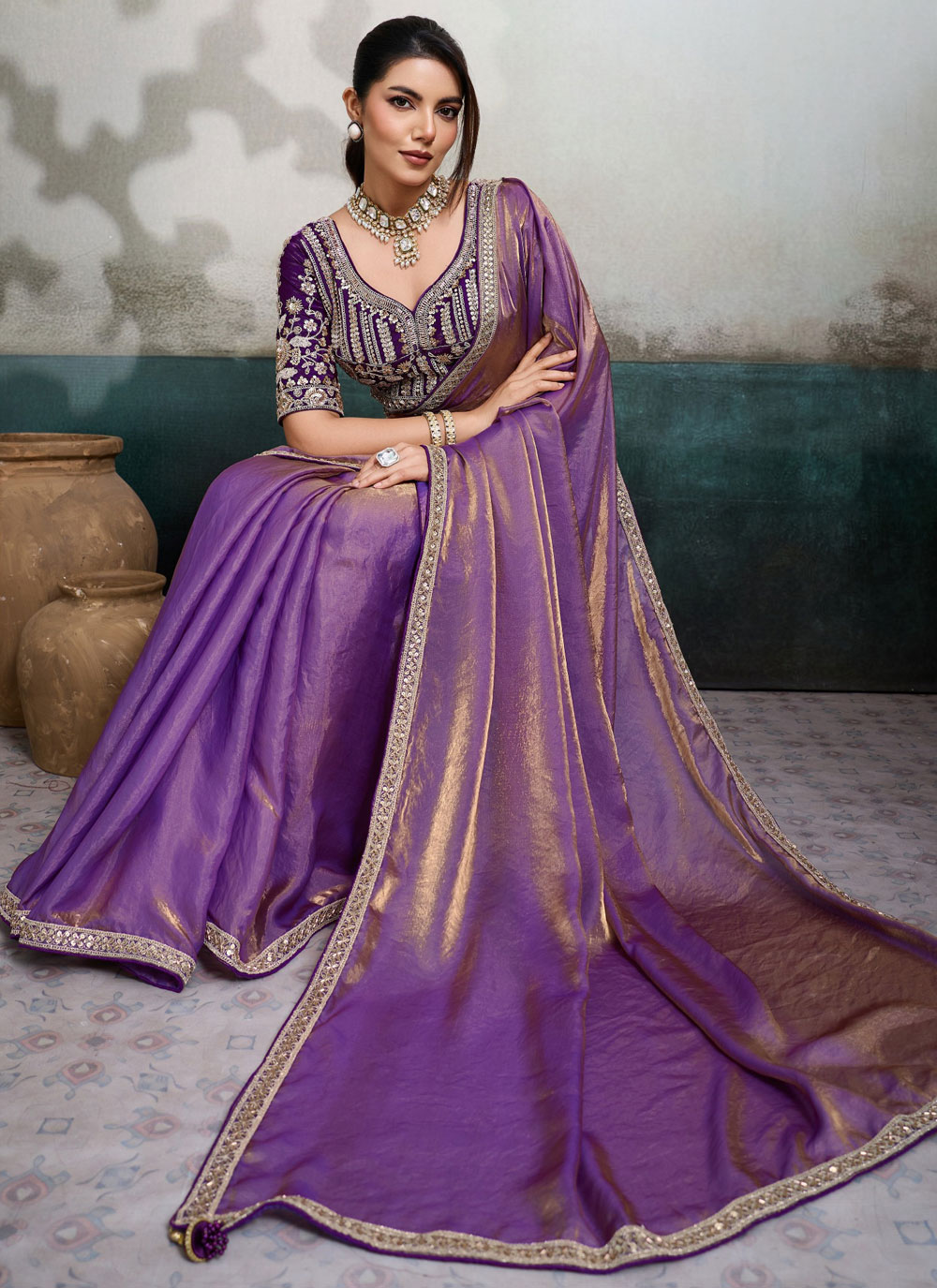 The Velvet Satin Purple Border Embroidered Contemporary Saree showcases a perfect blend of modern elegance and traditional craftsmanship. The beautifully embroidered purple border adds a stylish contrast, making it an ideal outfit for parties, festive gatherings and special occasions. Comes with matching blouse.