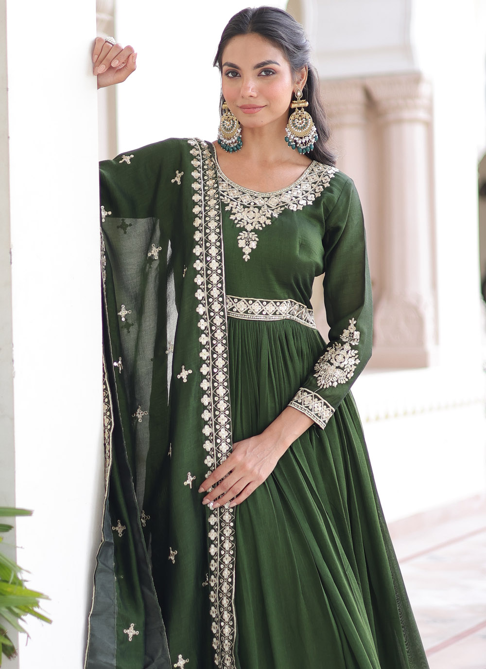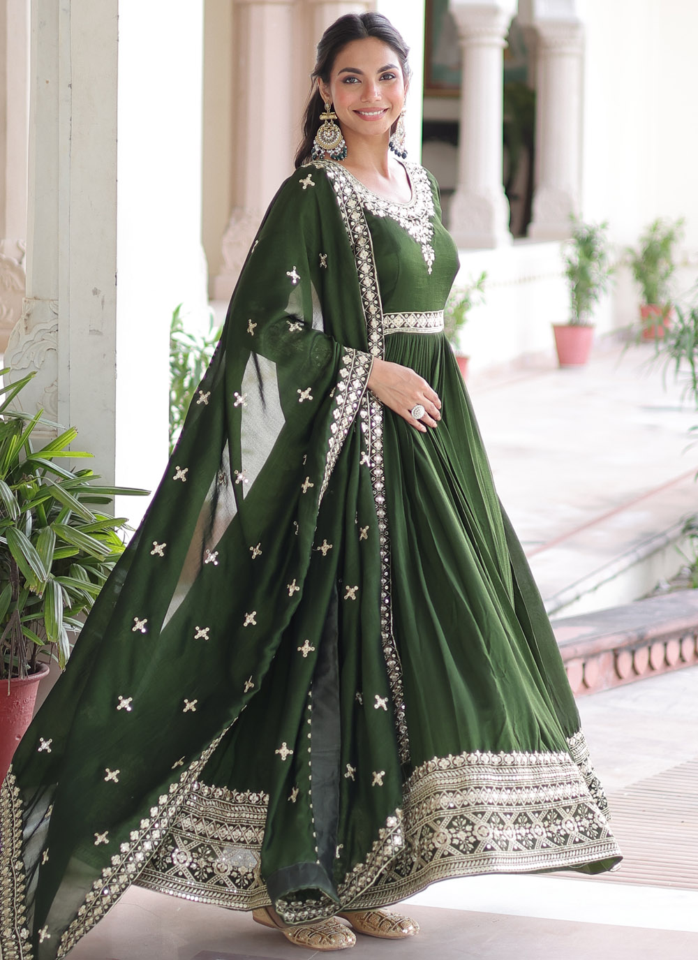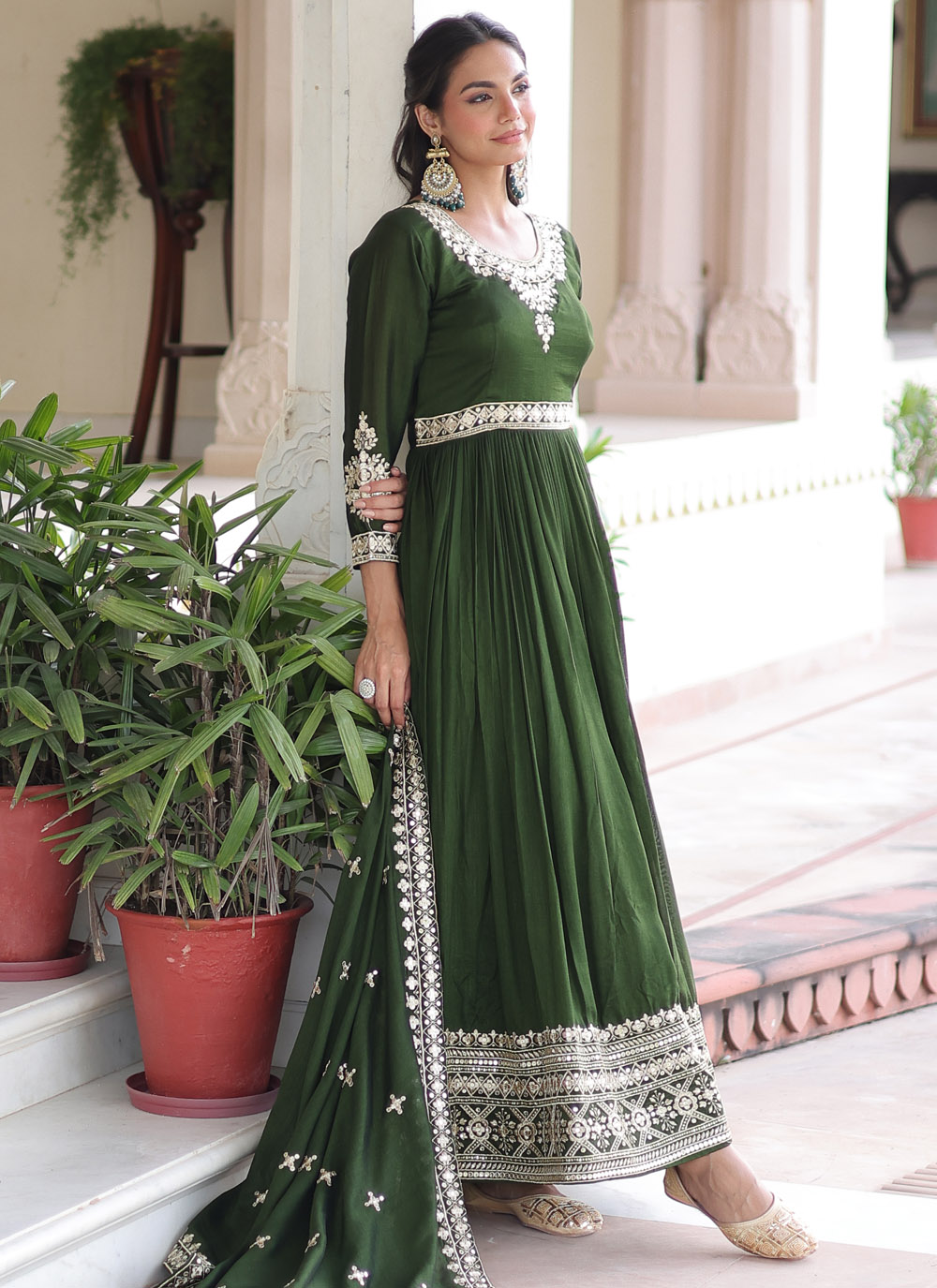 This trendy ceremonial gown showcases intricate embroidery on soft Vichitra silk in a refreshing green tone. The comfortable fit and stylish design ensure a graceful appearance throughout long celebrations. Comes with matching dupatta.