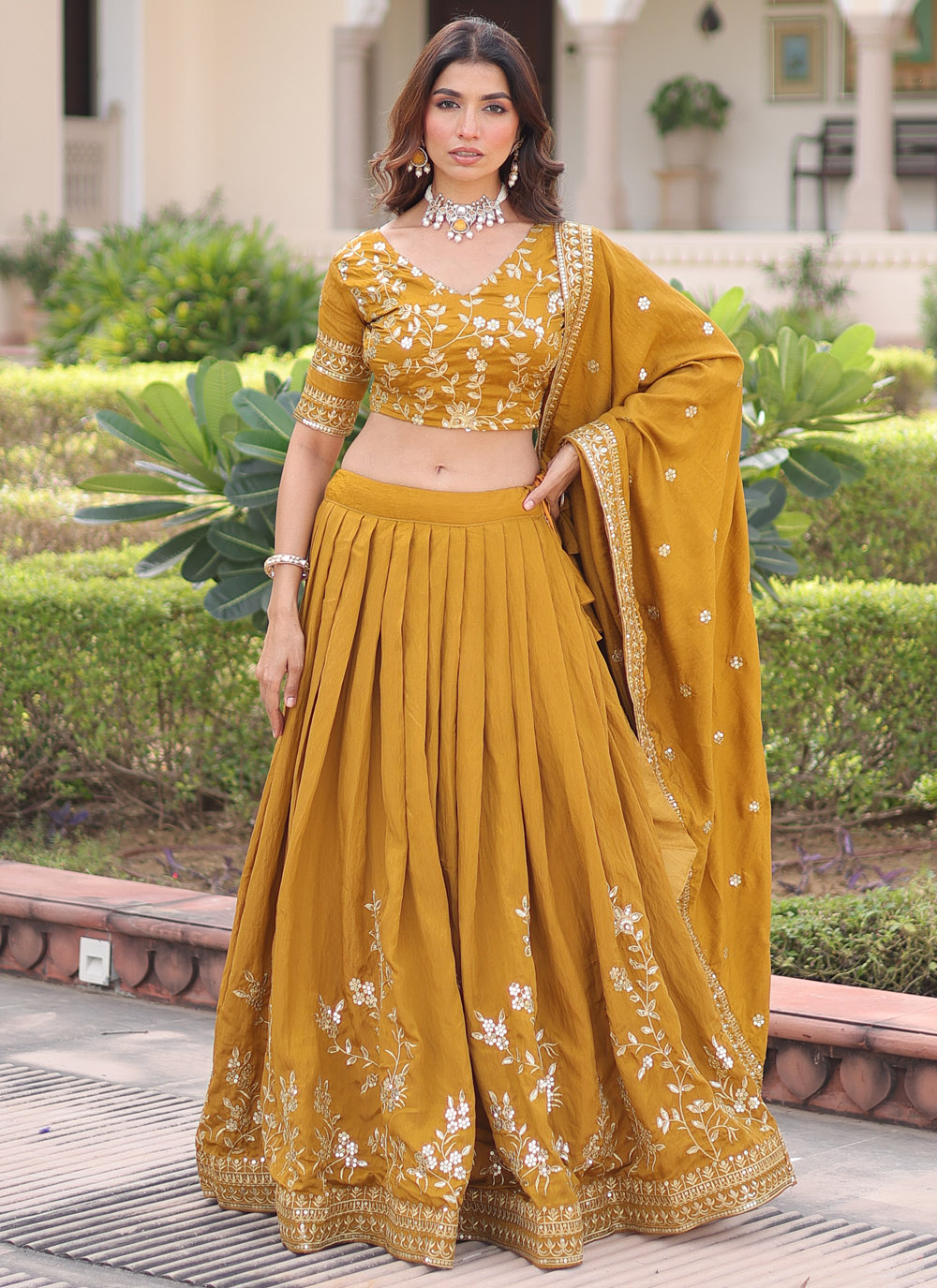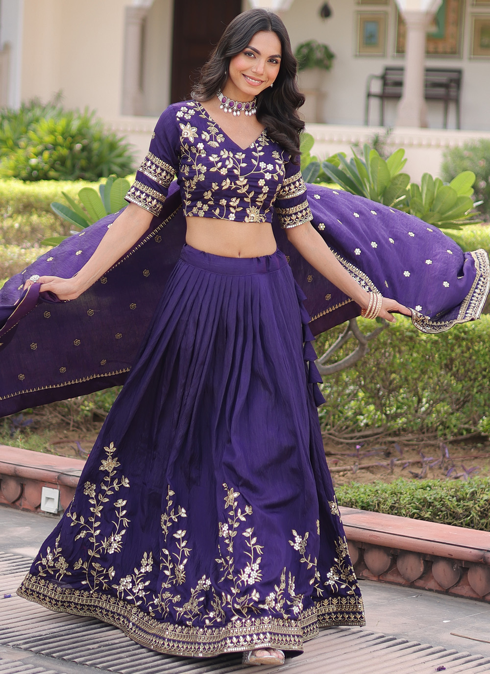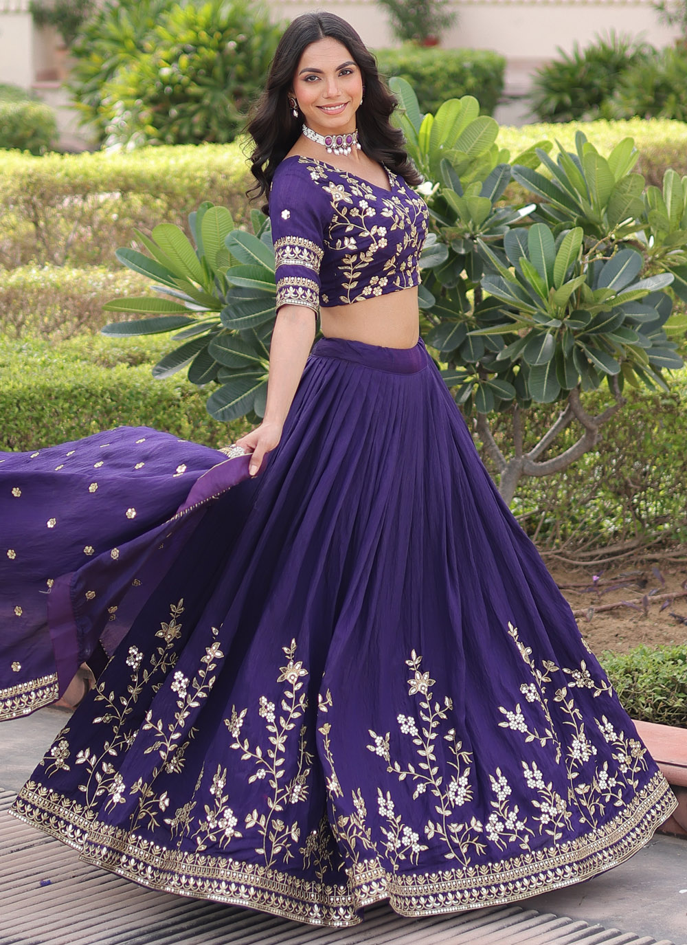 Upgrade your ethnic wardrobe with this beautifully crafted purple lehenga choli in premium vichitra silk. The detailed zari and sequin embroidery enhances its festive appeal while maintaining a comfortable and stylish fit. Comes with matching choli and dupatta.
