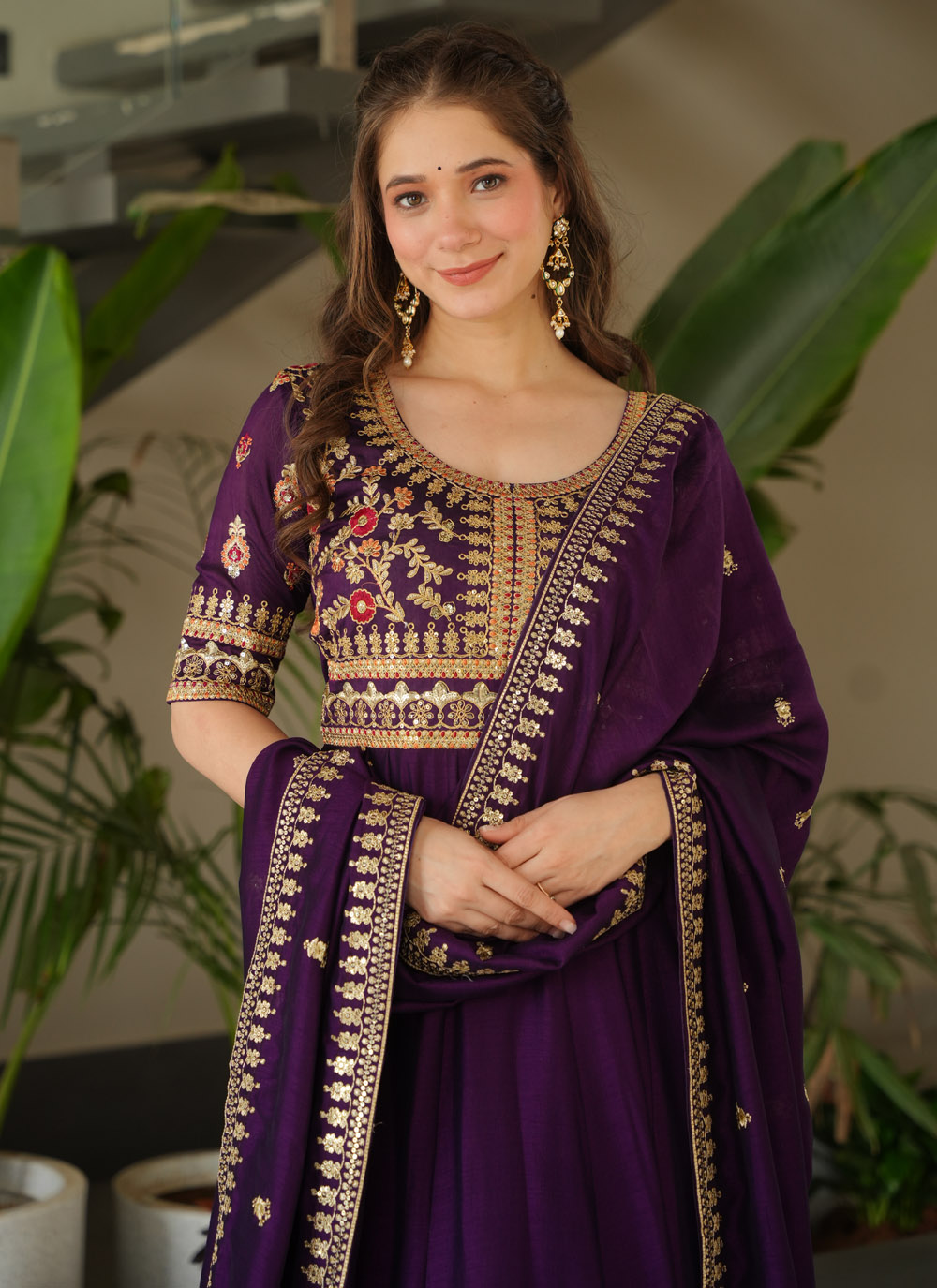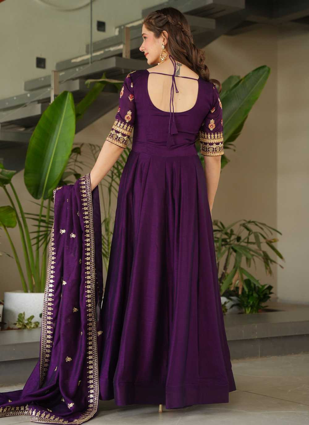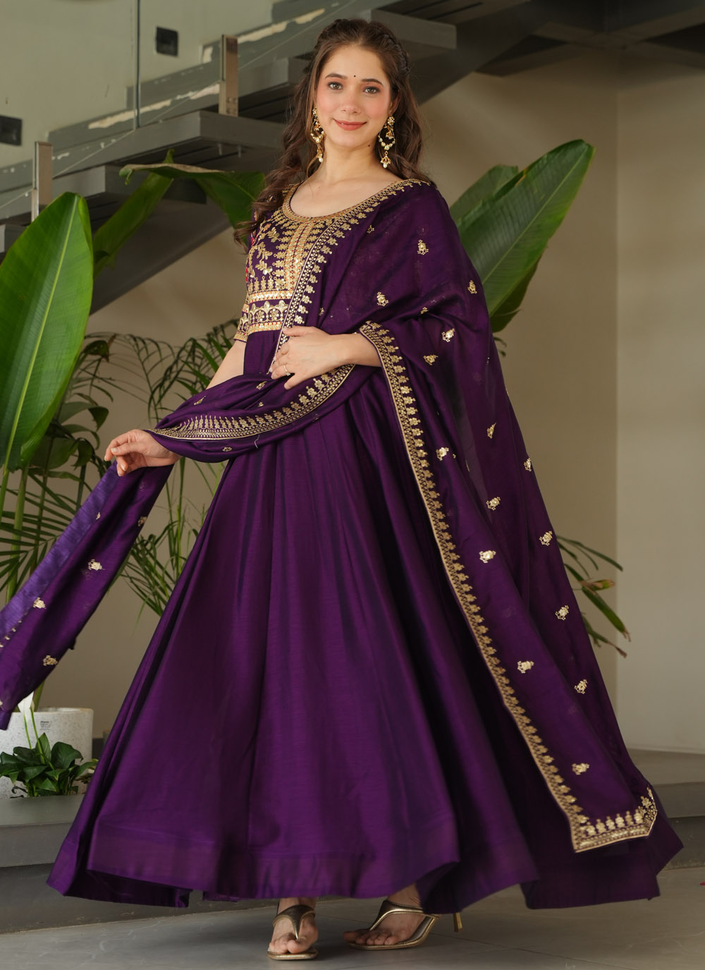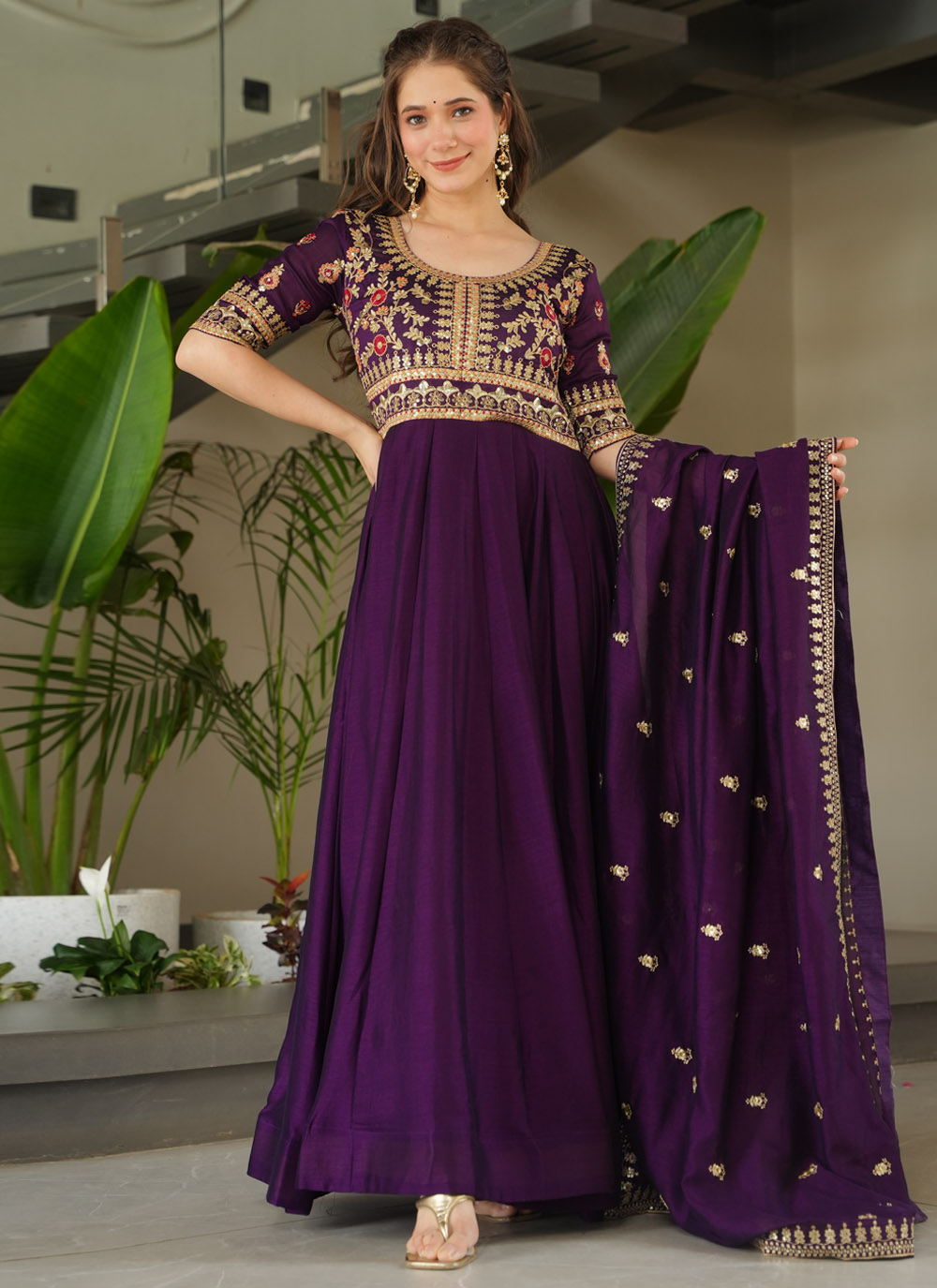 Crafted from Vichitra silk, this purple readymade gown features dazzling sequin and zari embroidery, delivering a royal look perfect for festive and wedding occasions. Comes with matching dupatta.