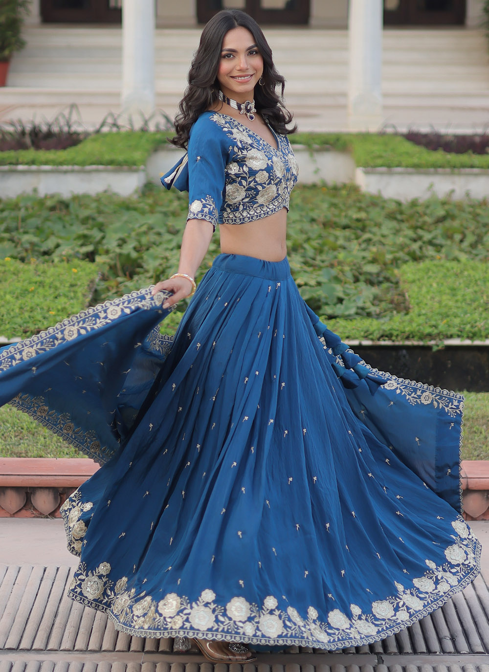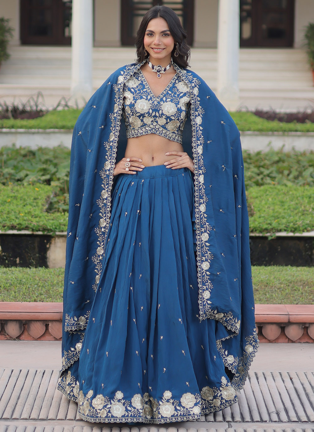 Make an entrance with this trendy teal Vichitra silk lehenga choli decorated with shining sequins and artistic threadwork. The outfit blends modern glamour with traditional charm. Comes with matching choli and dupatta.