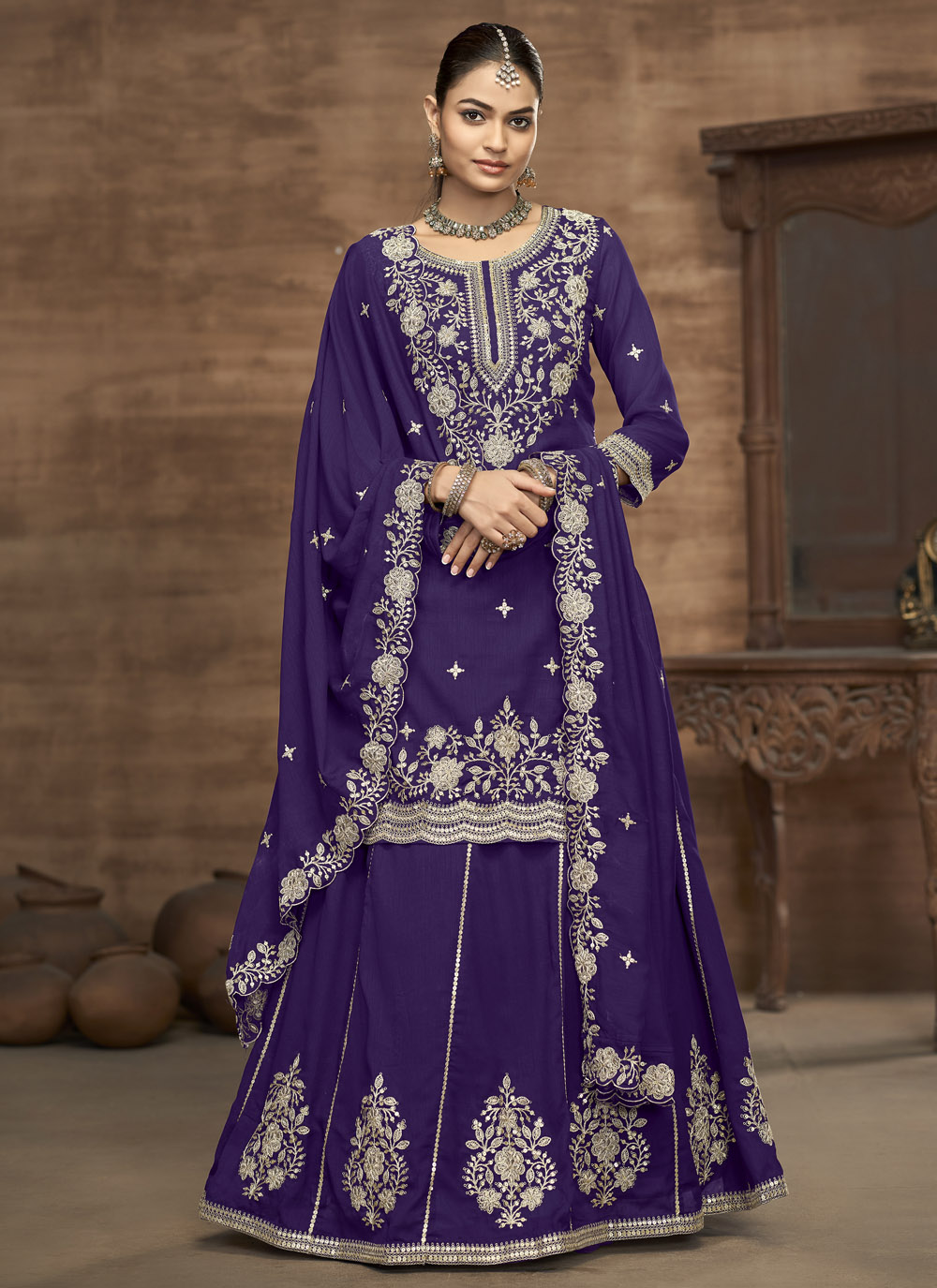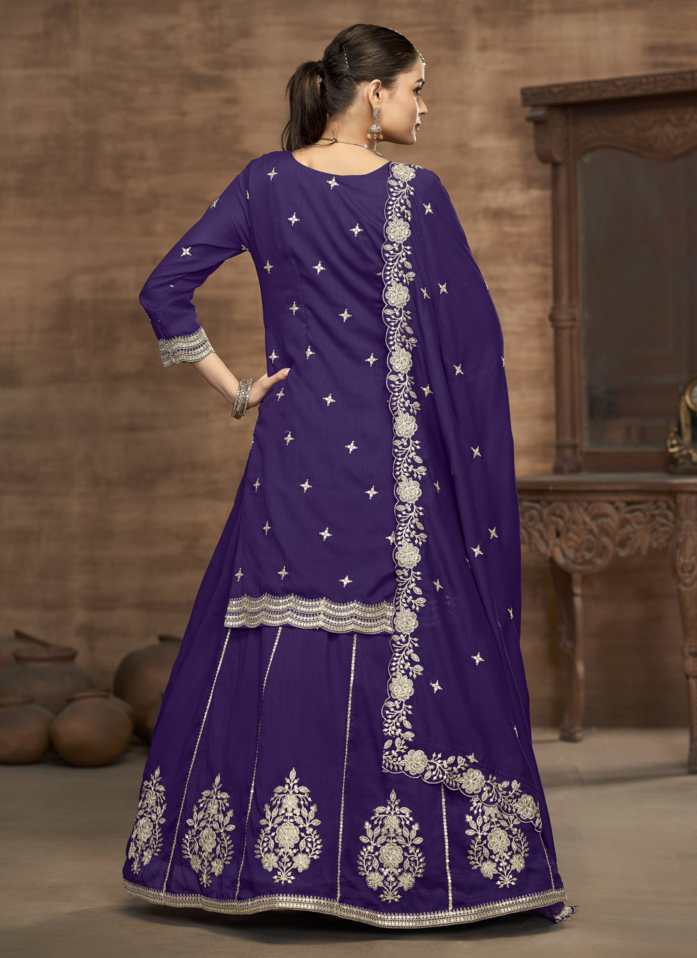 Embrace timeless elegance with this violet Vichitra silk readymade lehenga choli adorned with intricate zari embroidery and shimmering sequins. Perfect for weddings, sangeet and grand festivities. Comes with matching choli and dupatta.