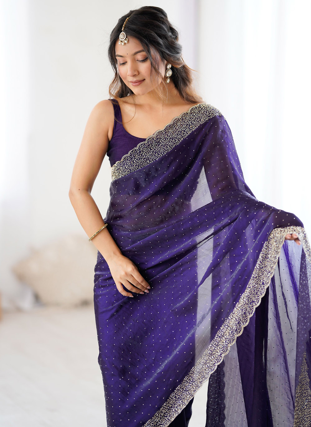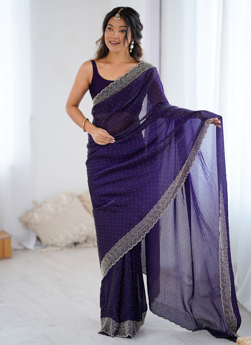 Crafted in rich violet satin, this trendy saree becomes instantly eye-catching with its detailed Zarkan hand embellishment. Each shimmering element is hand-placed, creating a subtle yet sophisticated sparkle across the saree. Comes with matching blouse.