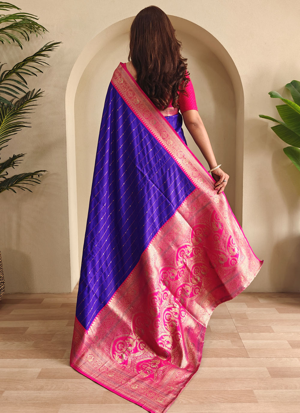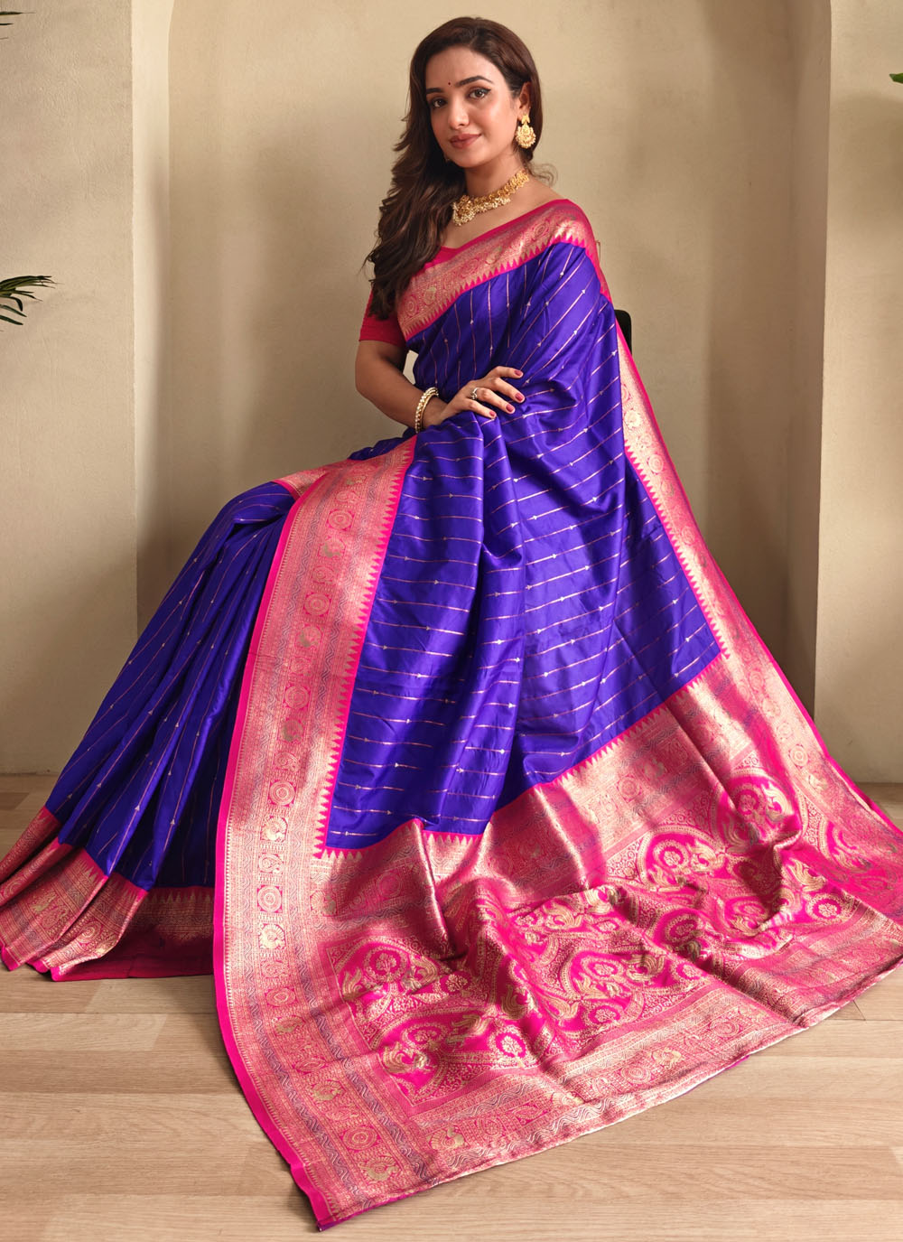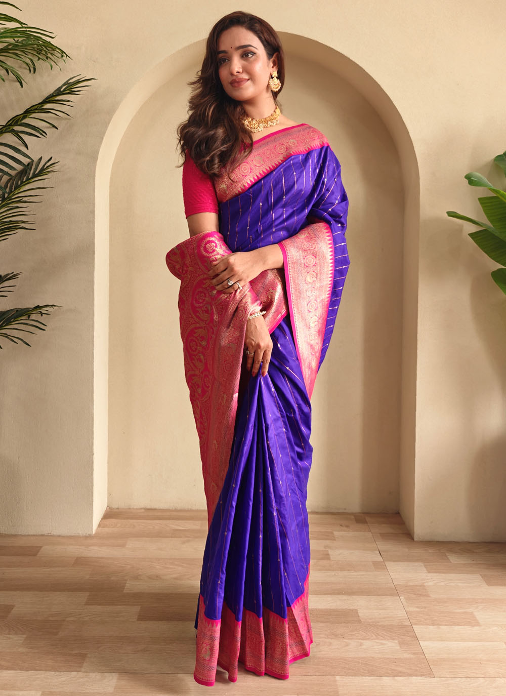 Celebrate in style with this trendy violet saree in premium silk, adorned with classic zari woven patterns. The vibrant hue and timeless craftsmanship bring out a bold yet elegant ethnic appeal ideal for festive dressing. Comes with matching blouse.