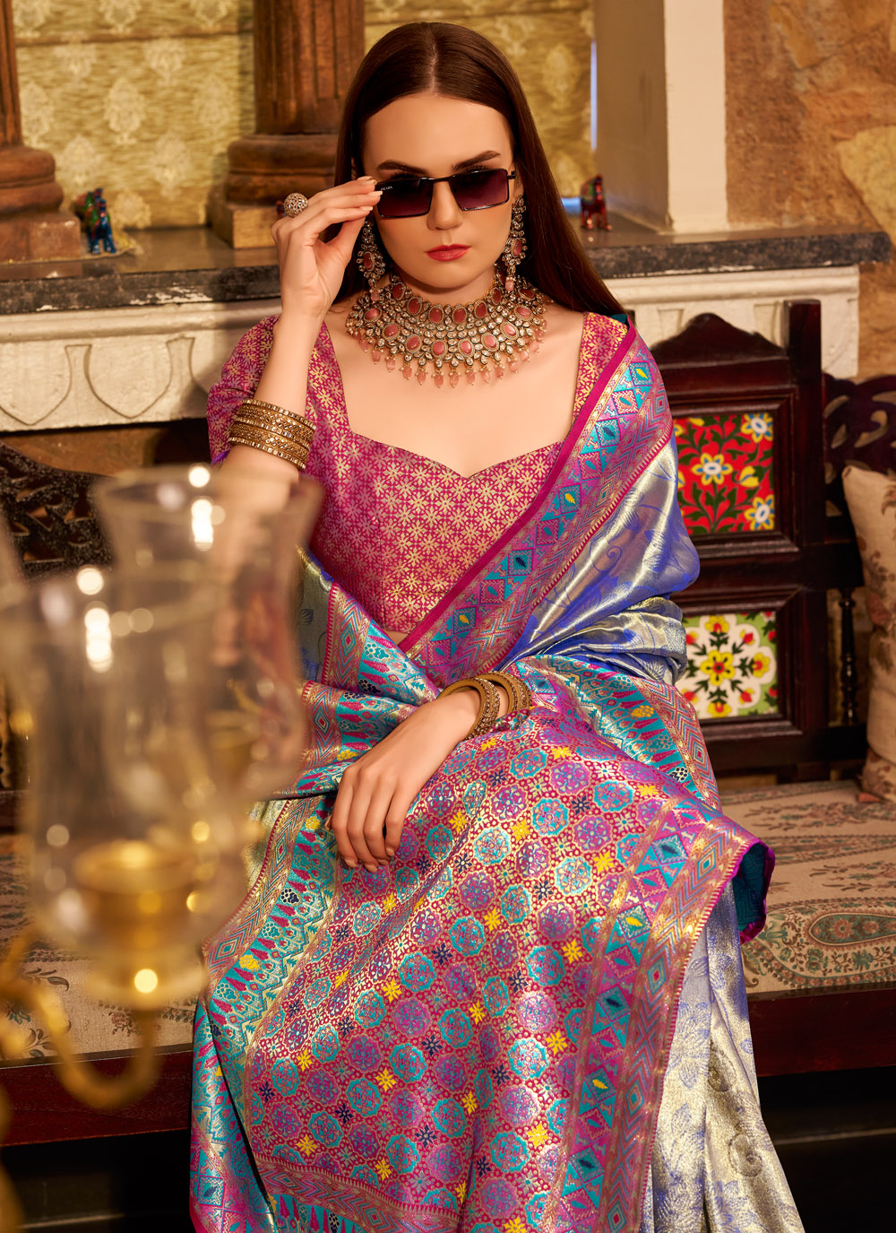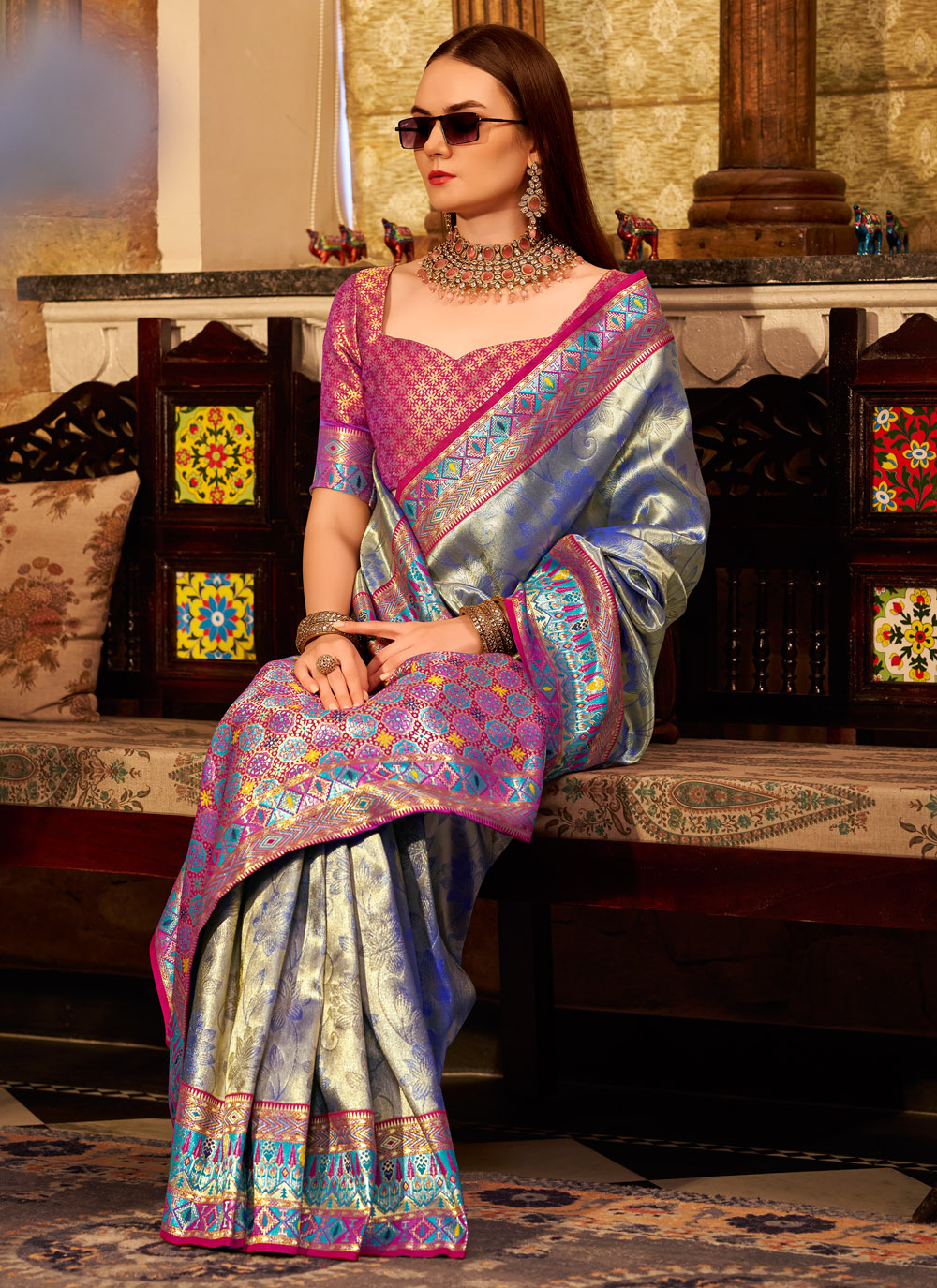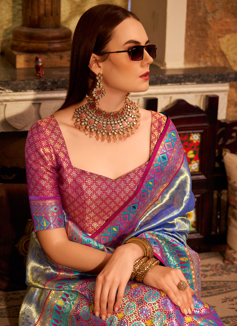 This violet tissue silk saree features intricate zari weaving that radiates royalty. The richness of the fabric combined with the delicate detailing elevates your look instantly. ideal for wedding ceremonies and high-profile events. Comes with matching blouse.