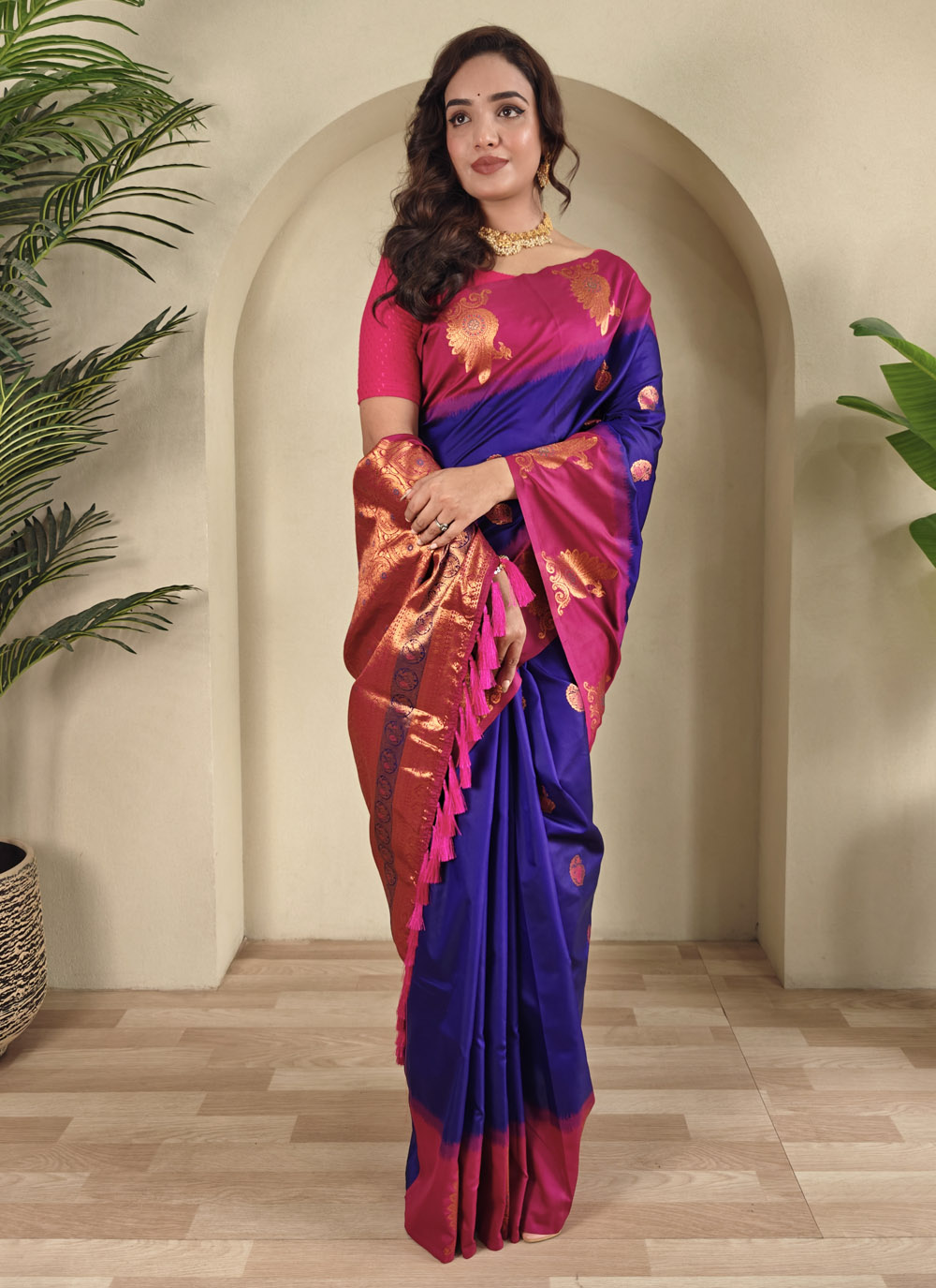 Grace meets tradition in this majestic violet silk saree with rich zari weaving. Its royal hue and intricate patterns make it a timeless choice for traditional occasions. Ideal for weddings, festivals and celebrations that demand elegance. Comes with matching blouse.