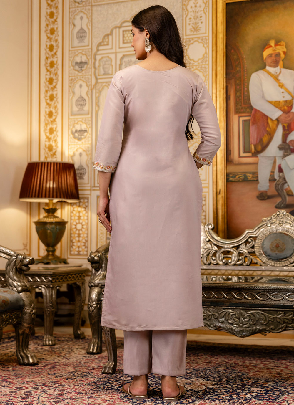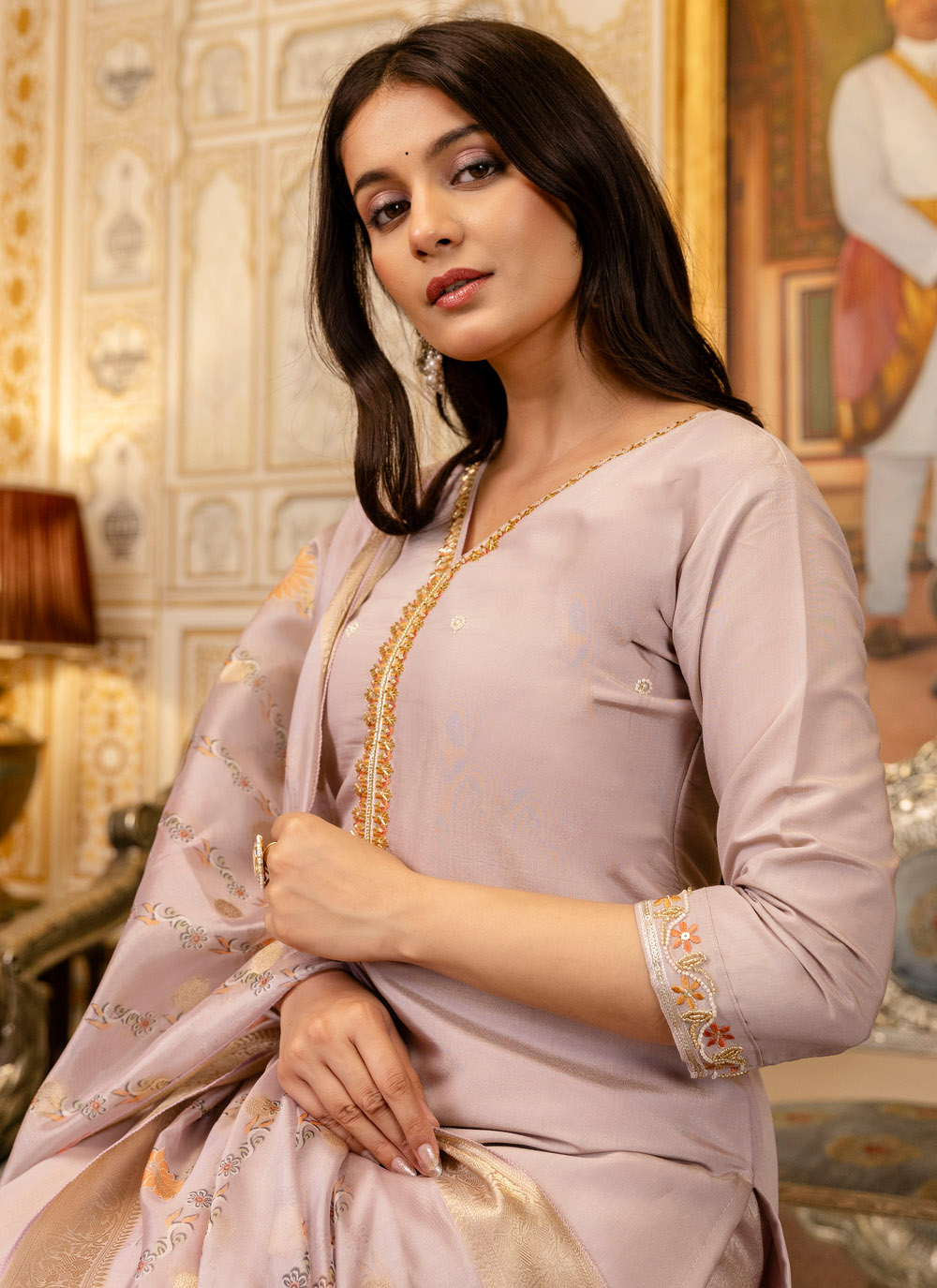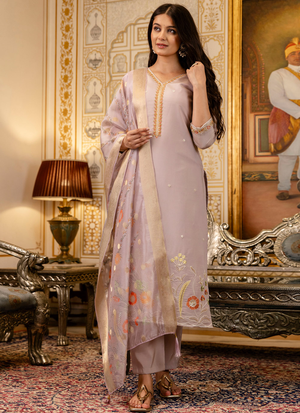 This readymade salwar suit in lavender features intricate embroidery that enhances its sophisticated appeal. The viscose fabric adds softness, and the pant-style bottom gives it a sleek and polished ceremonial-ready vibe. Comes with matching bottom and dupatta.