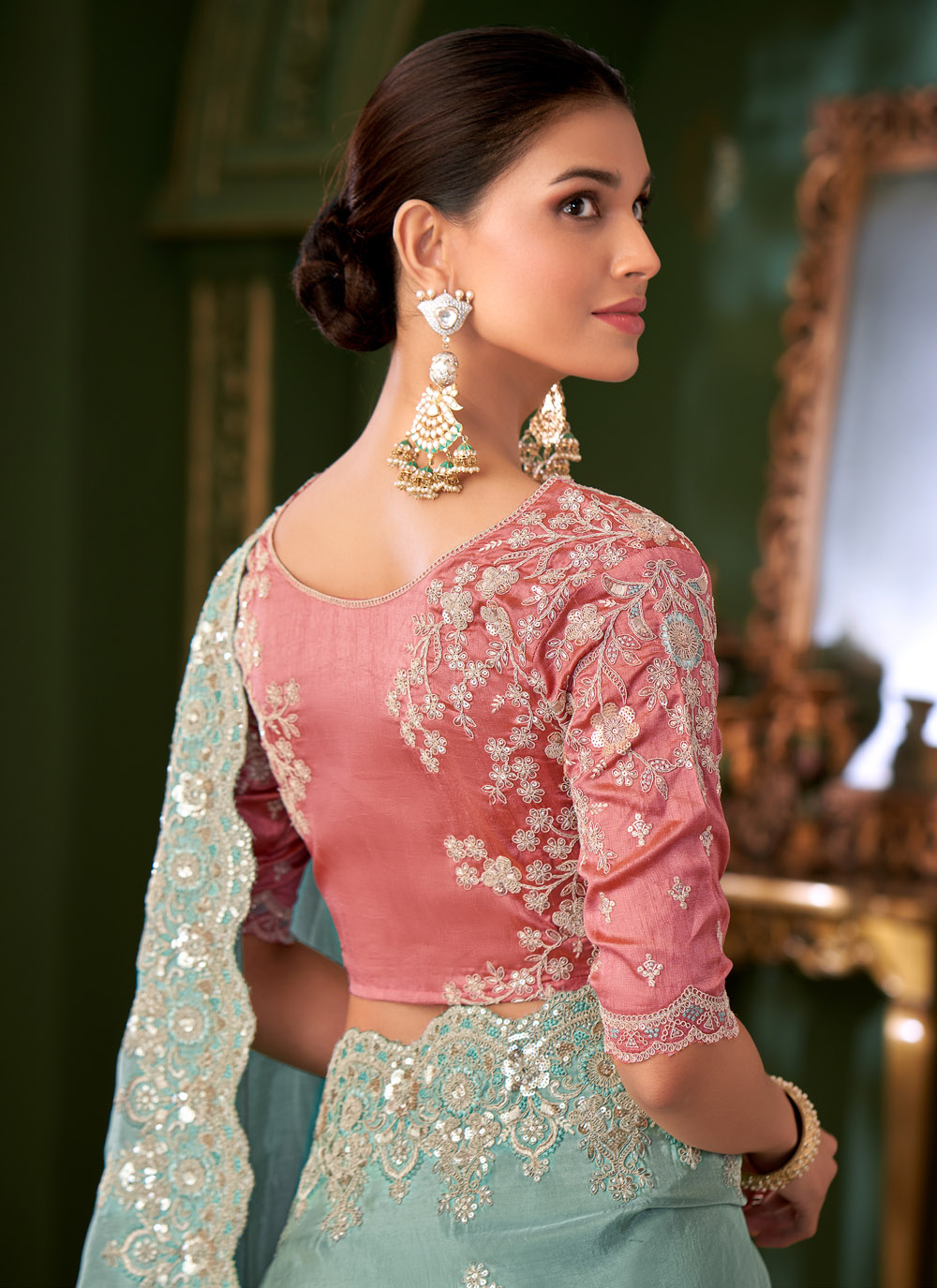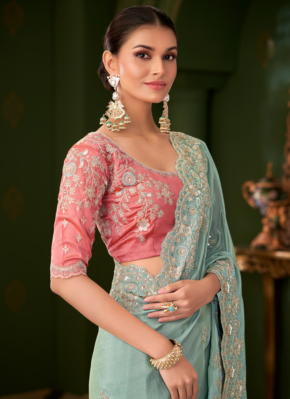 This sea green viscose georgette silk saree brings a calm and elegant charm to every special moment. The fabric drapes softly, offering a comfortable feel and graceful movement. The embroidery adds delicate detailing that enhances the classic look. Comes with matching blouse.
