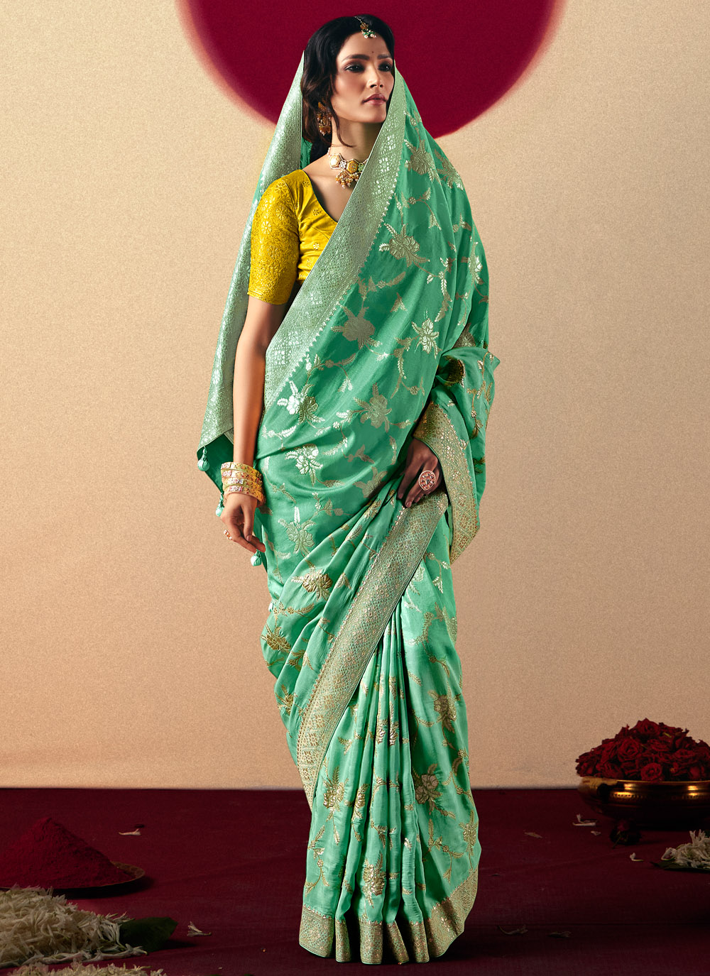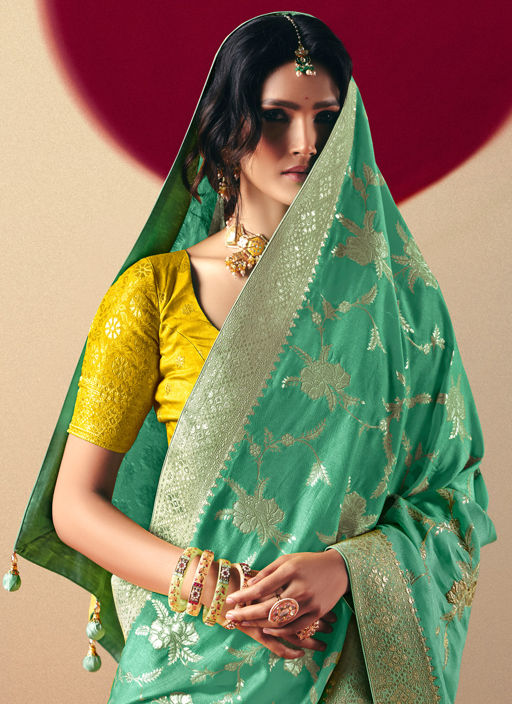 Step into sophistication with this contemporary sea green saree in viscose fabric, adorned with delicate weaving details. Its subtle charm and rich texture make it a versatile pick for both day and evening events. Comes with matching blouse.