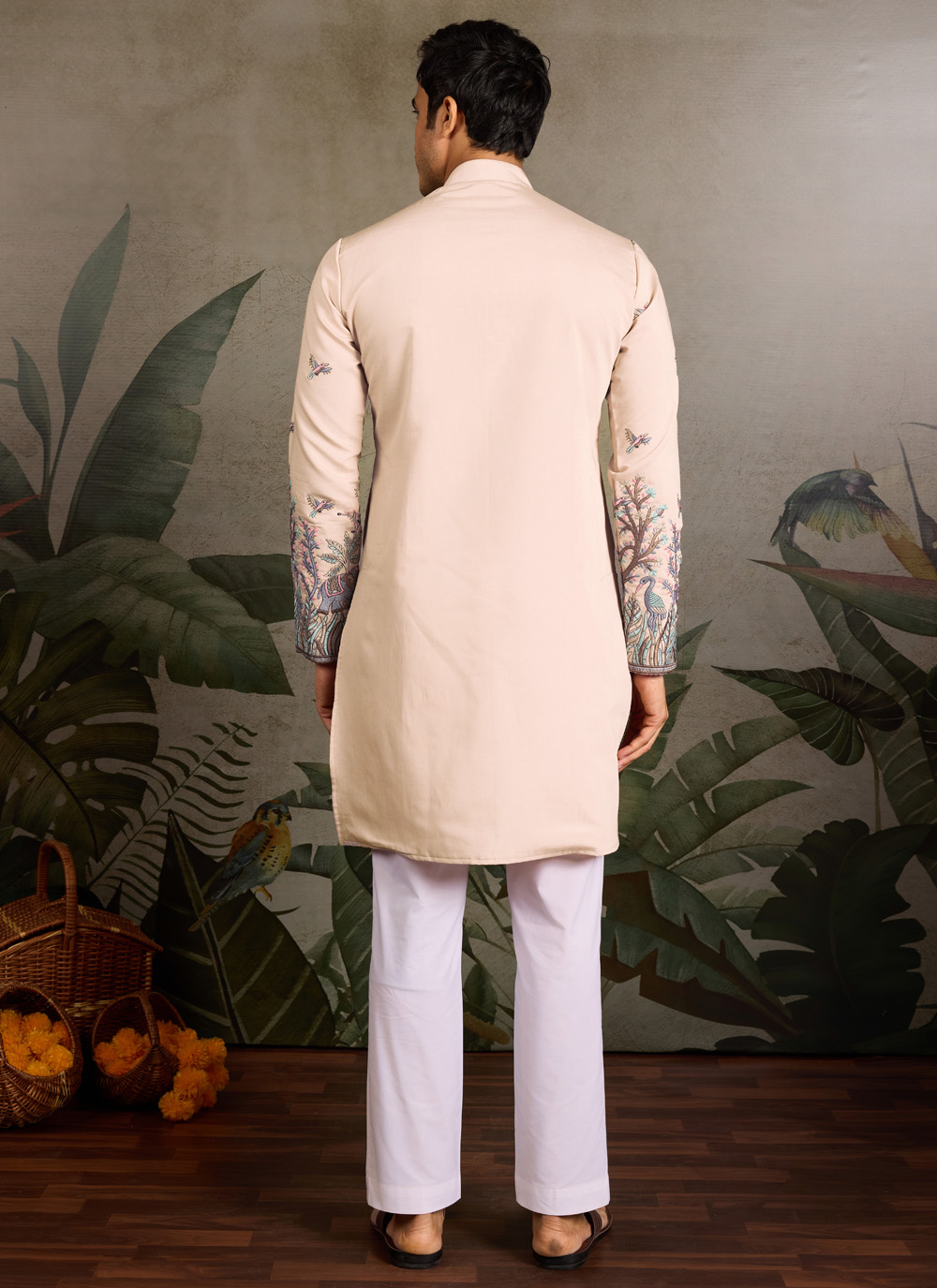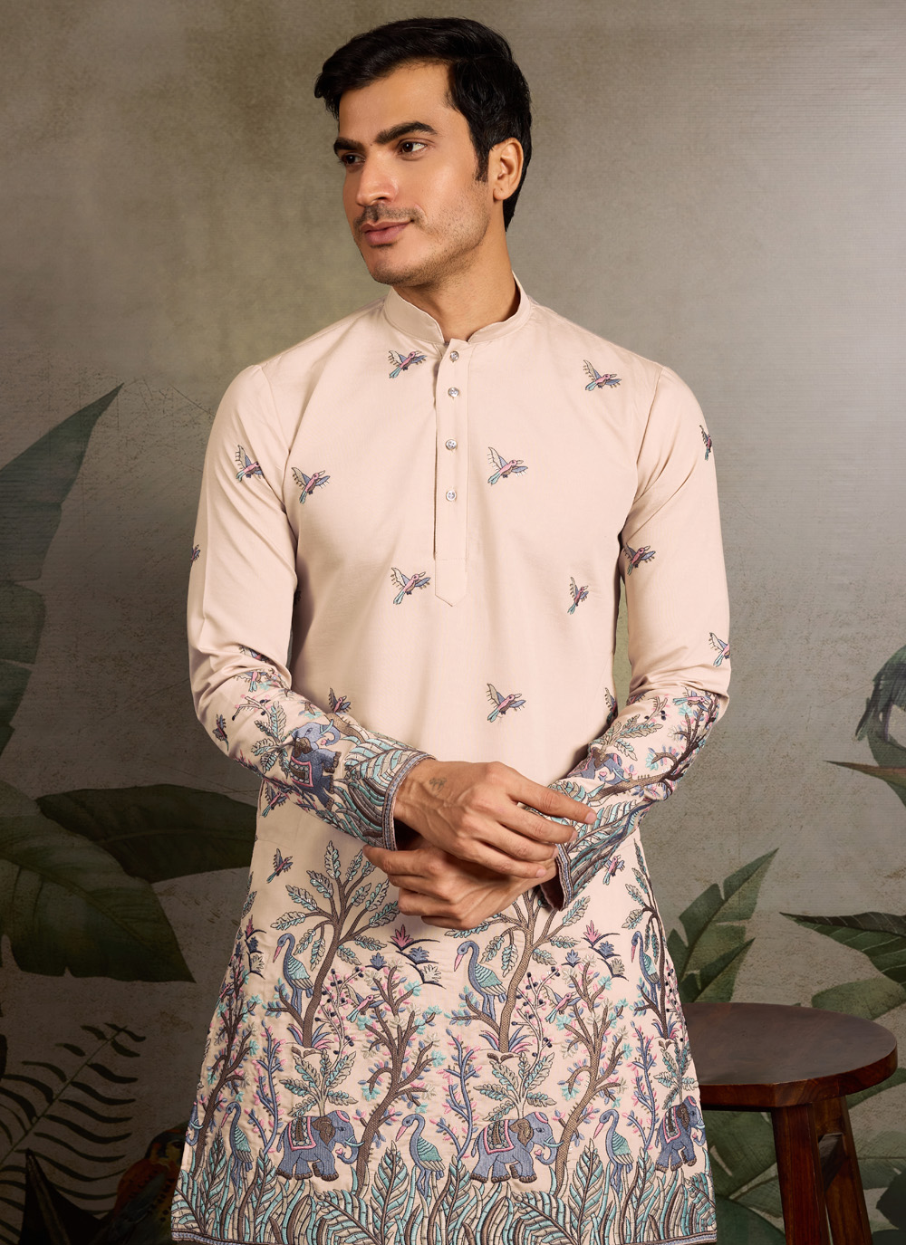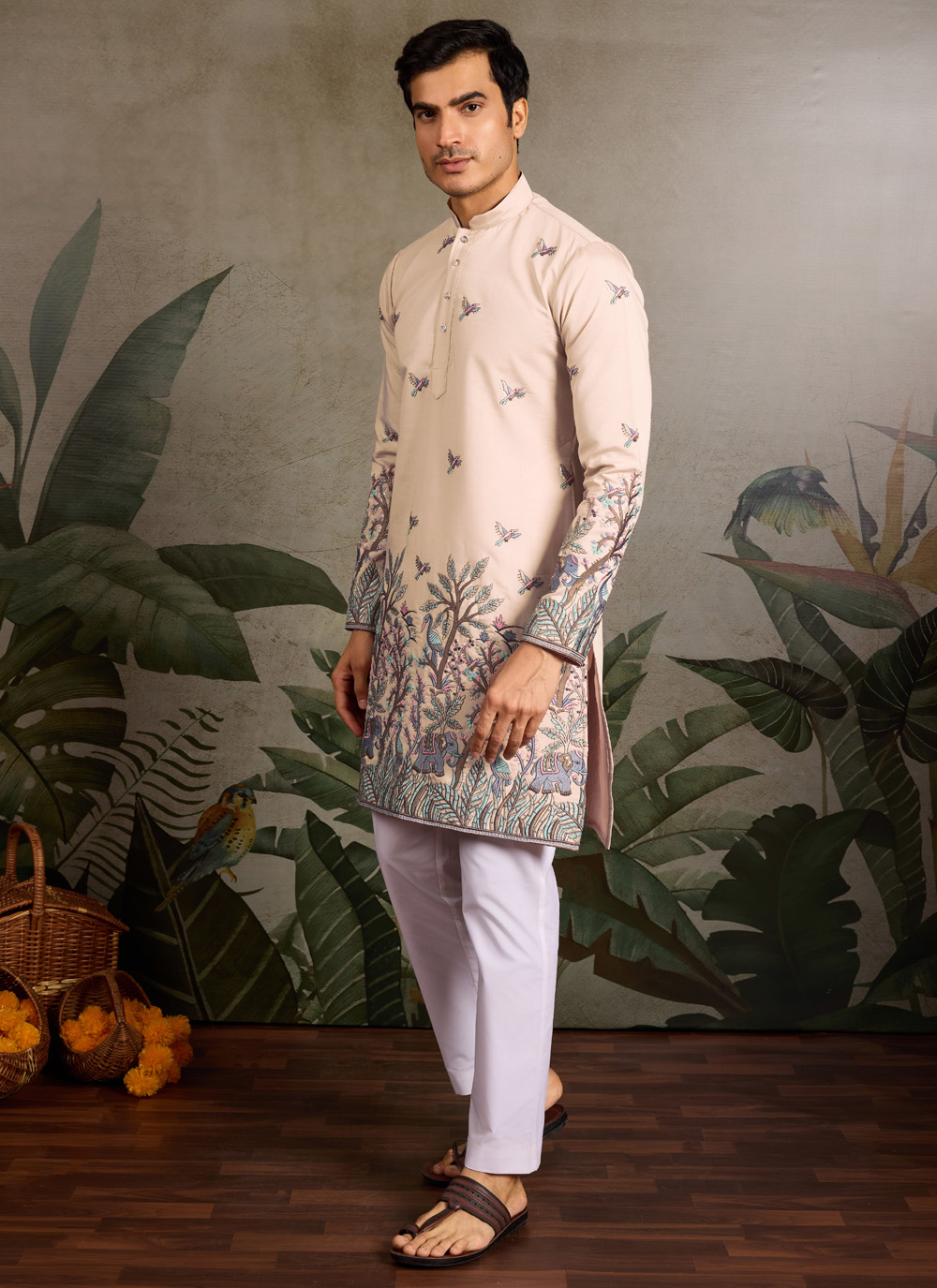 Crafted from high-quality viscose silk, this embroidered beige kurta is designed to offer both comfort and sophistication. The shimmering sequin detailing adds just the right touch of festive sparkle.