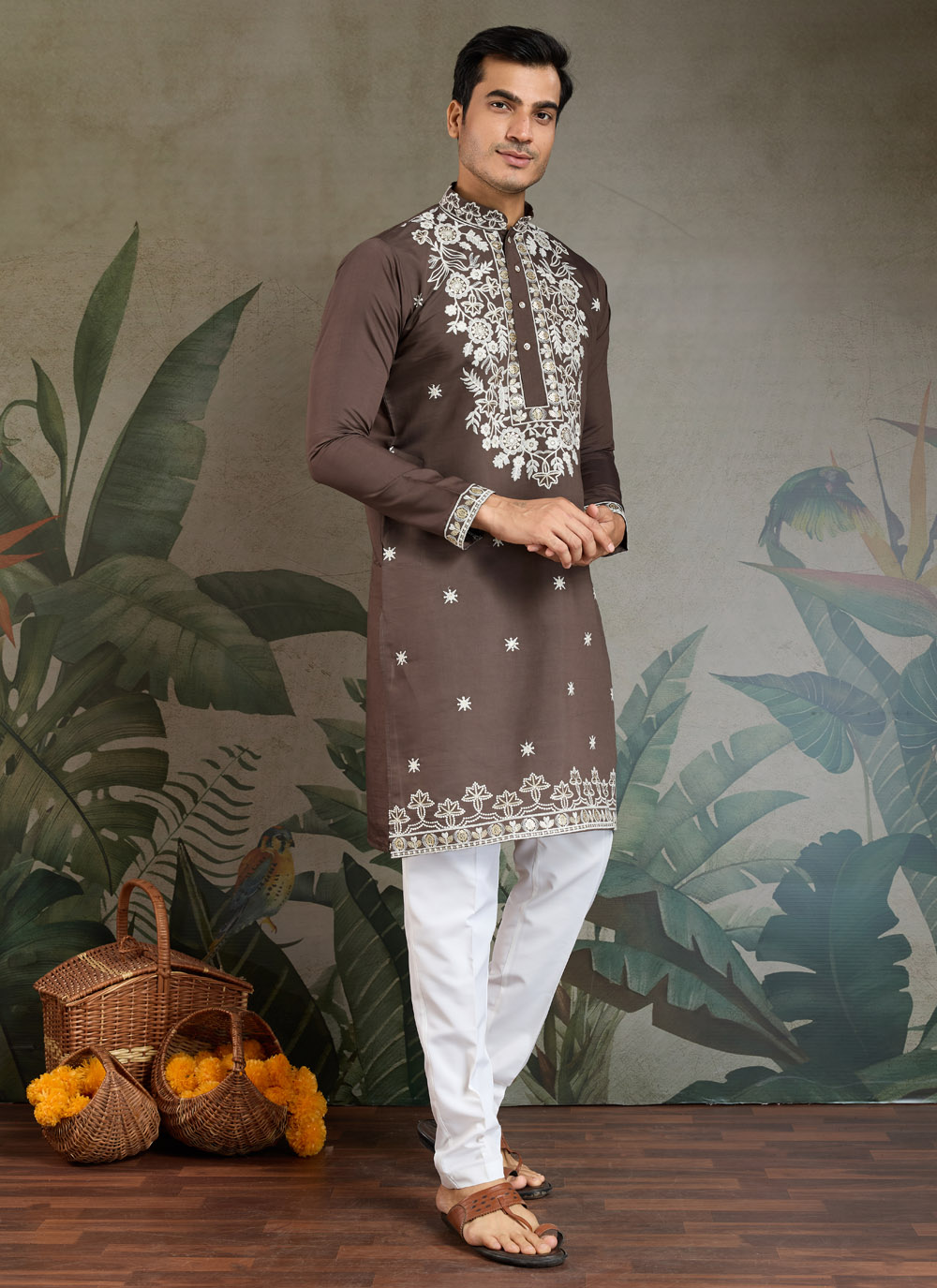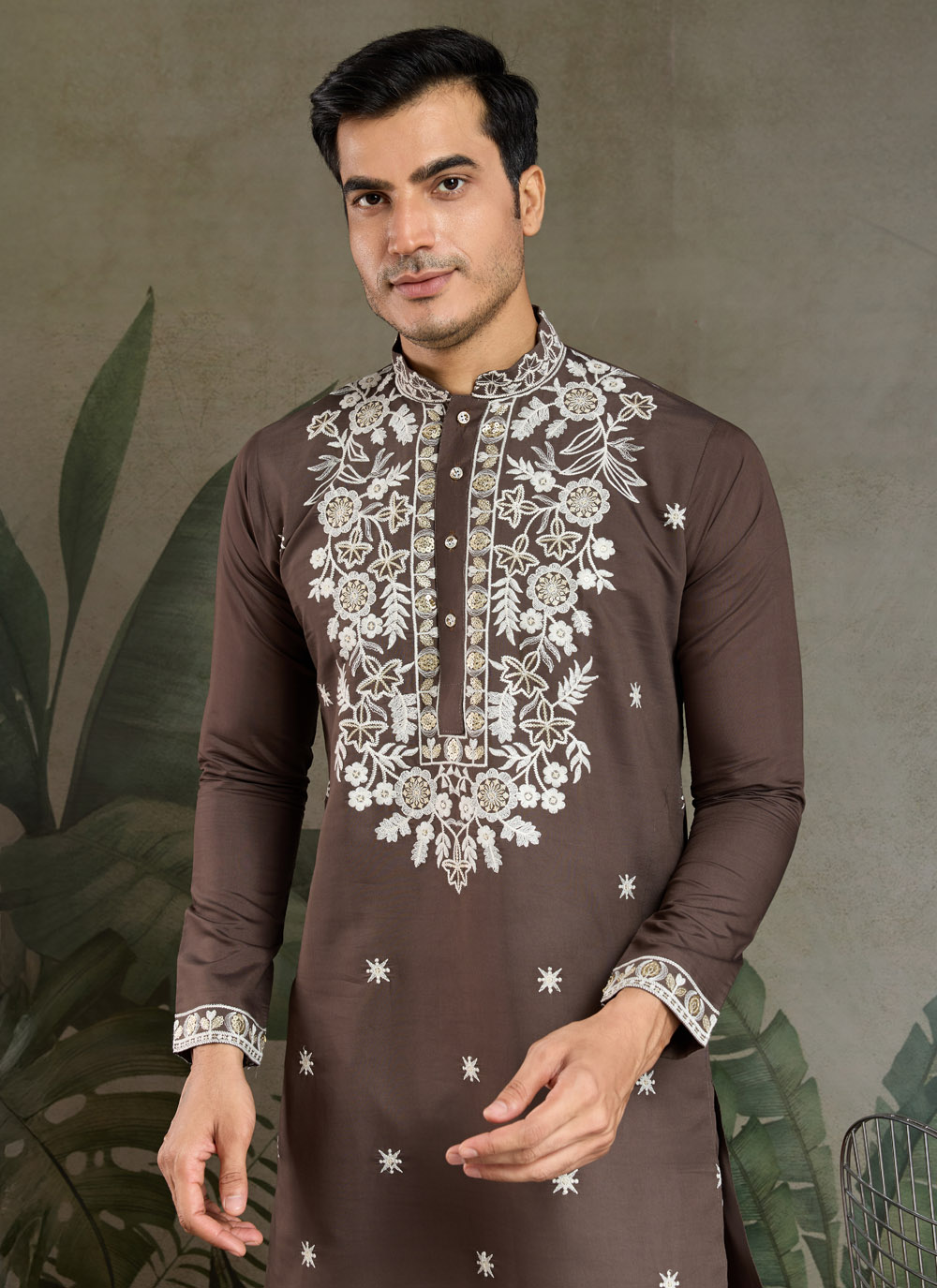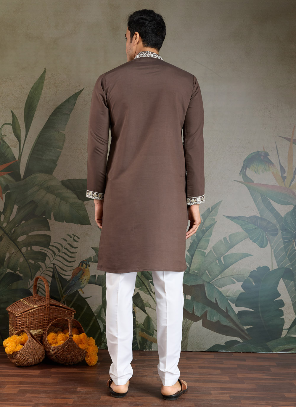 Crafted from premium viscose silk, this brown kurta is detailed with fine thread embroidery that adds subtle sophistication. Ideal for festive wear or family functions, it delivers a classic ethnic style with modern ease.