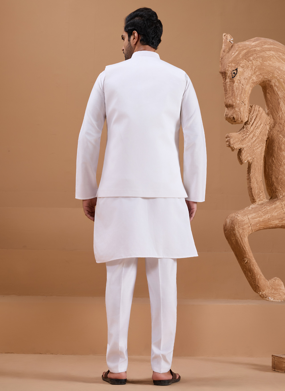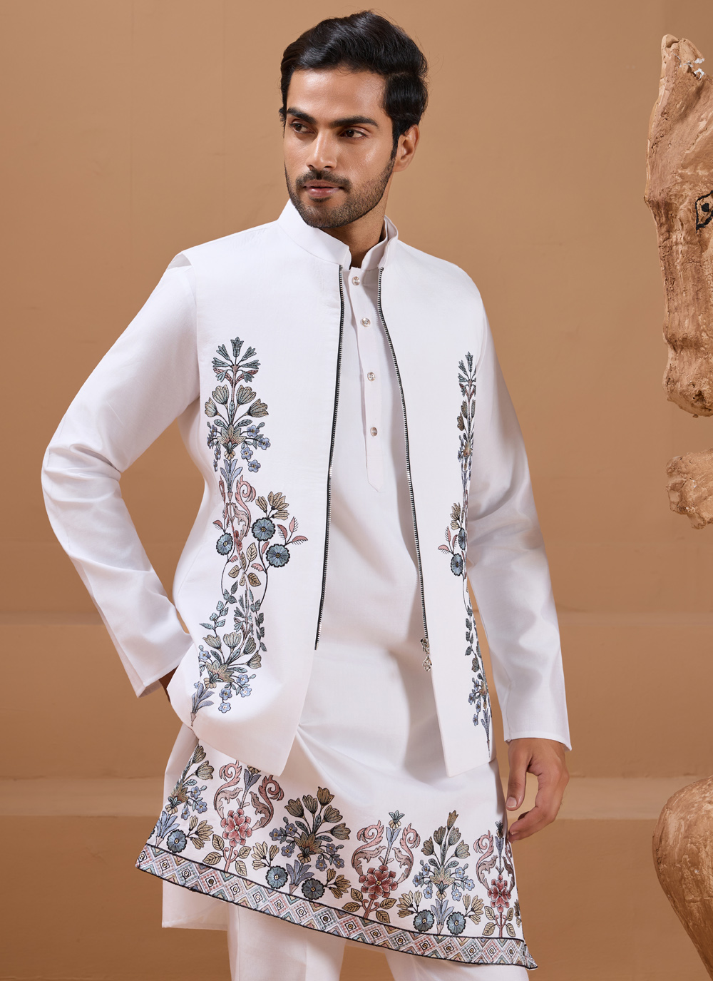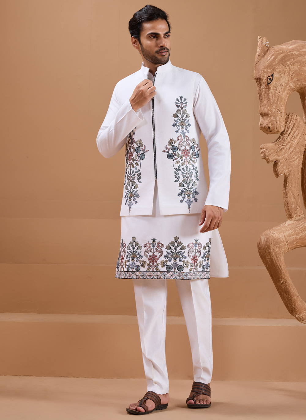 Enhance your traditional look with this white viscose silk kurta pajama set featuring graceful sequin embroidery and a coordinated jacket. Perfect for wedding events, festive rituals or special family gatherings.