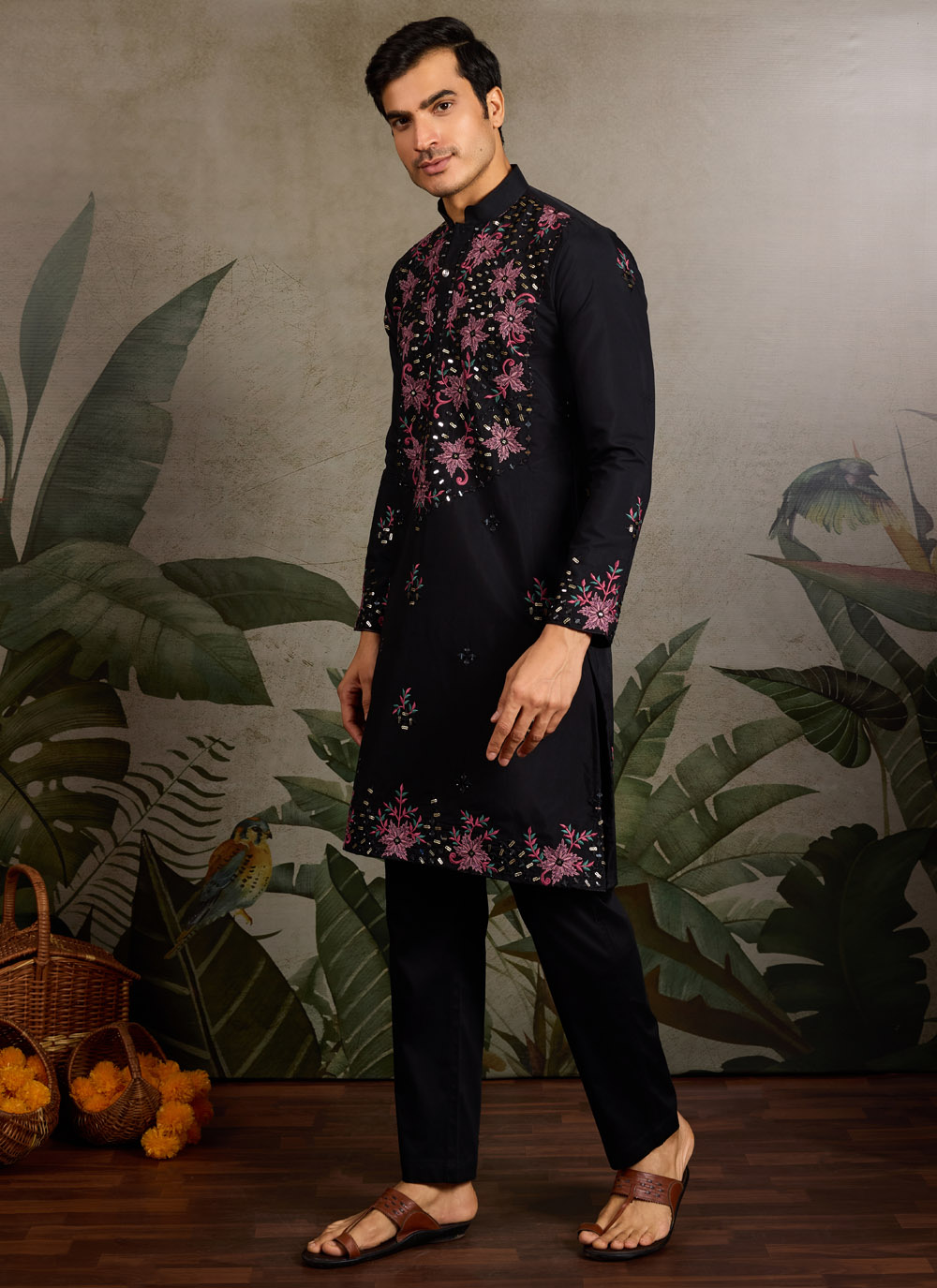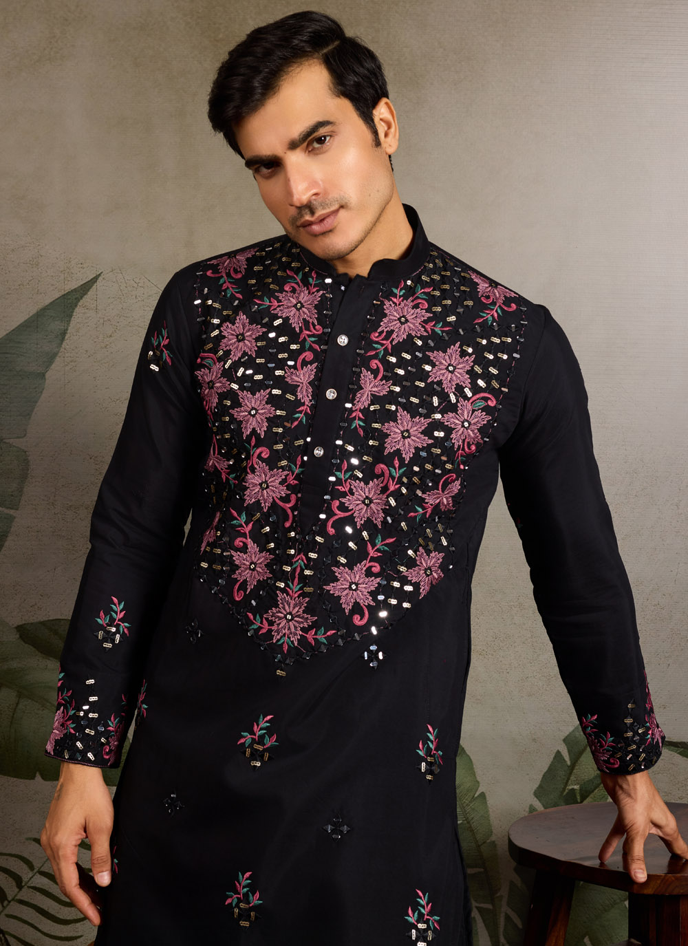 This black viscose silk kurta redefines elegance with intricate mirror work, sparkling sequins, and fine thread embroidery. The glossy silk base adds depth to the craftsmanship, making it a refined pick for statement ethnic wear.