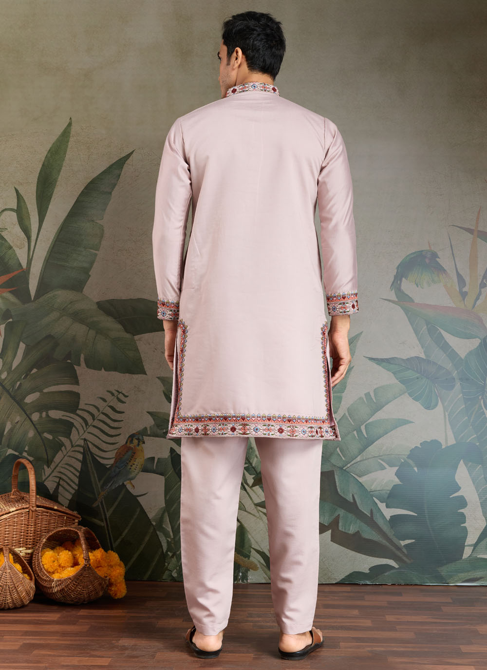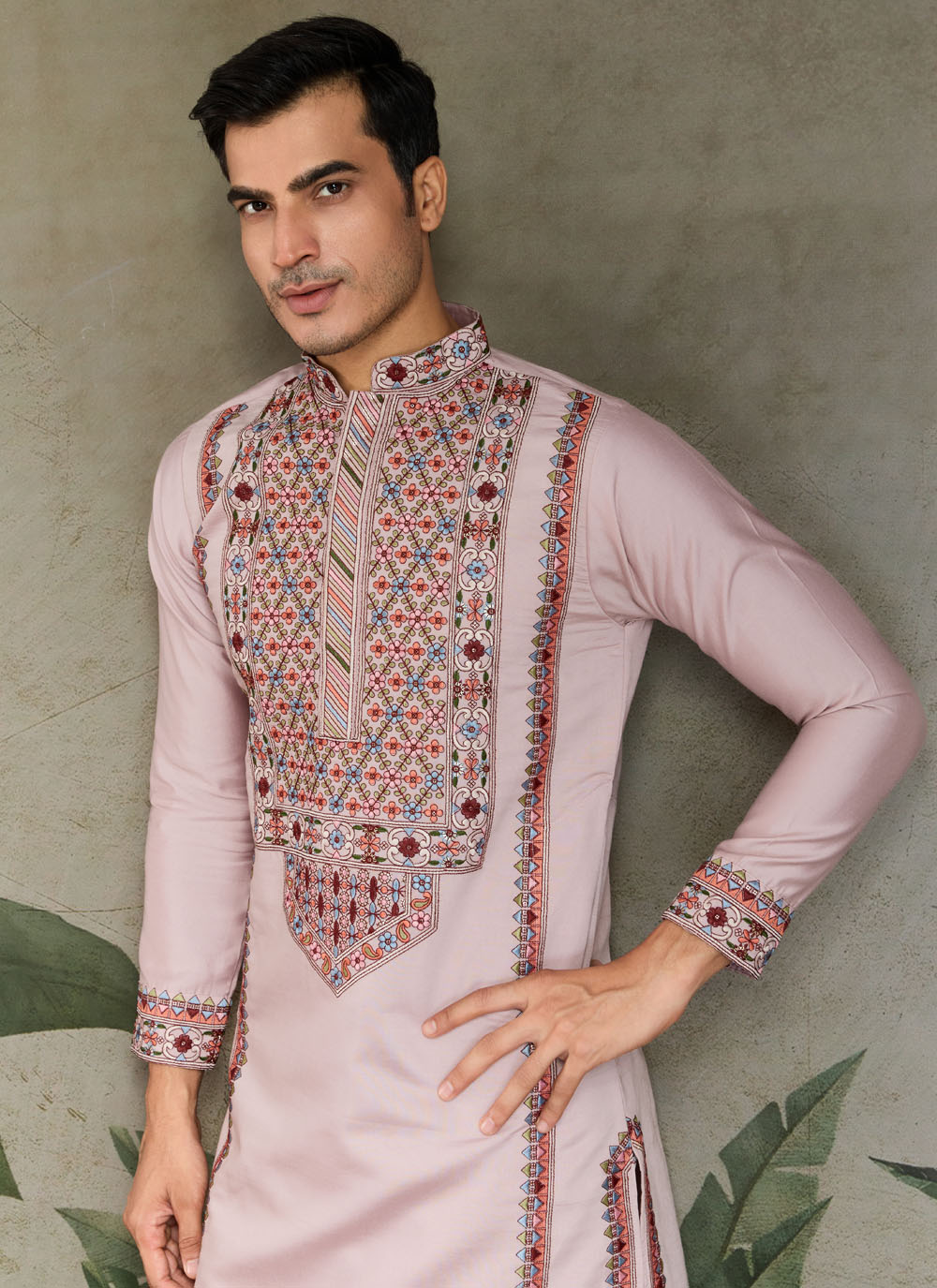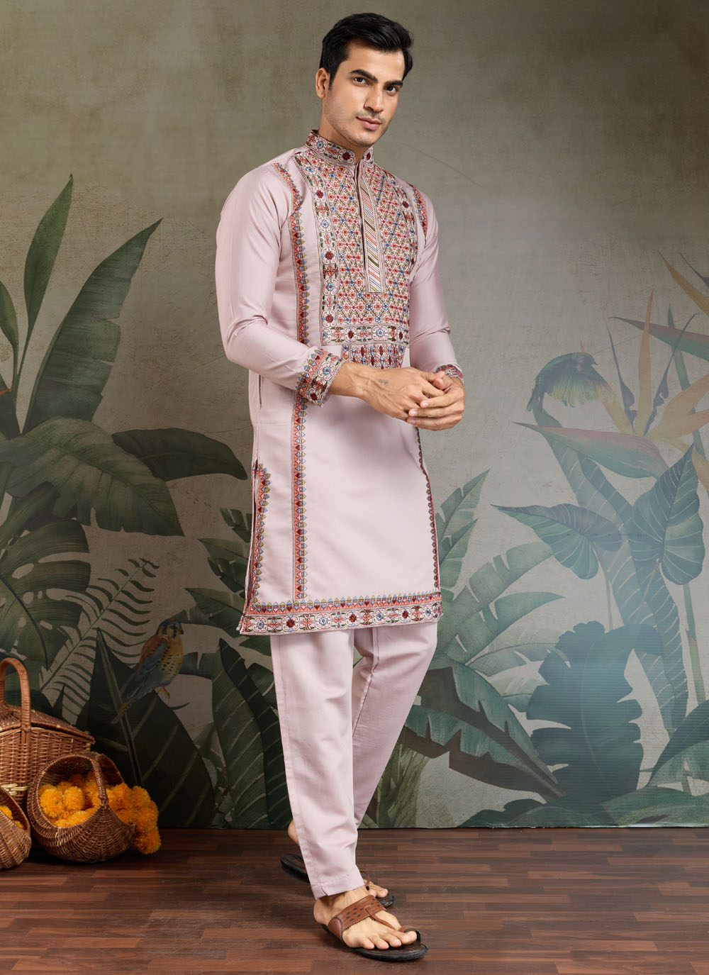 Stand out in graceful style with this Pink Viscose Silk Kurta Pyjama adorned with Thread Embroidery. The fresh pink hue exudes vibrance and festivity, while the fine embroidery showcases intricate craftsmanship. Ideal for festive events, weddings and cultural occasions.