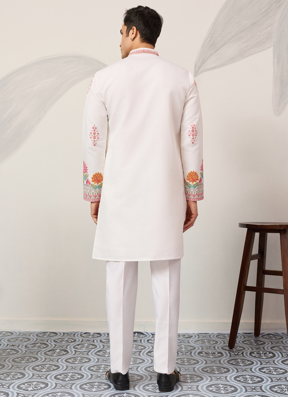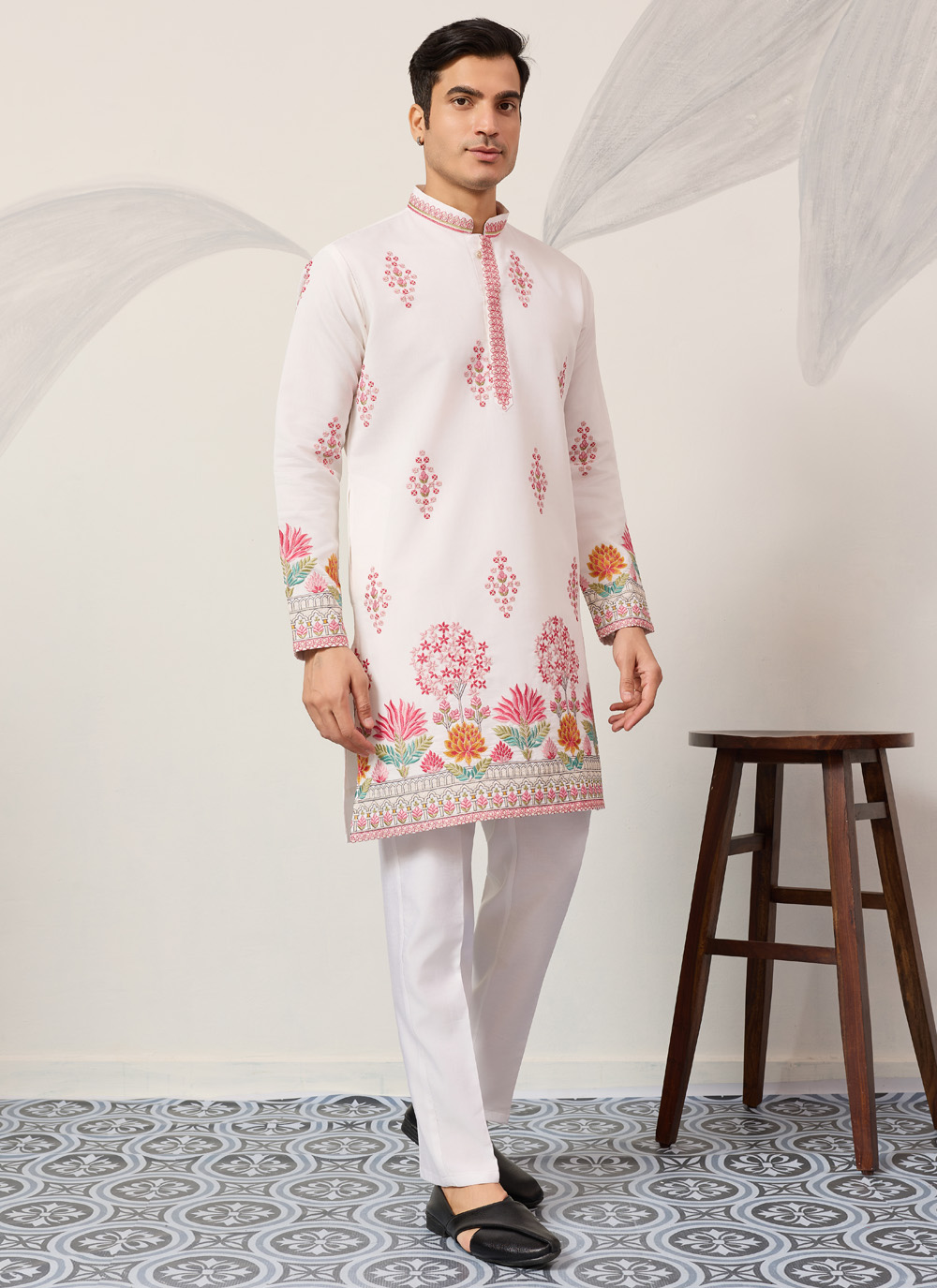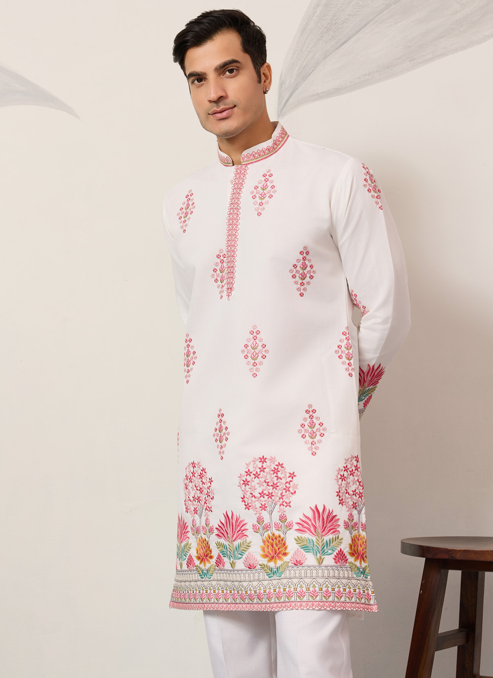 Shop this premium white viscose silk kurta created for a graceful and polished ethnic look. The fine thread embroidery adds elegance while keeping the design clean and classy.