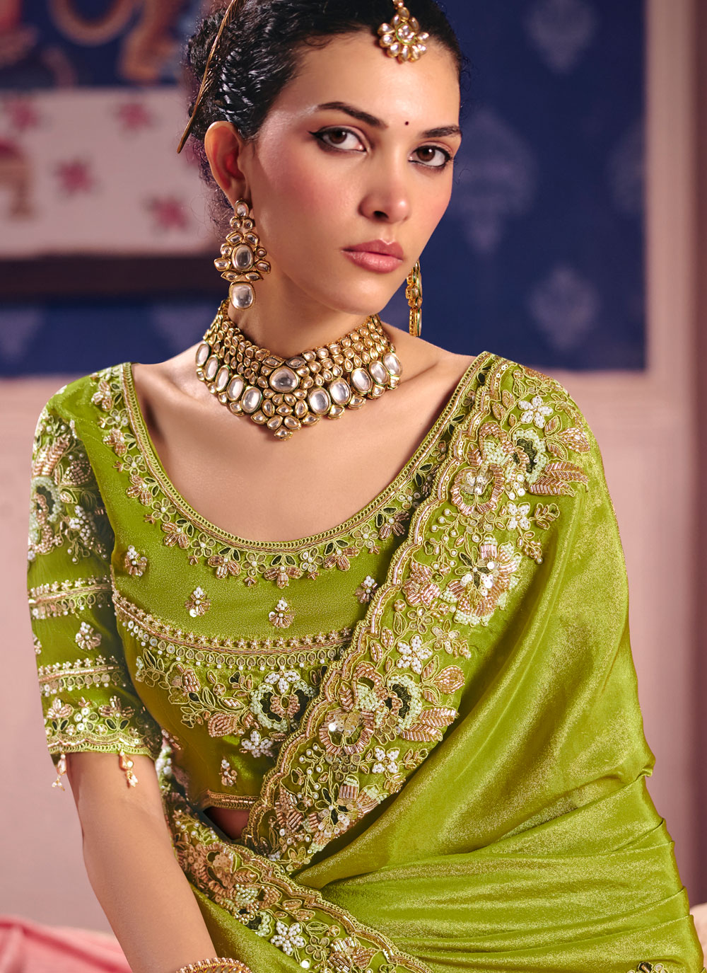 Viscose Tissue Silk Green Beads Embroidered Classic Saree presents a refined ethnic look with its graceful texture and detailed craftsmanship. The subtle sheen of tissue silk combined with delicate bead embroidery creates a sophisticated saree. Comes with matching blouse.