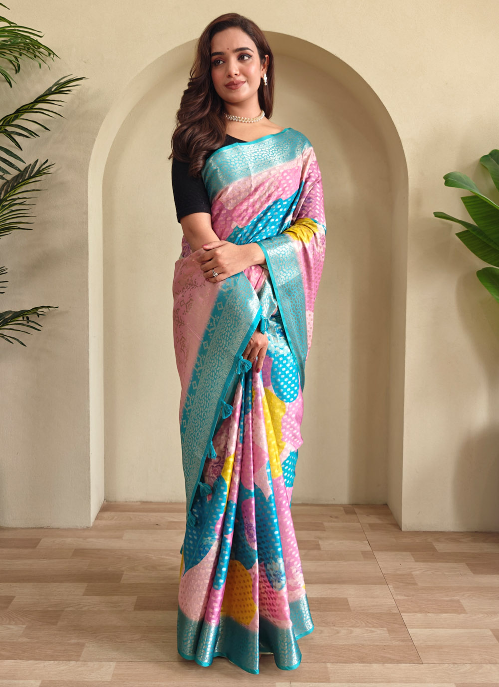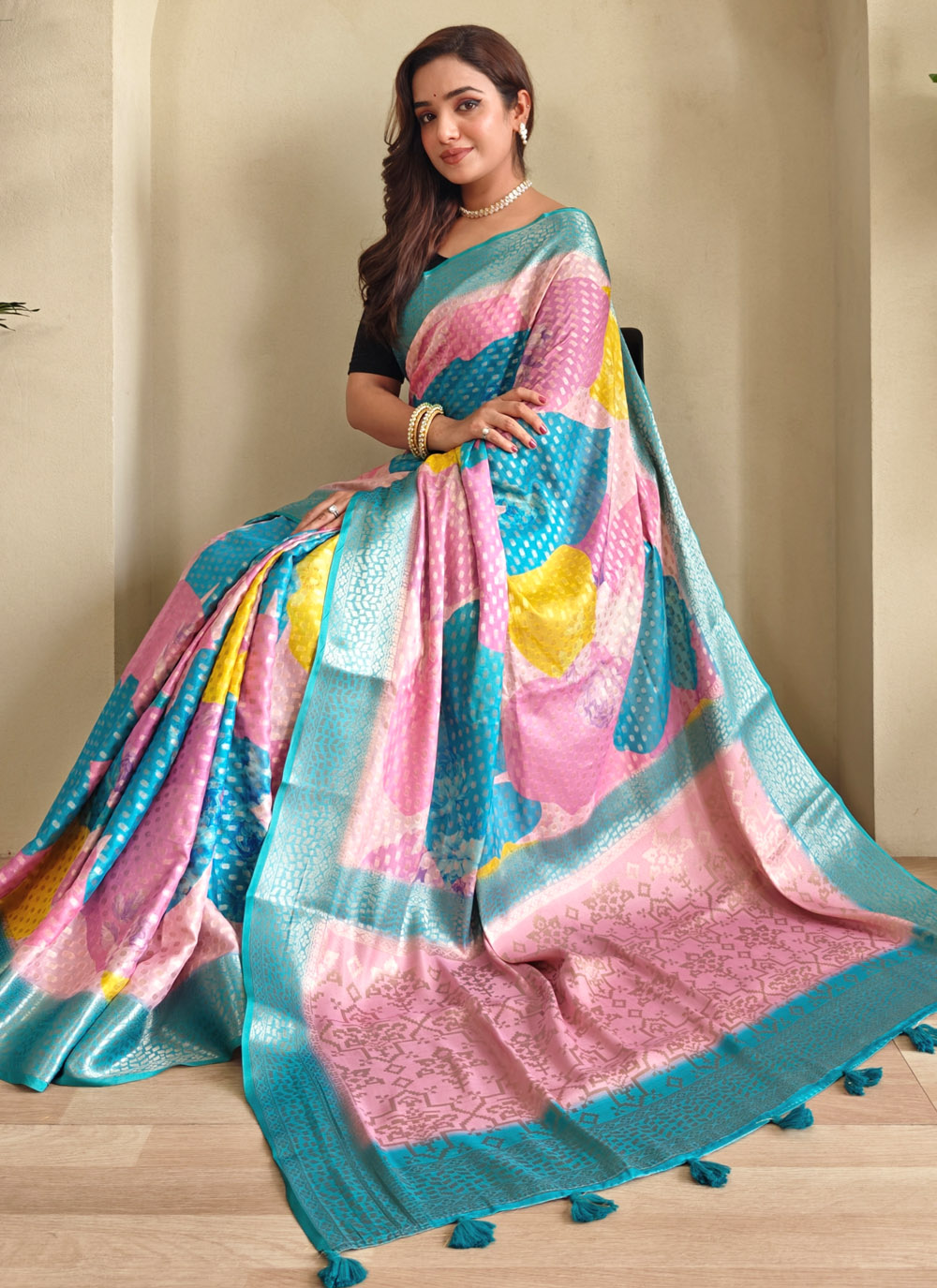 Vibrant and graceful, this trendy Georgette Saree features a mix of intricate weaving and artistic digital prints. Its flowing texture and bold hues make it a standout piece for any contemporary ethnic look. Comes with matching blouse.